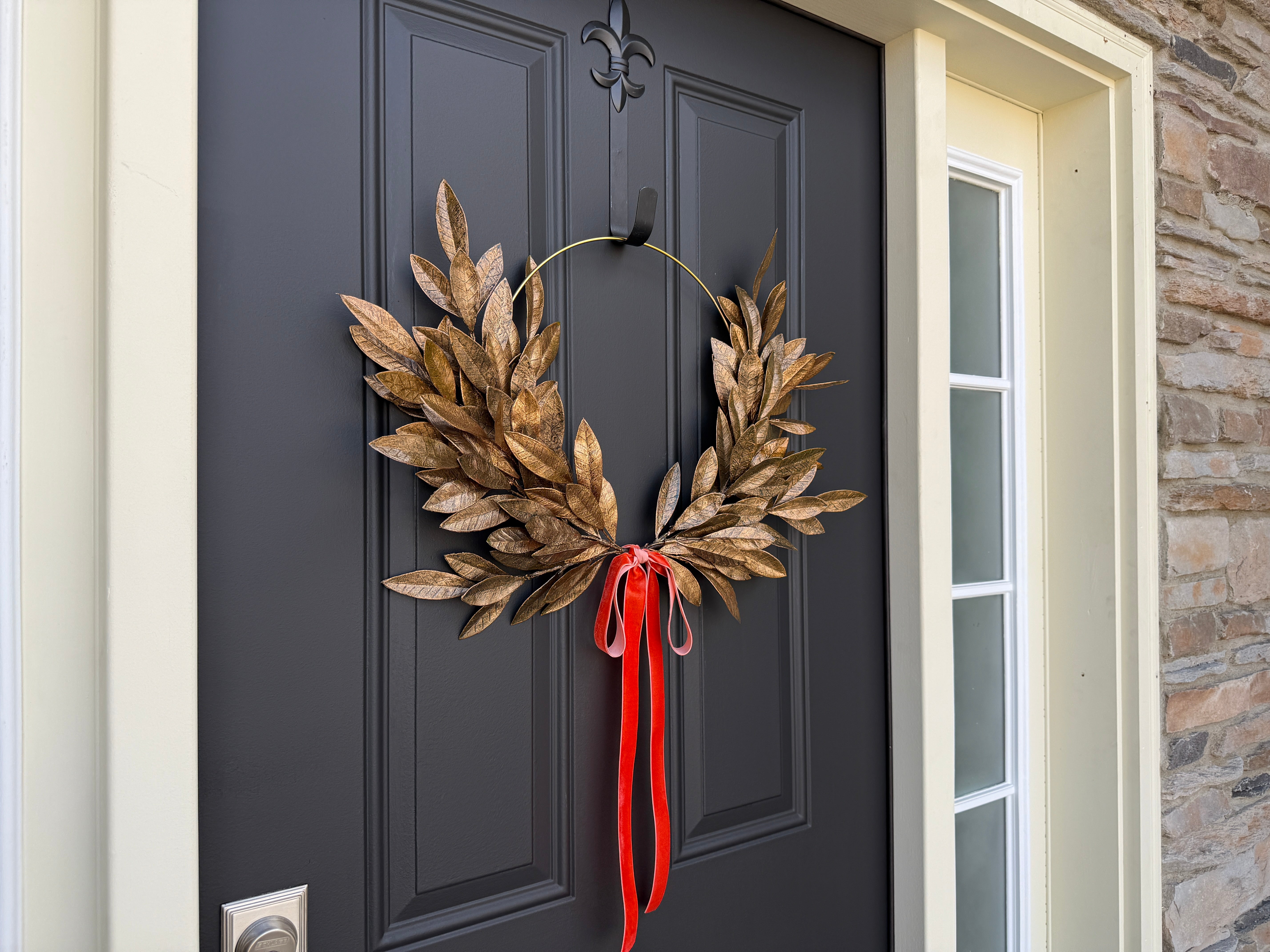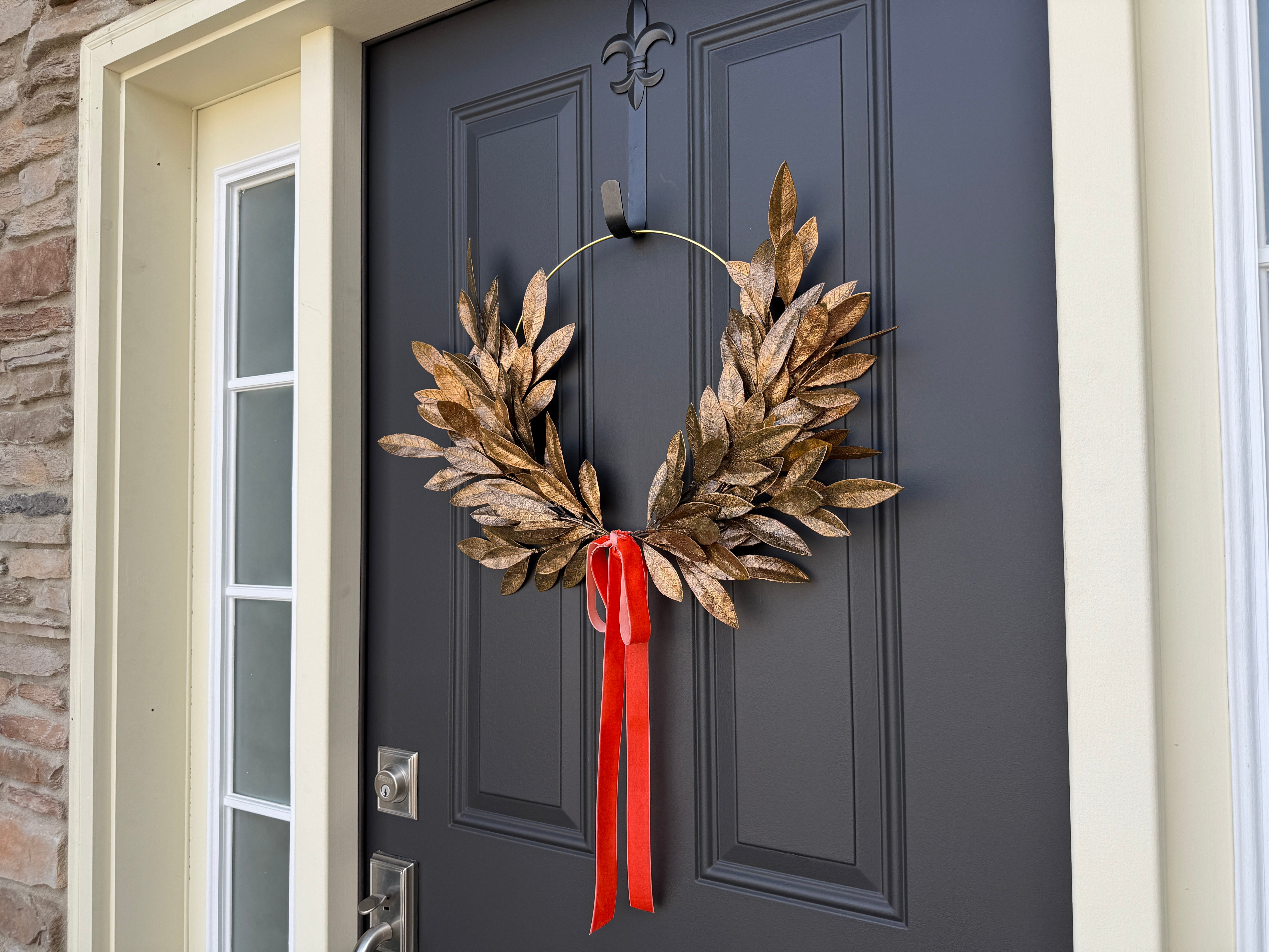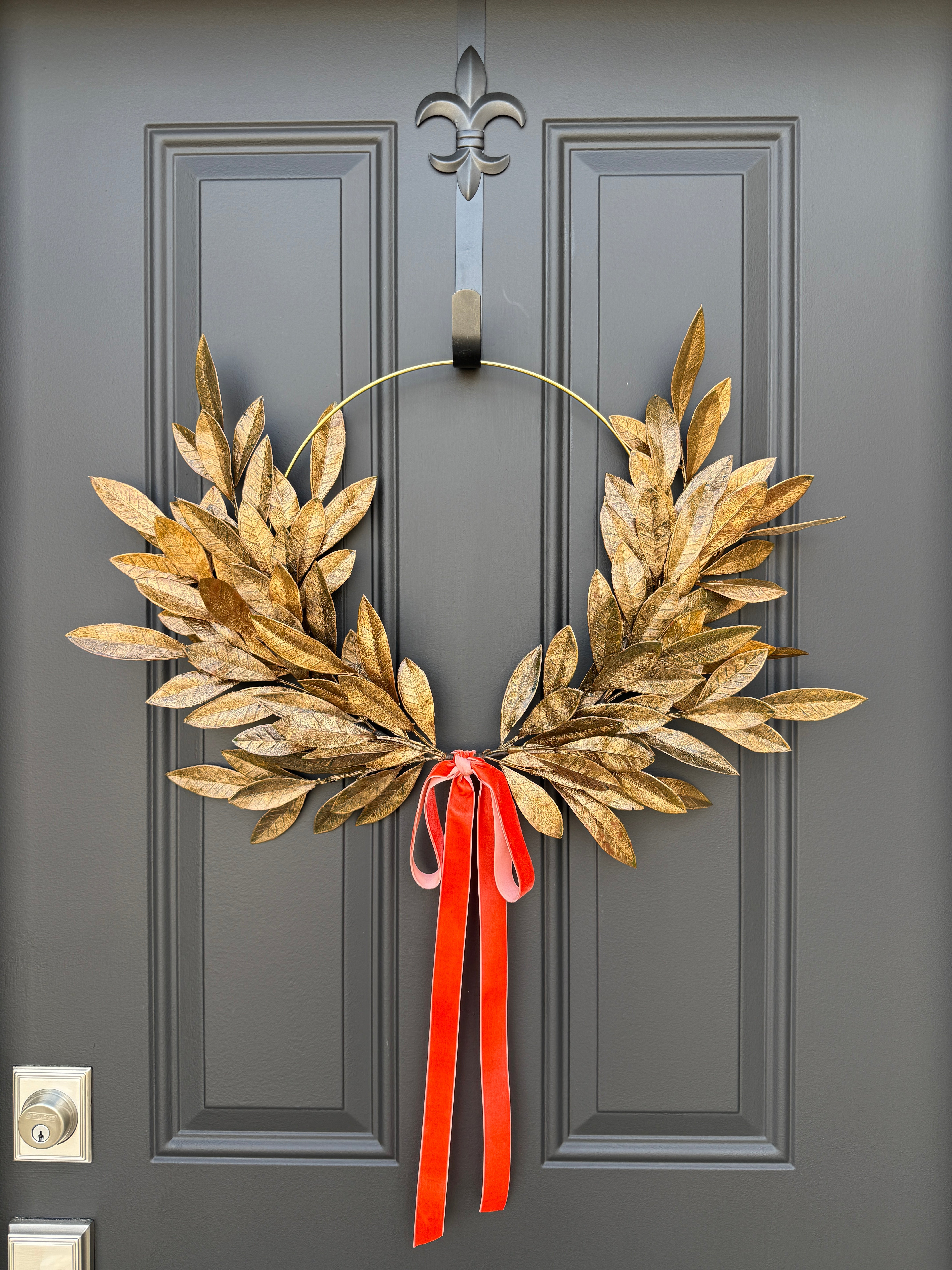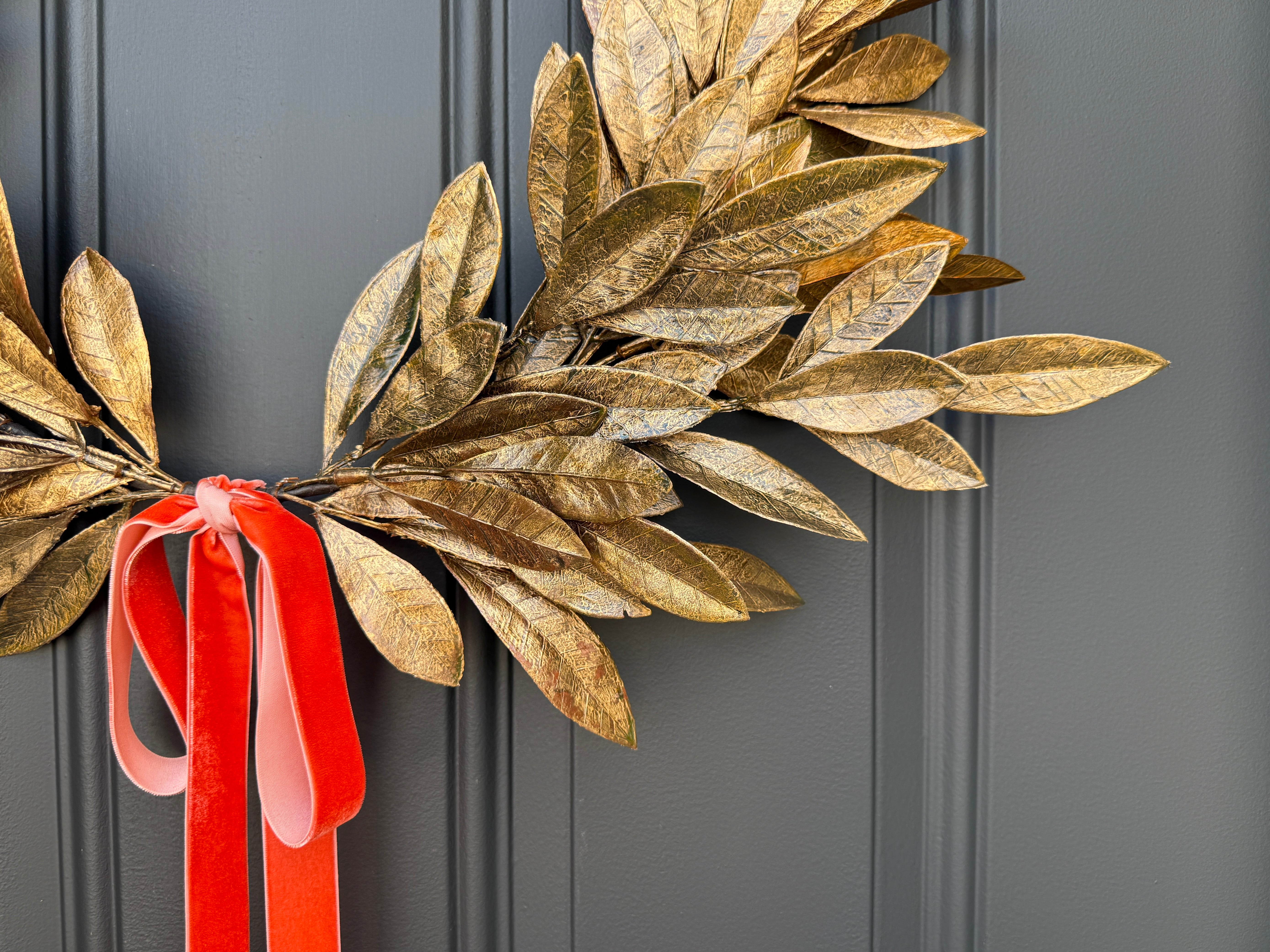 This stunning gold laurel hoop wreath brings a touch of timeless elegance to your home. Handcrafted with metallic gold laurel leaves and finished with an orange velvet bow, it offers a graceful nod to ancient wreath design with a modern twist. Its lightweight form and symmetrical style make it perfect for year-round or holiday display.