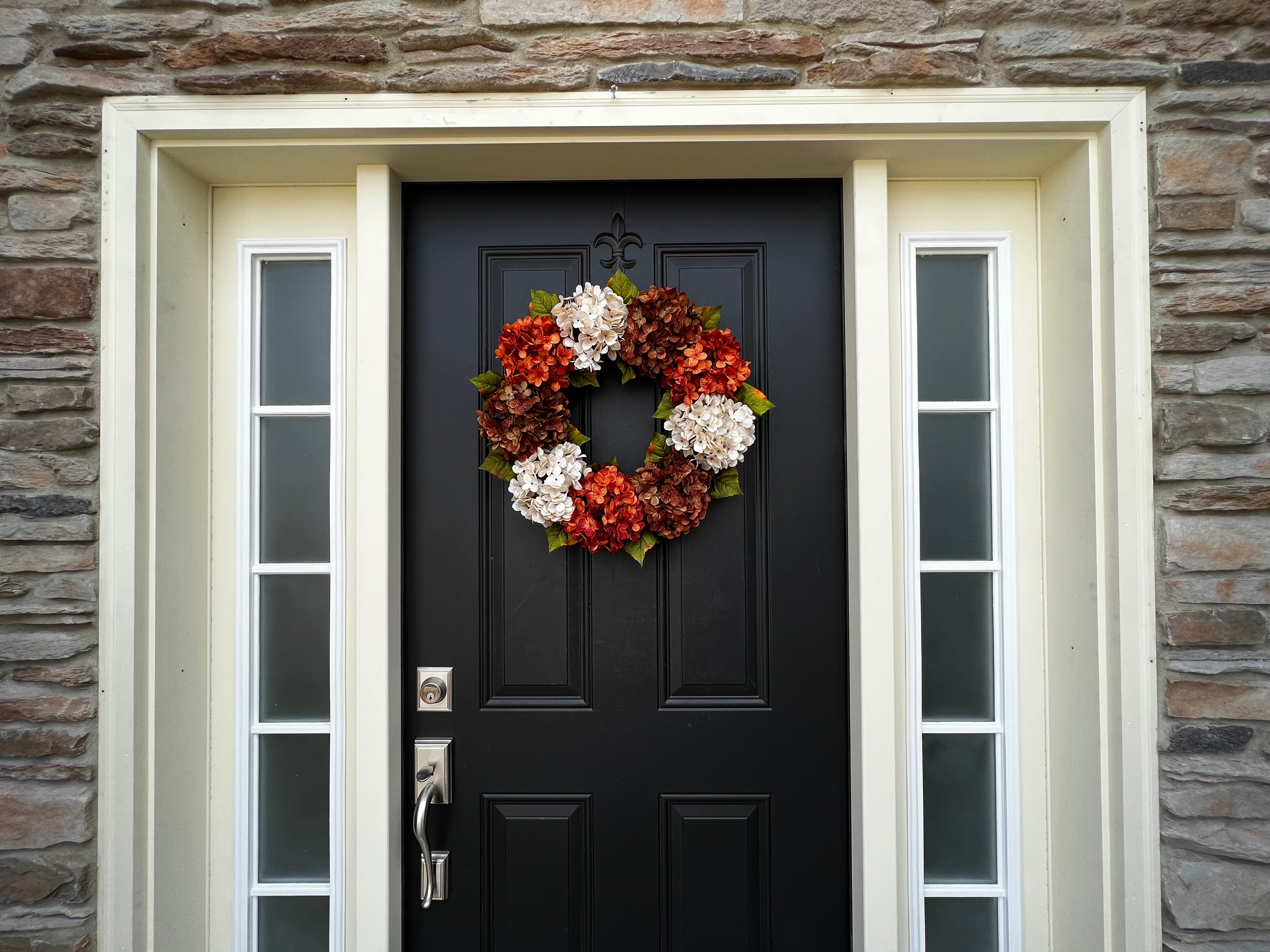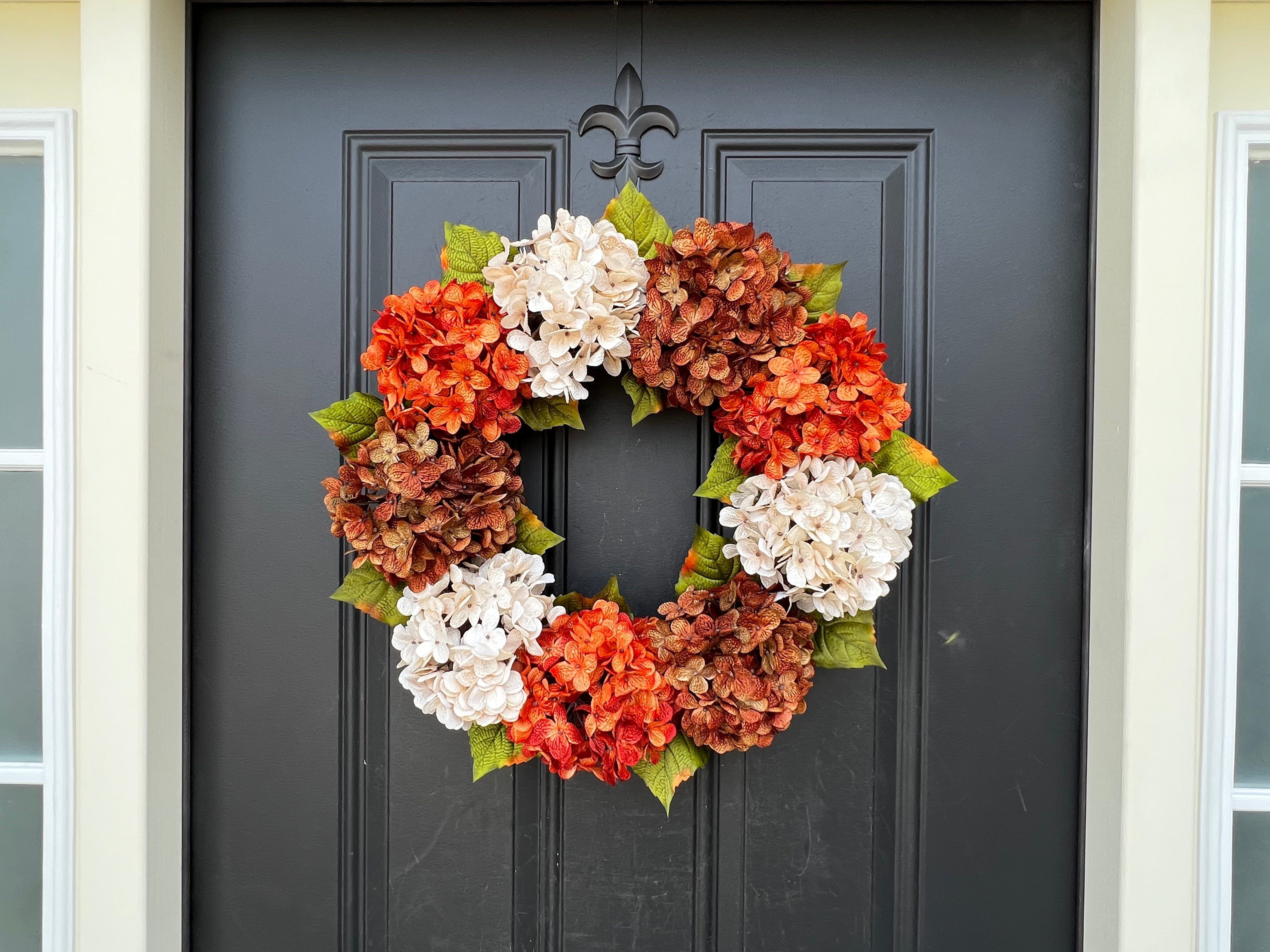 • Materials: Features natural grapevine wreath, faux fall hydrangeas, leaves