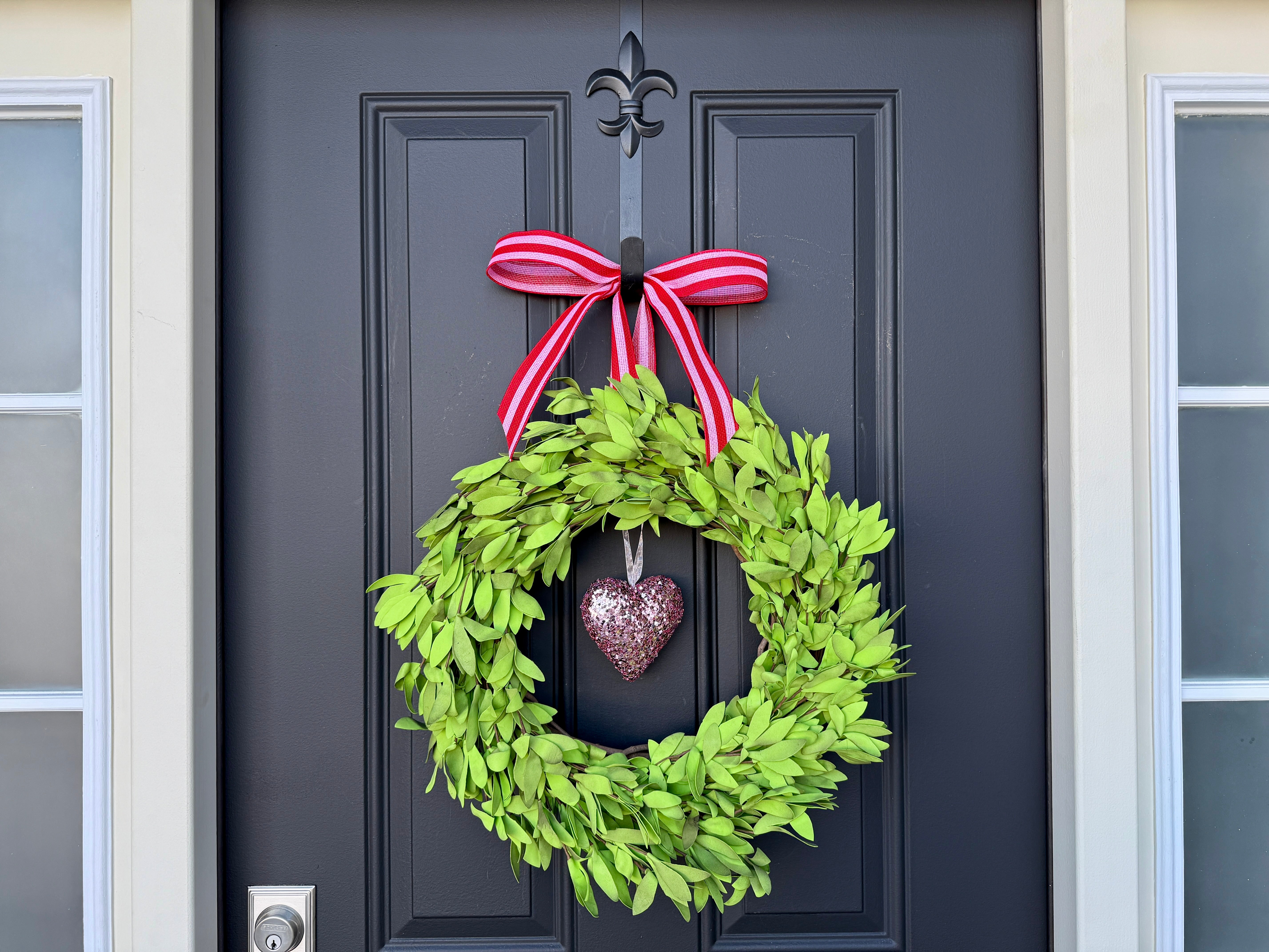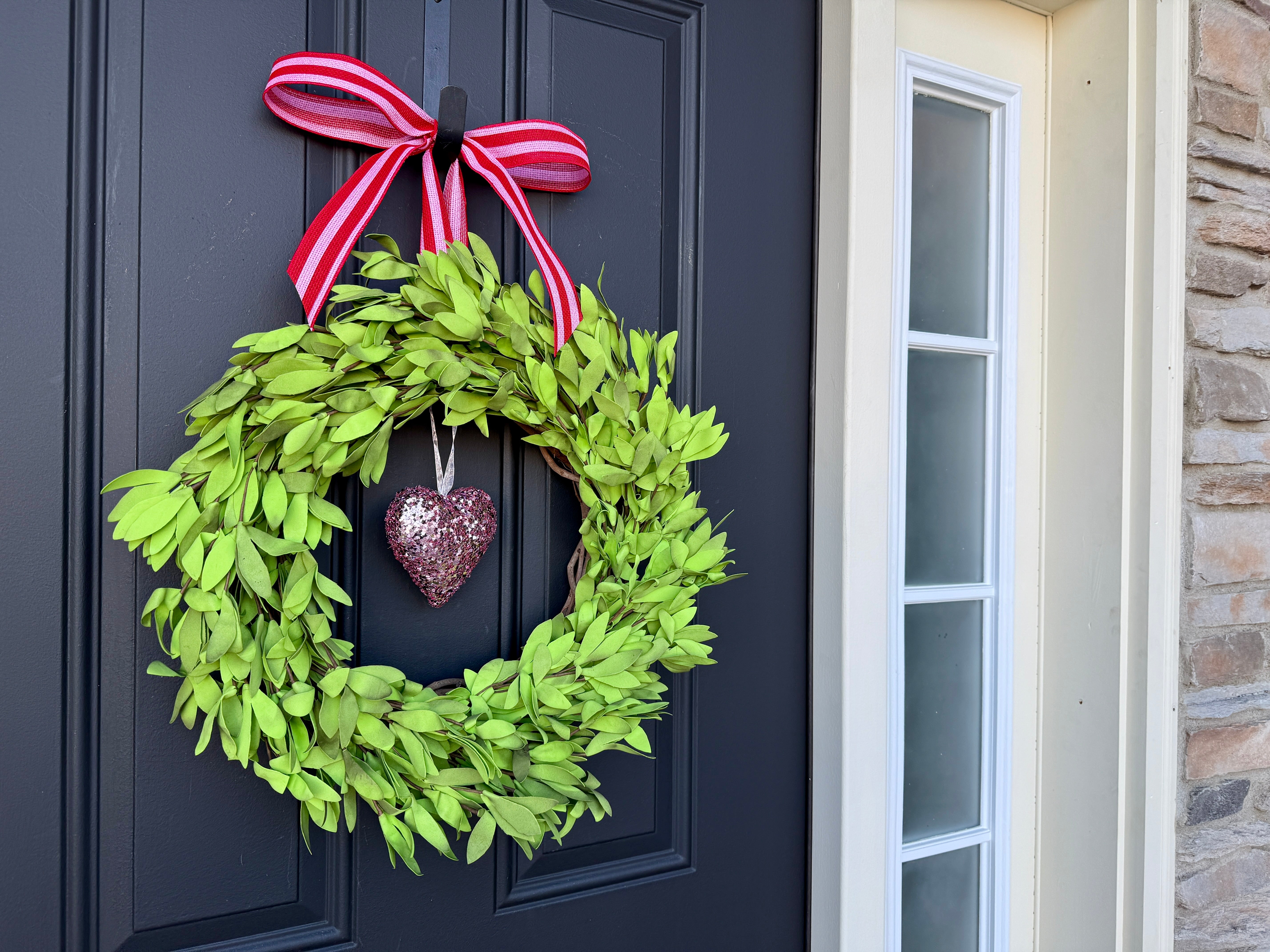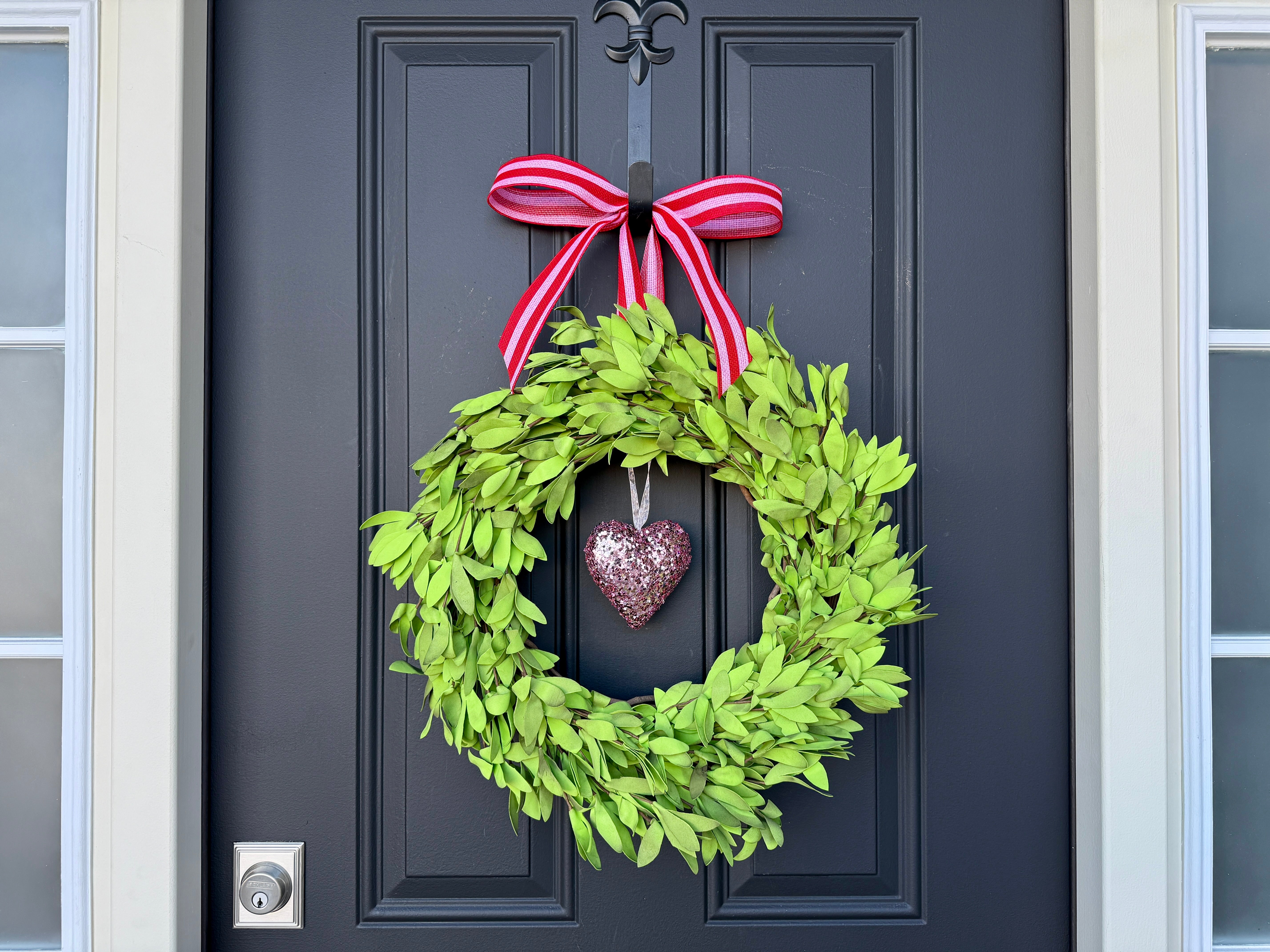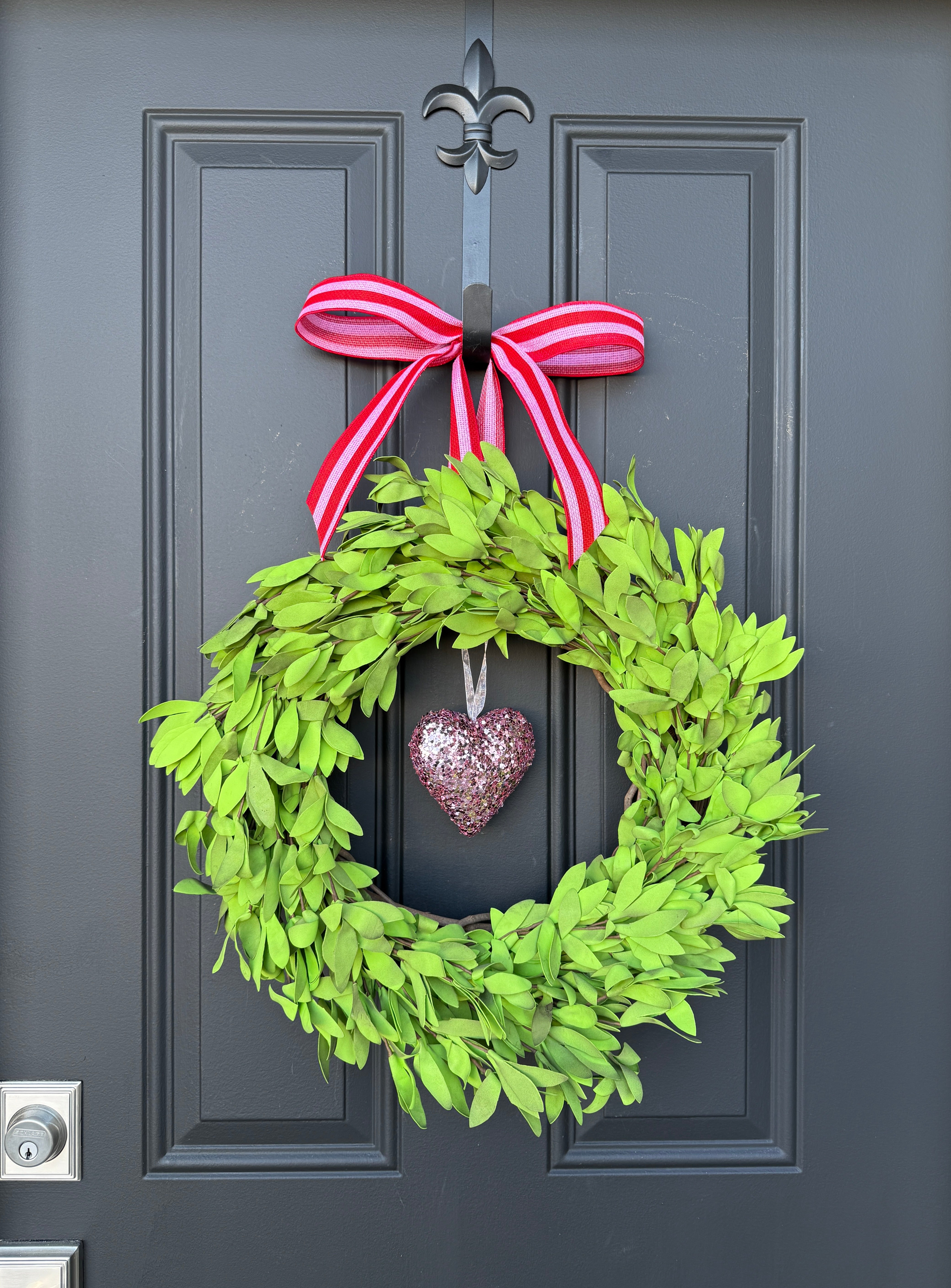 This handcrafted boxwood wreath features vibrant greenery paired with a pink heart accent for a whimsical Valentine’s Day look.