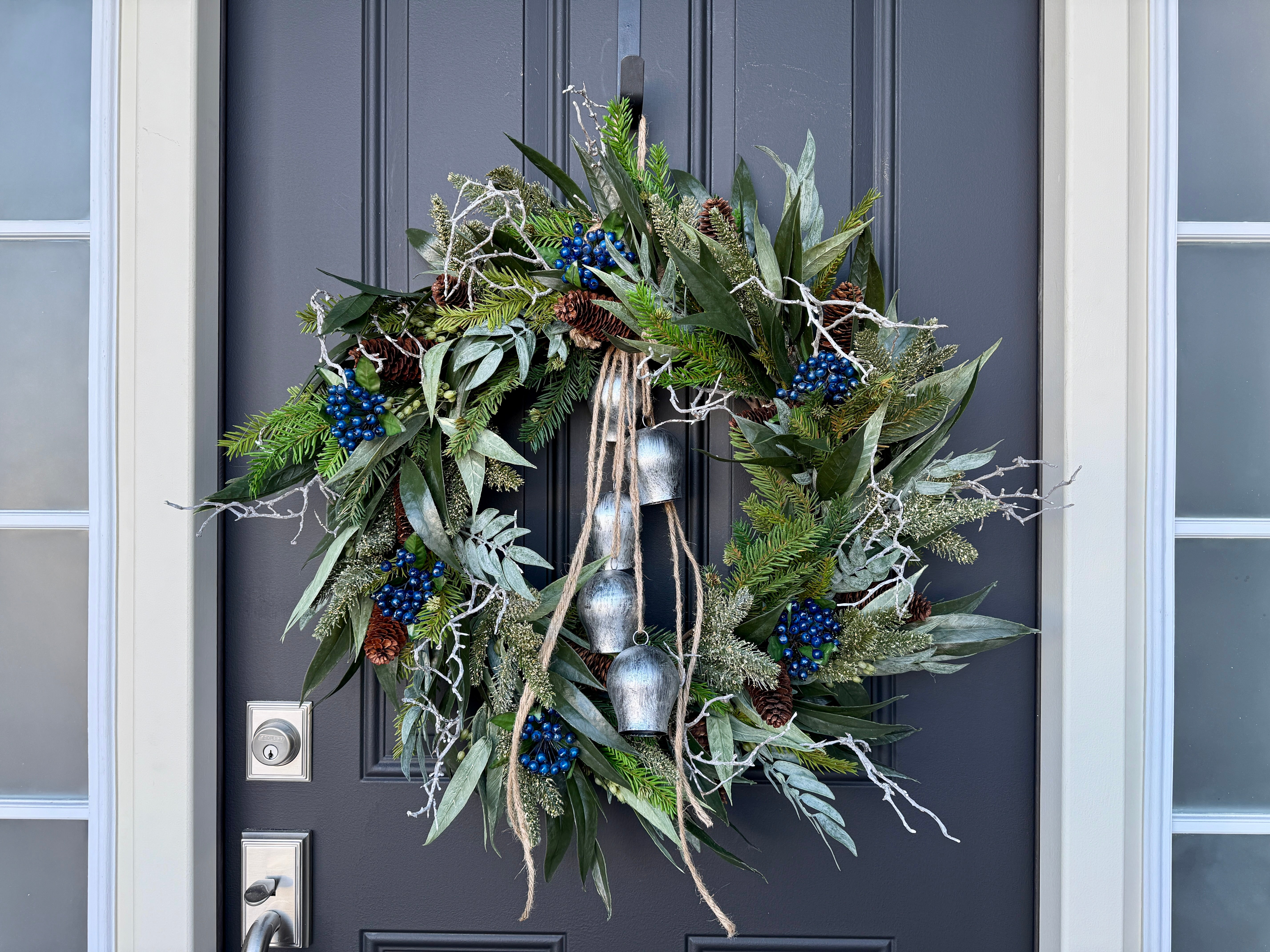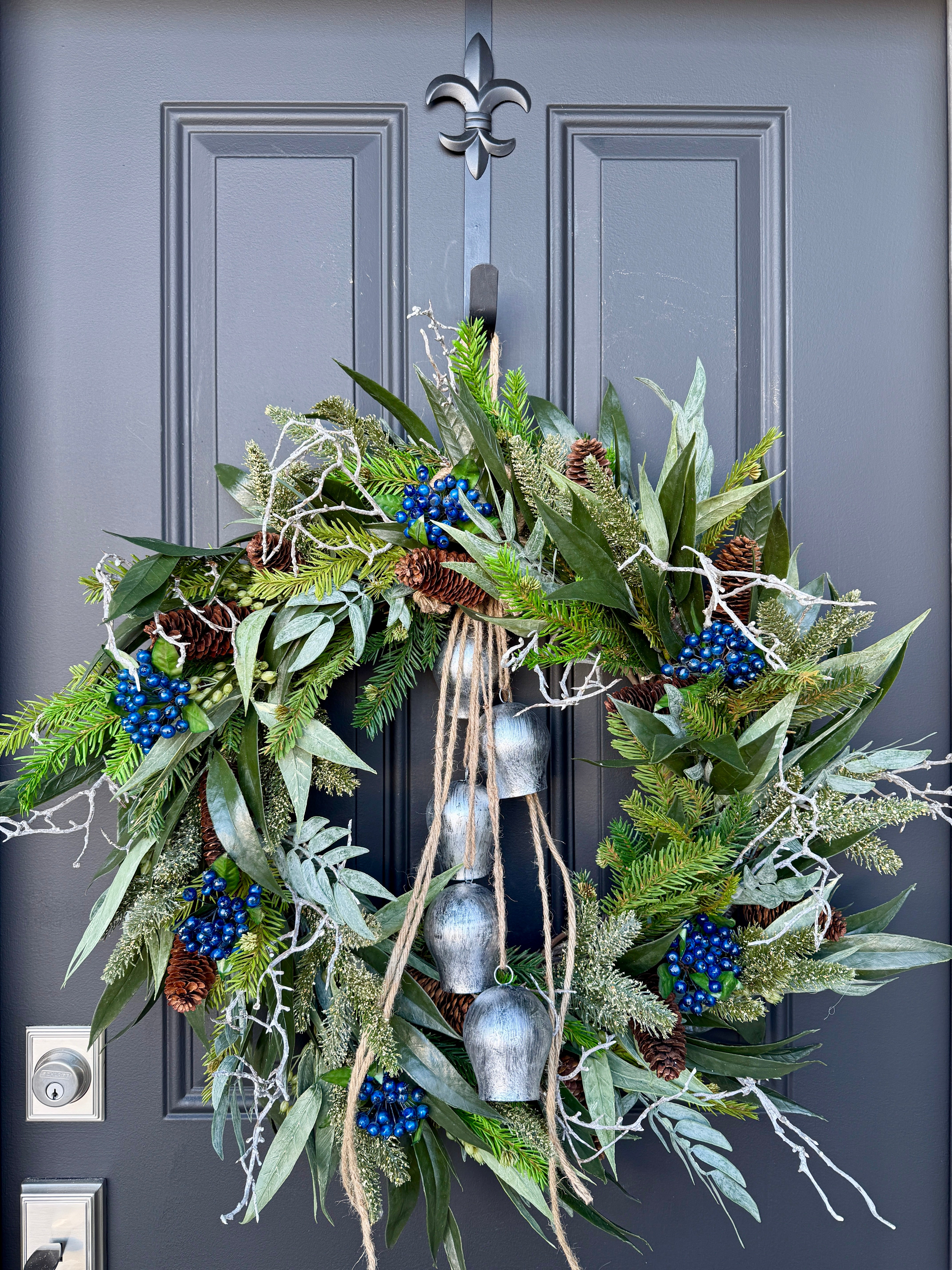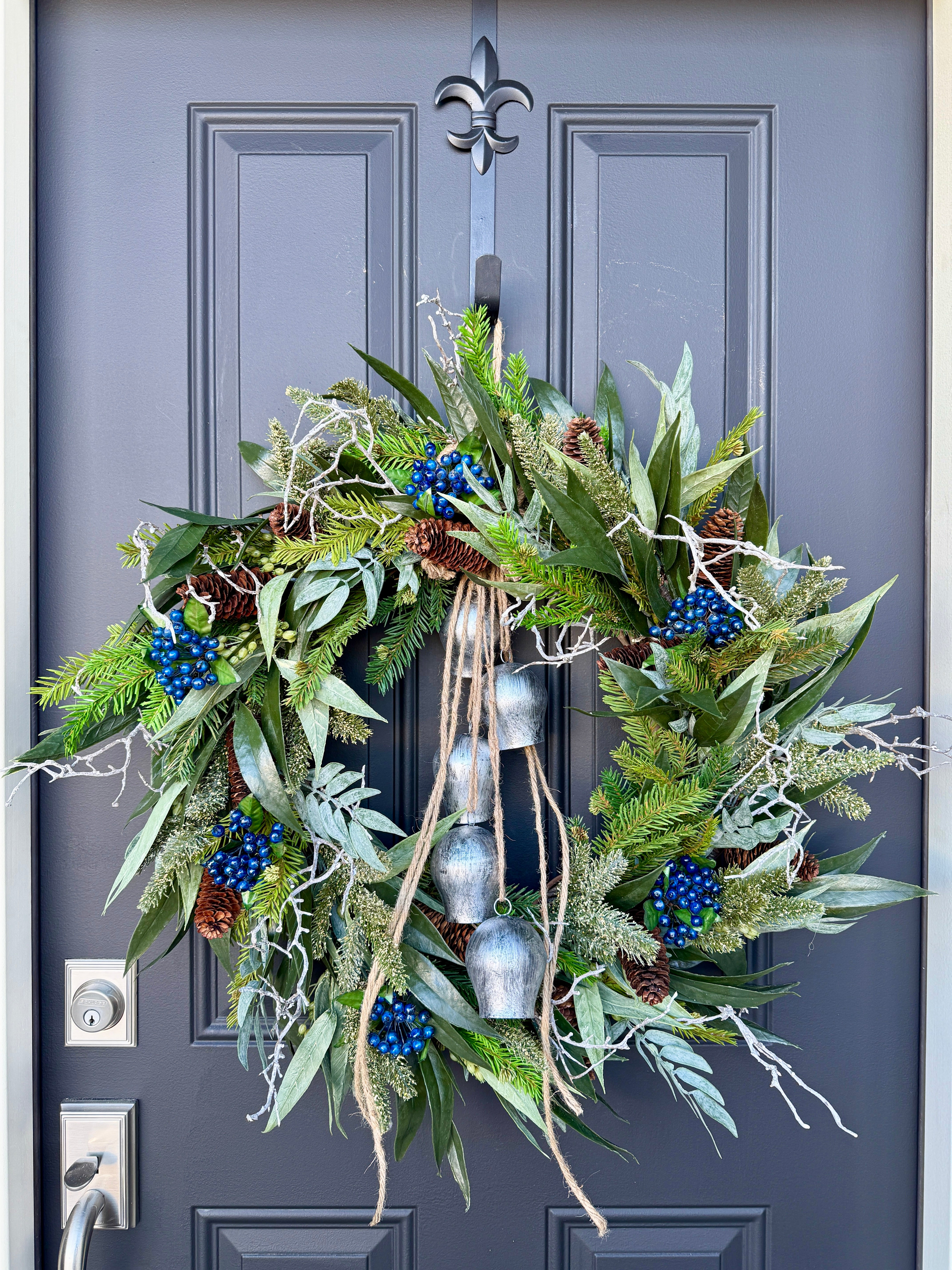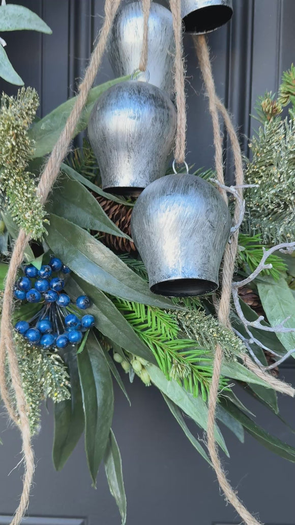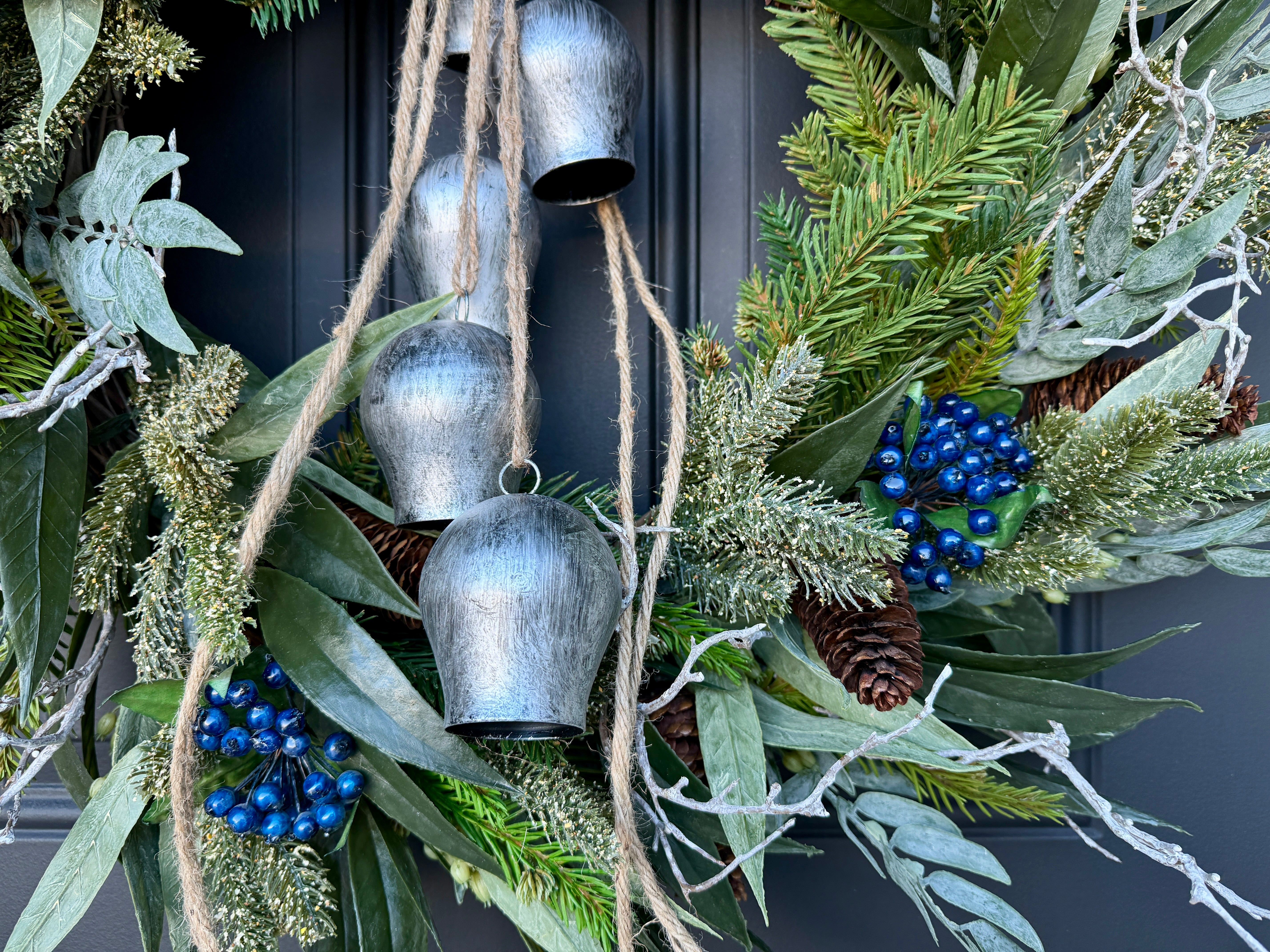 This handcrafted winter wreath features layered greenery accented with removable silver bells, navy velvet ribbon, and natural twine for a timeless seasonal look.