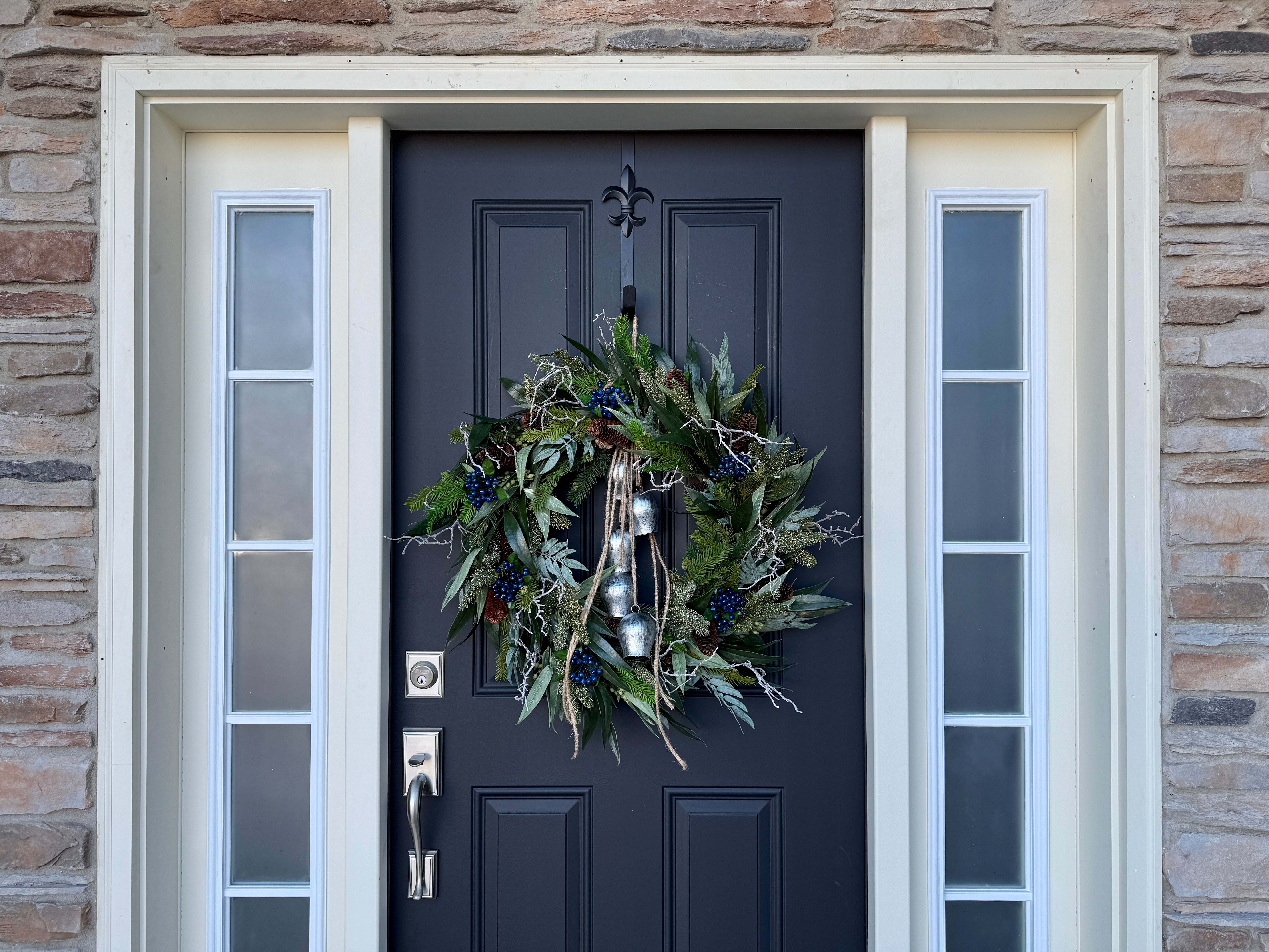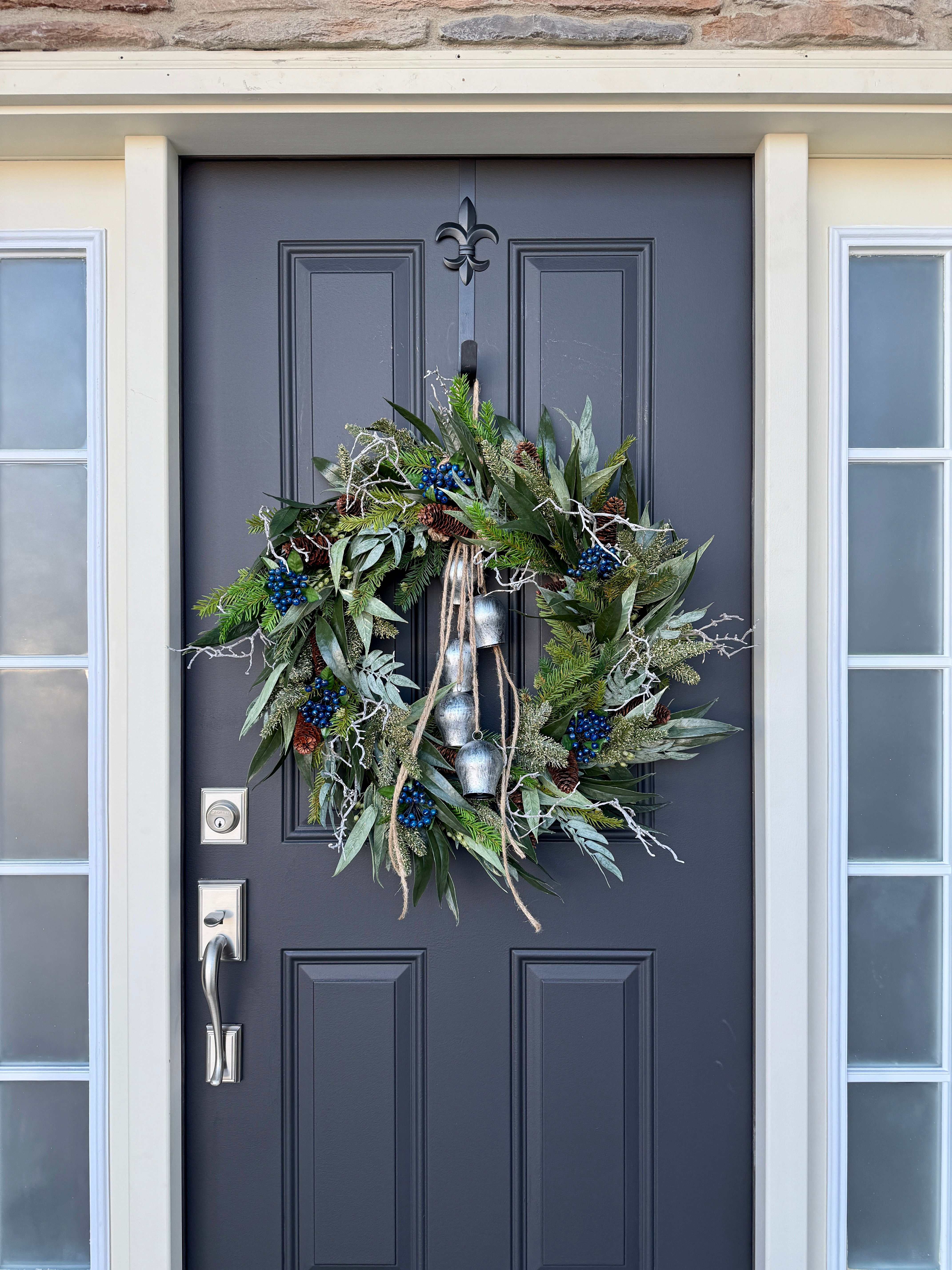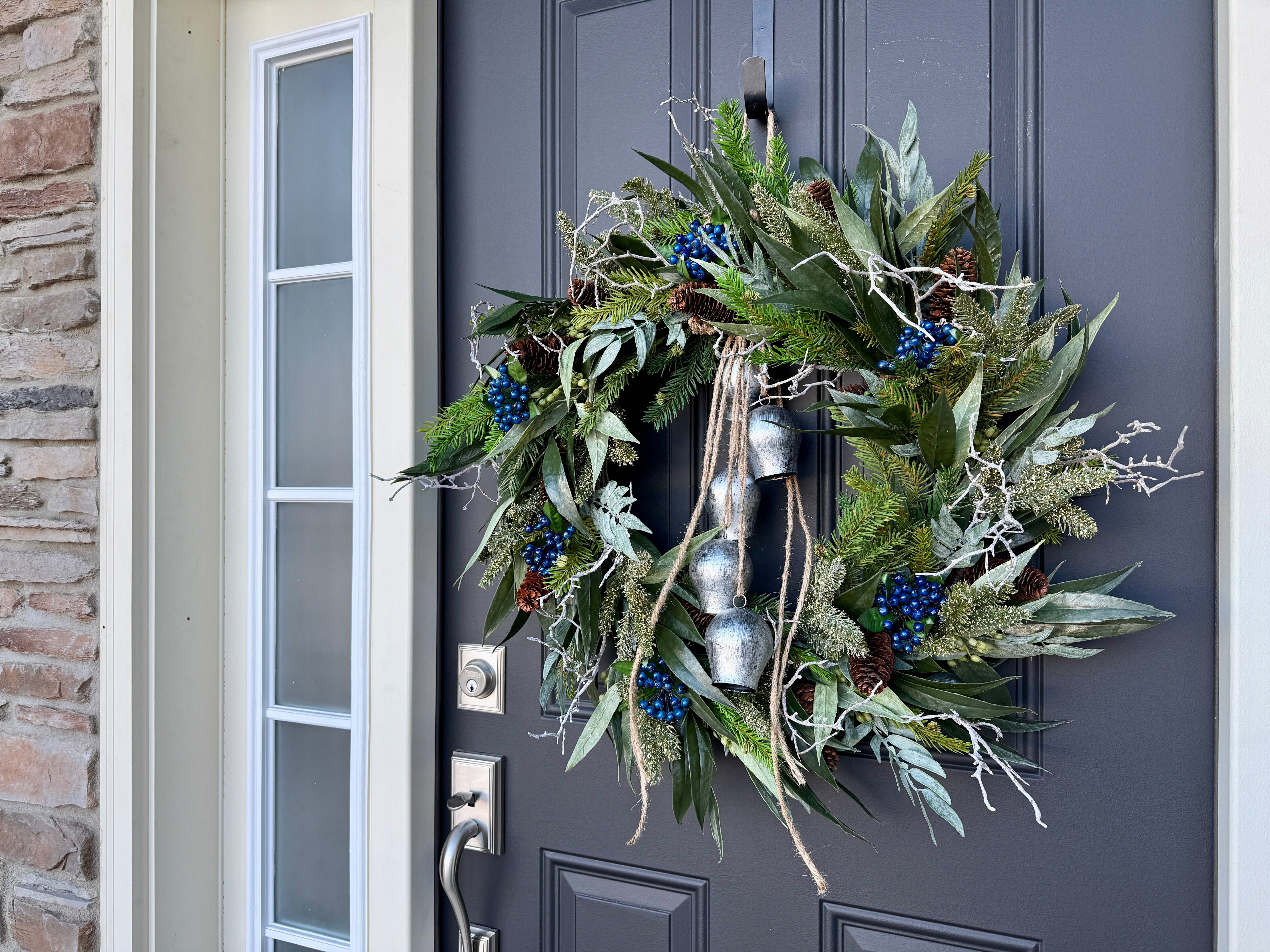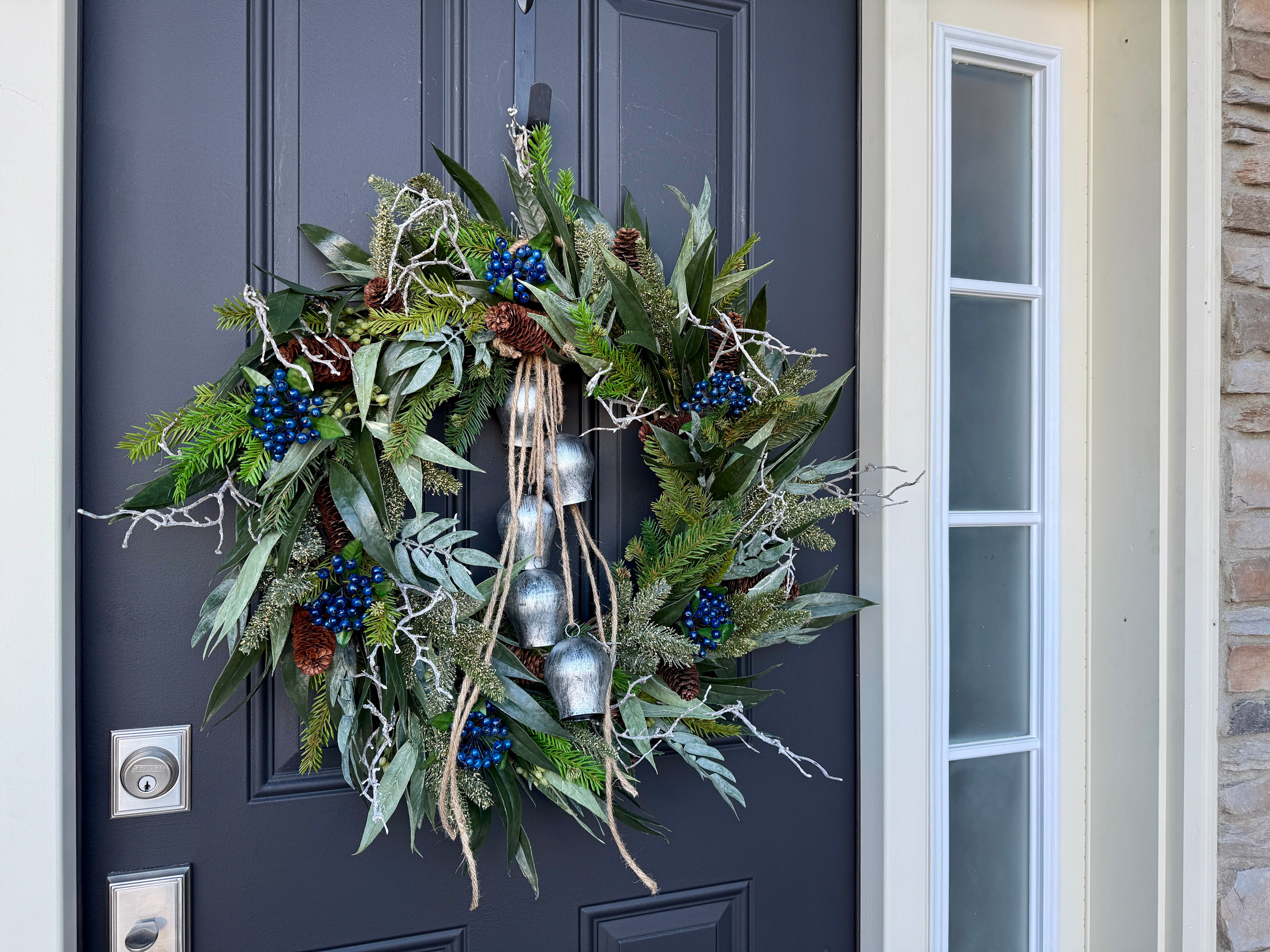 This handcrafted winter wreath features layered greenery accented with removable silver bells, navy velvet ribbon, and natural twine for a timeless seasonal look.