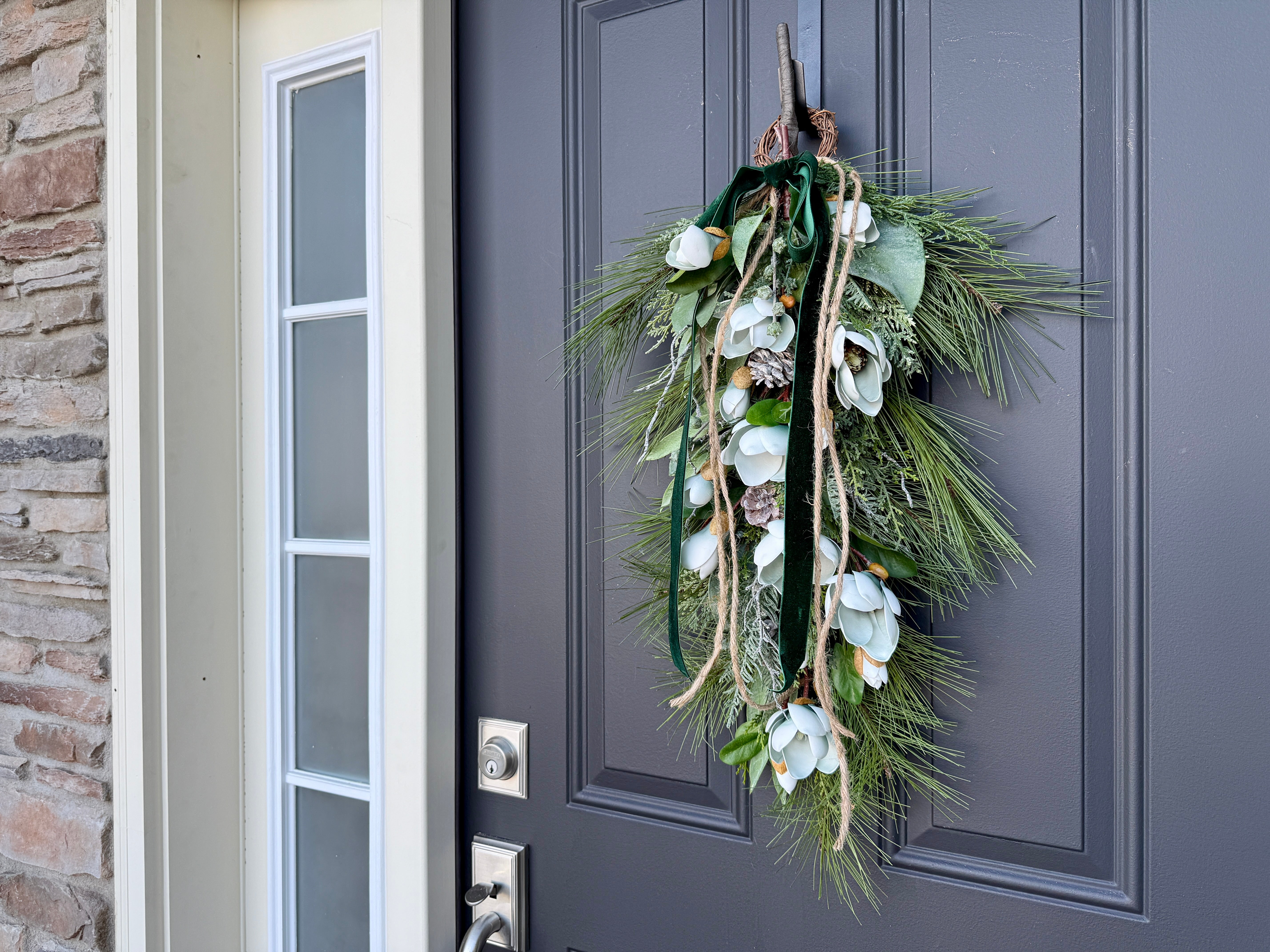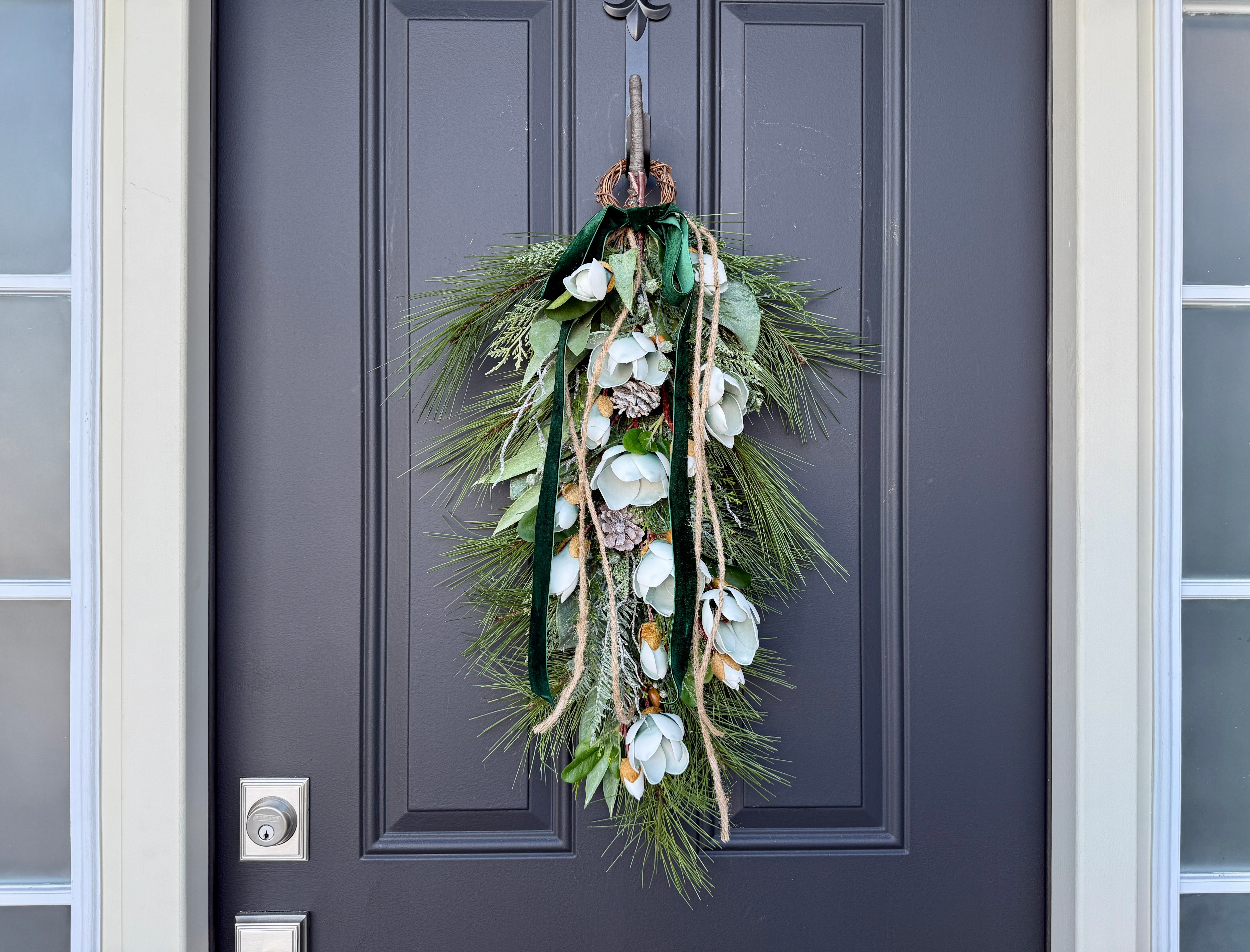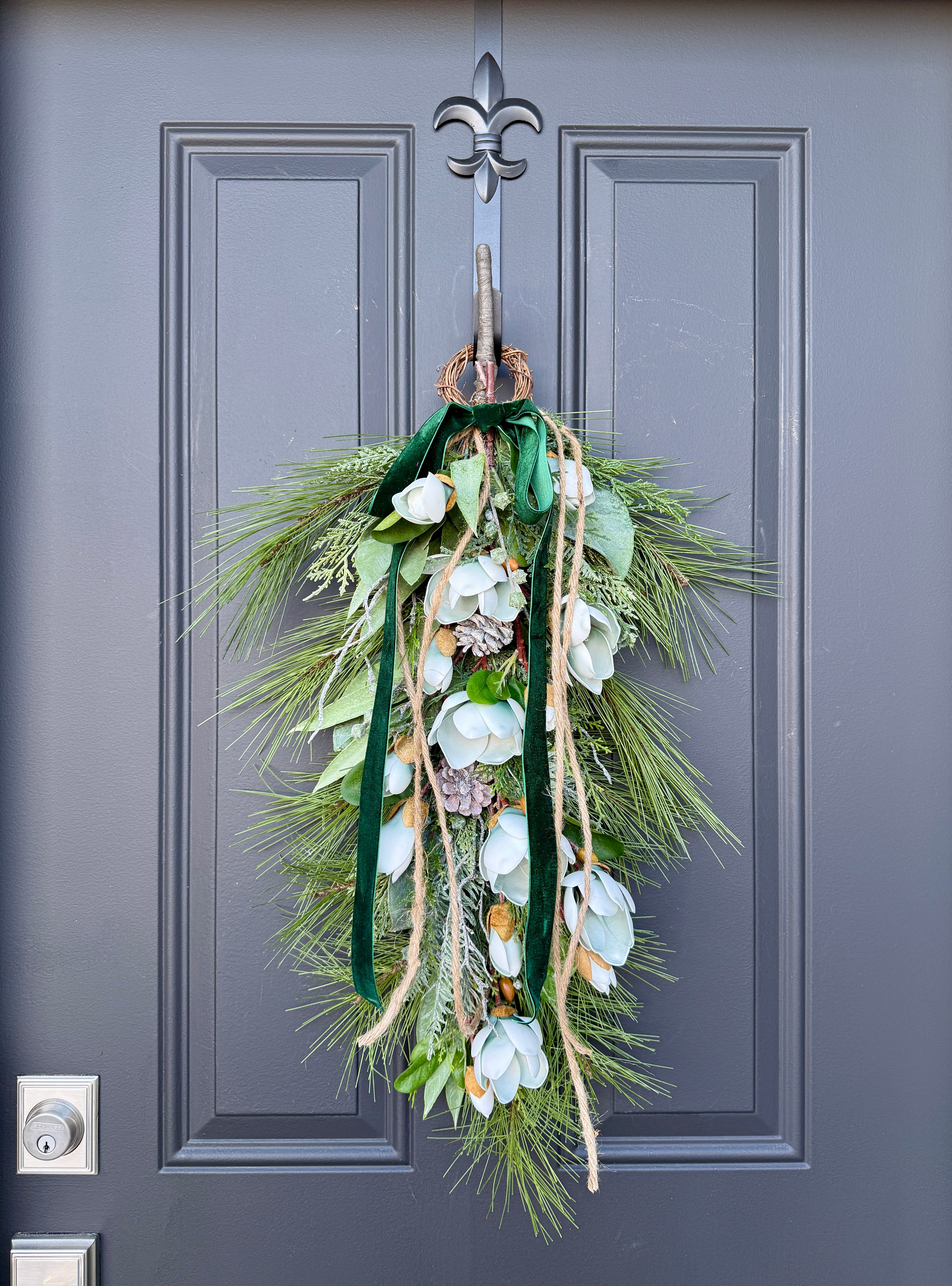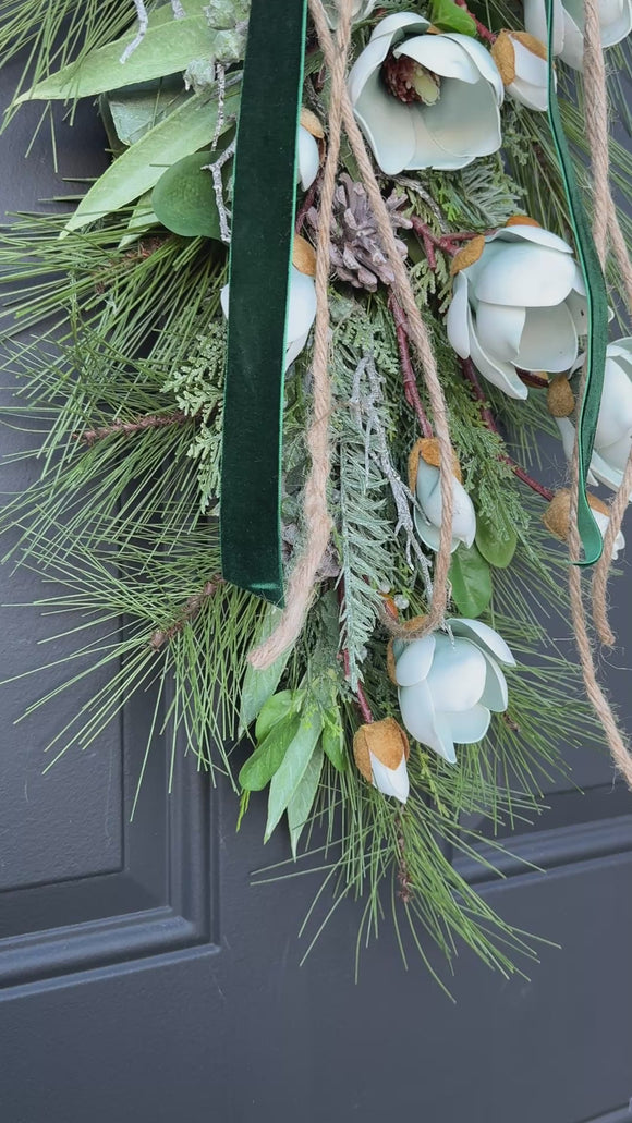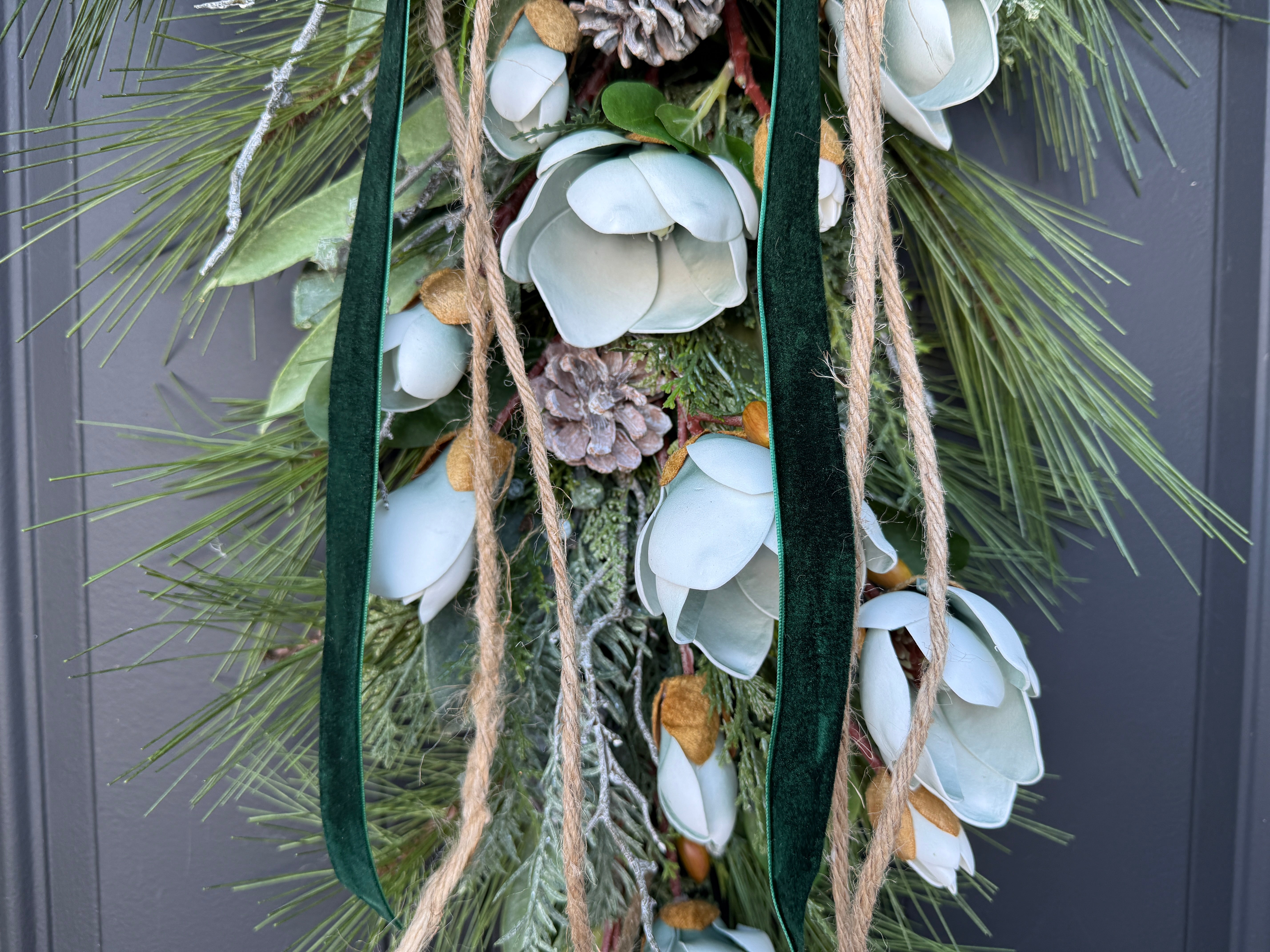 This handcrafted winter pine swag features cascading greenery accented with blue magnolia, velvet ribbon, and natural twine.