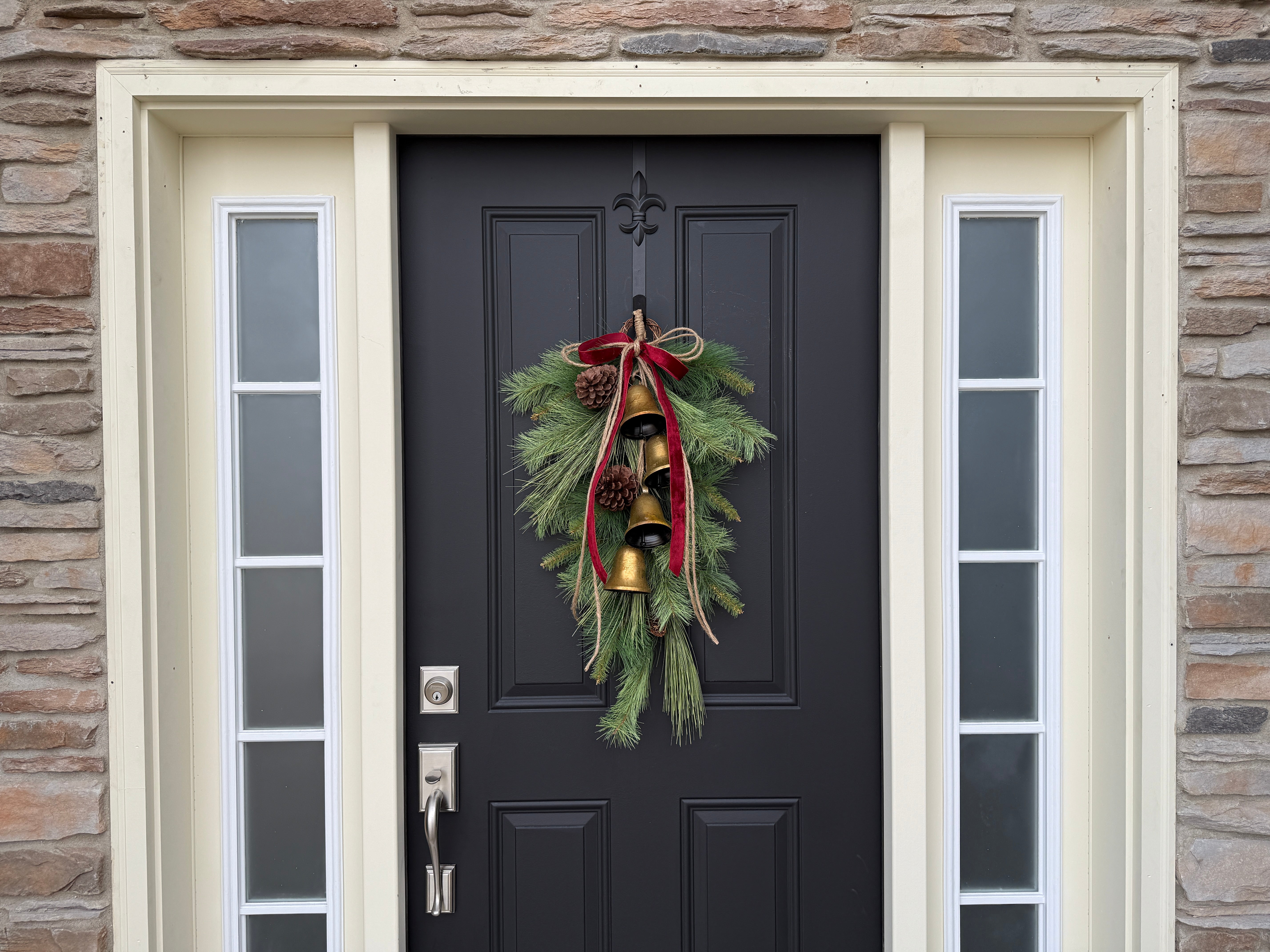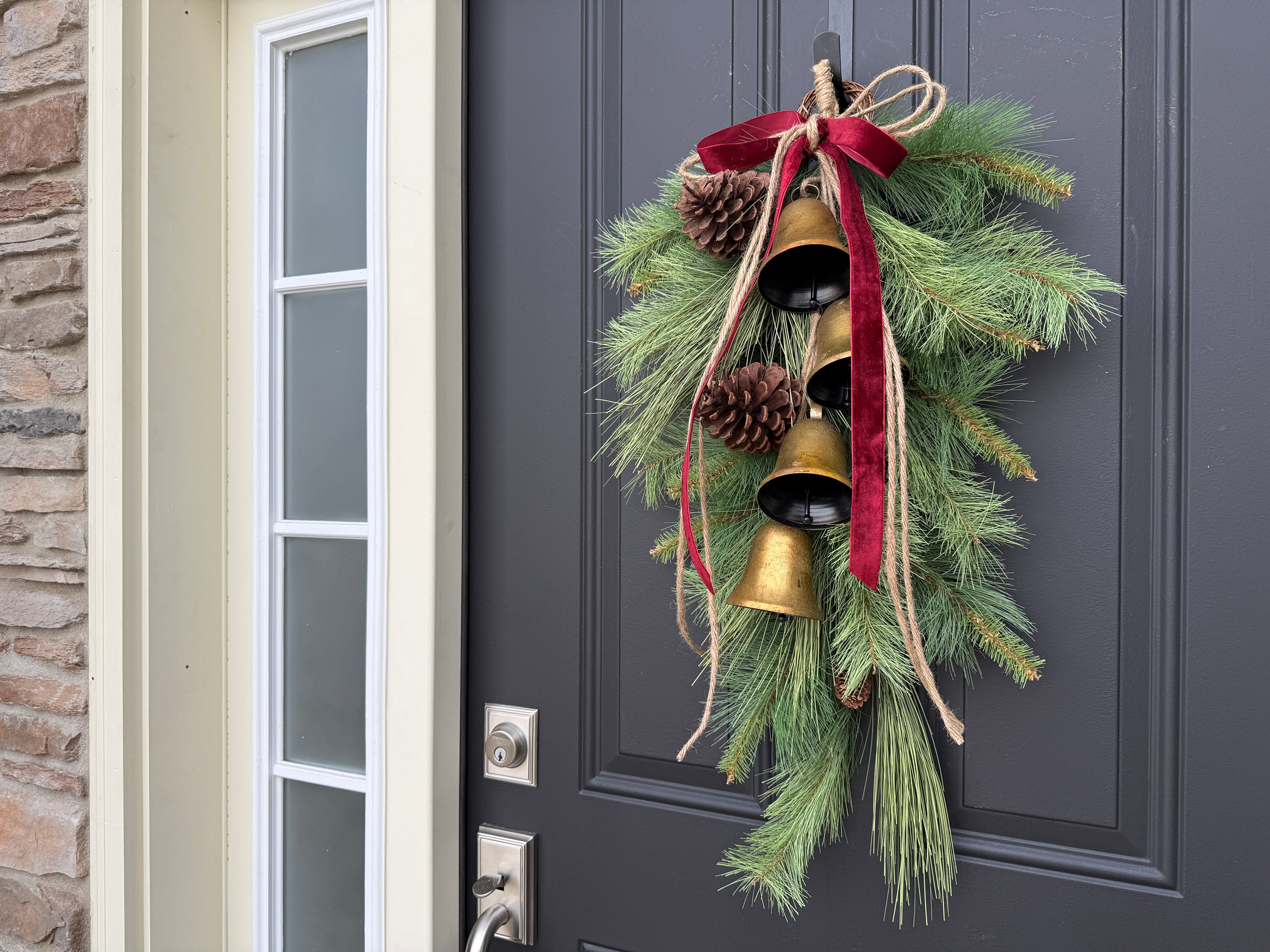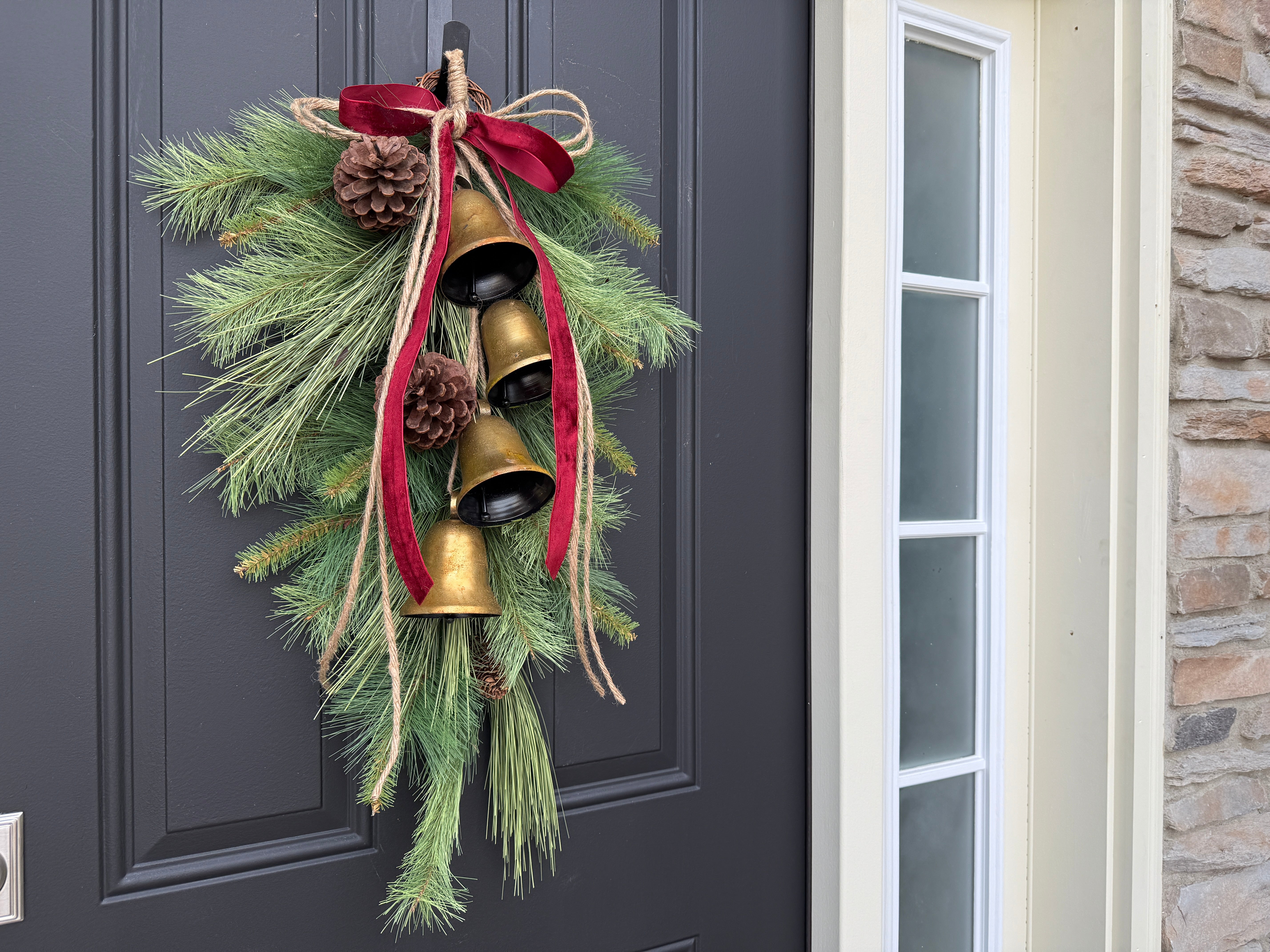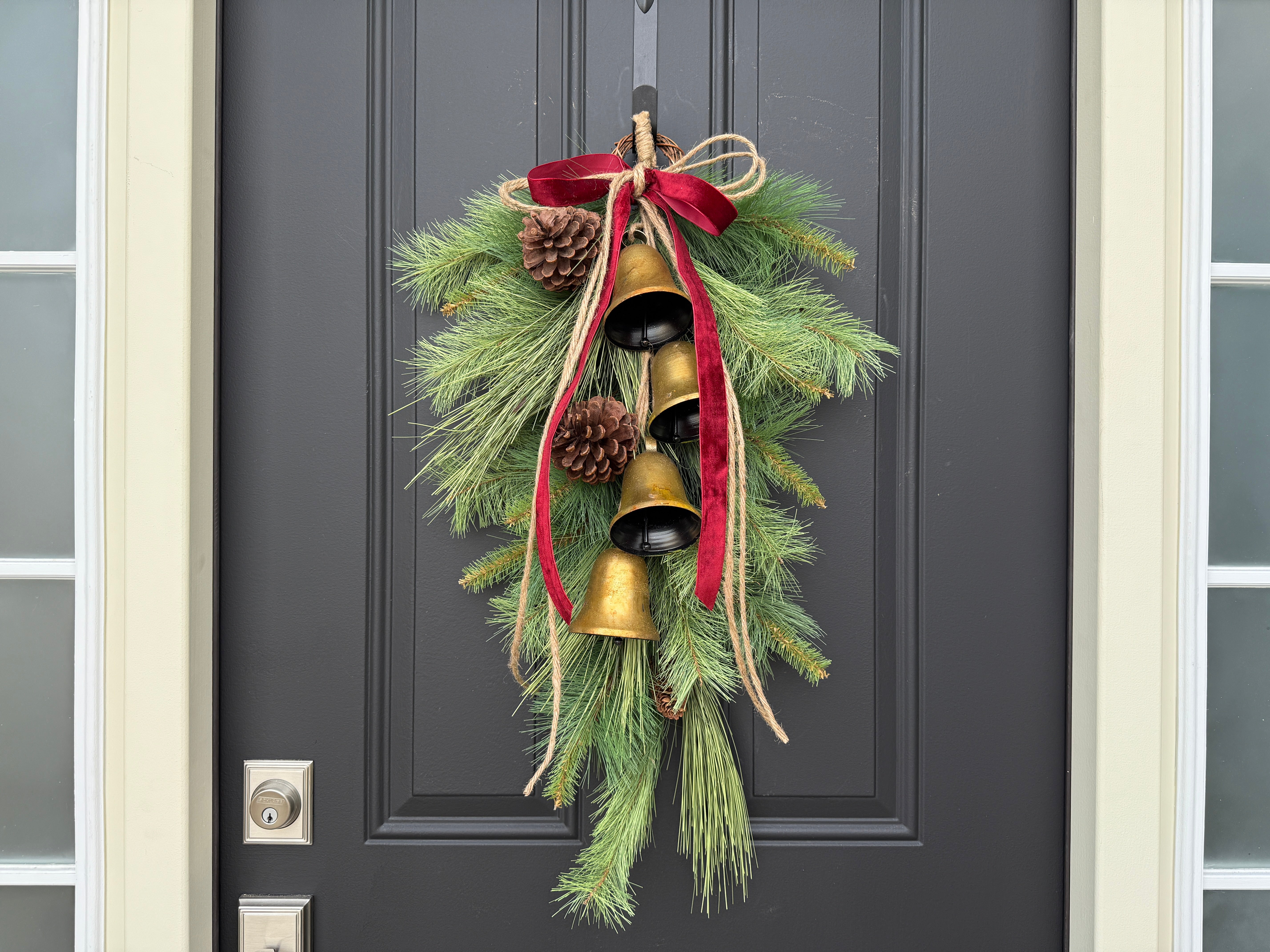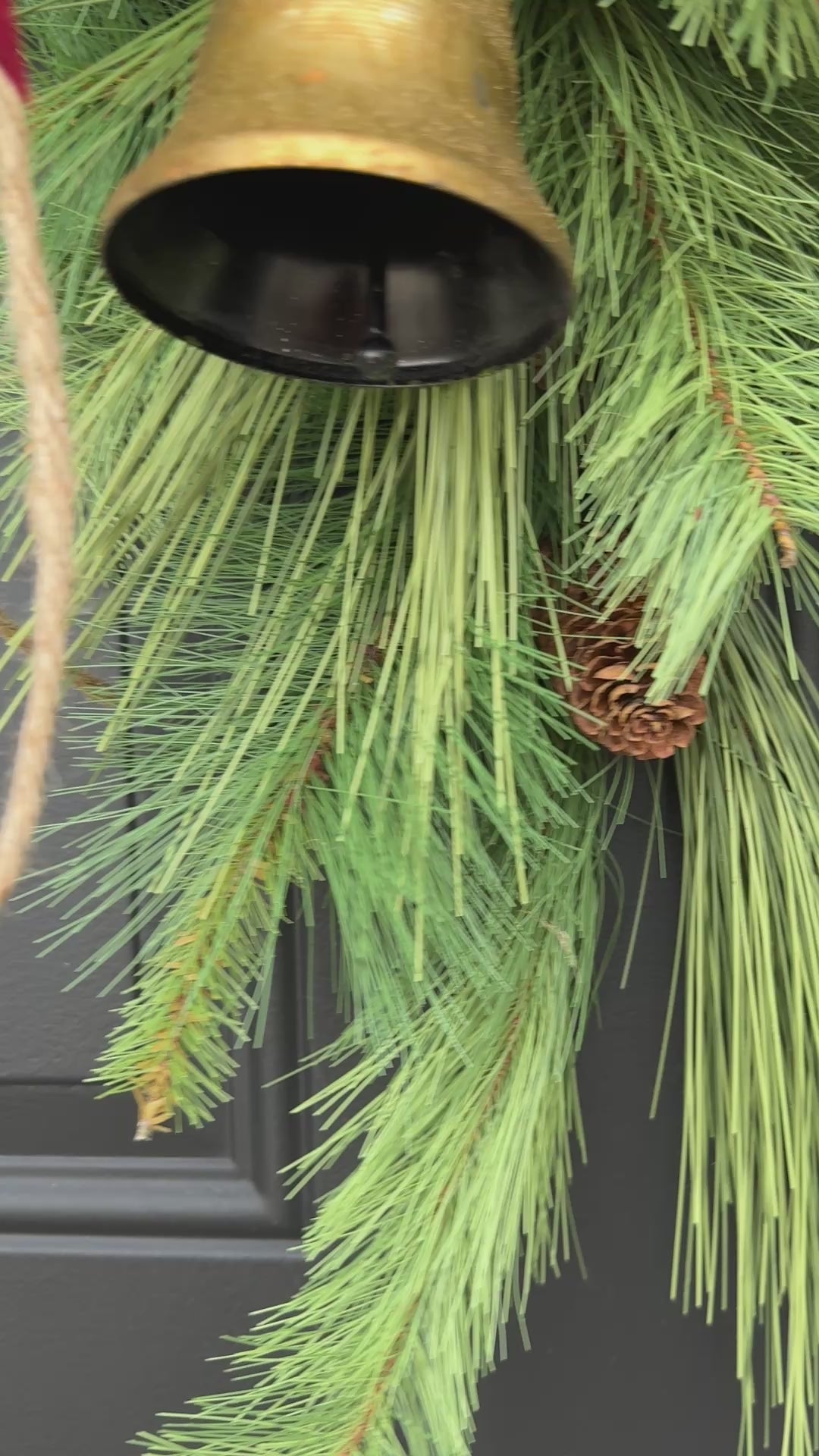 • Materials: Faux Wintery Pine, Large Natural Pinecones, 4 gold hanging bells, velvet ribbon
