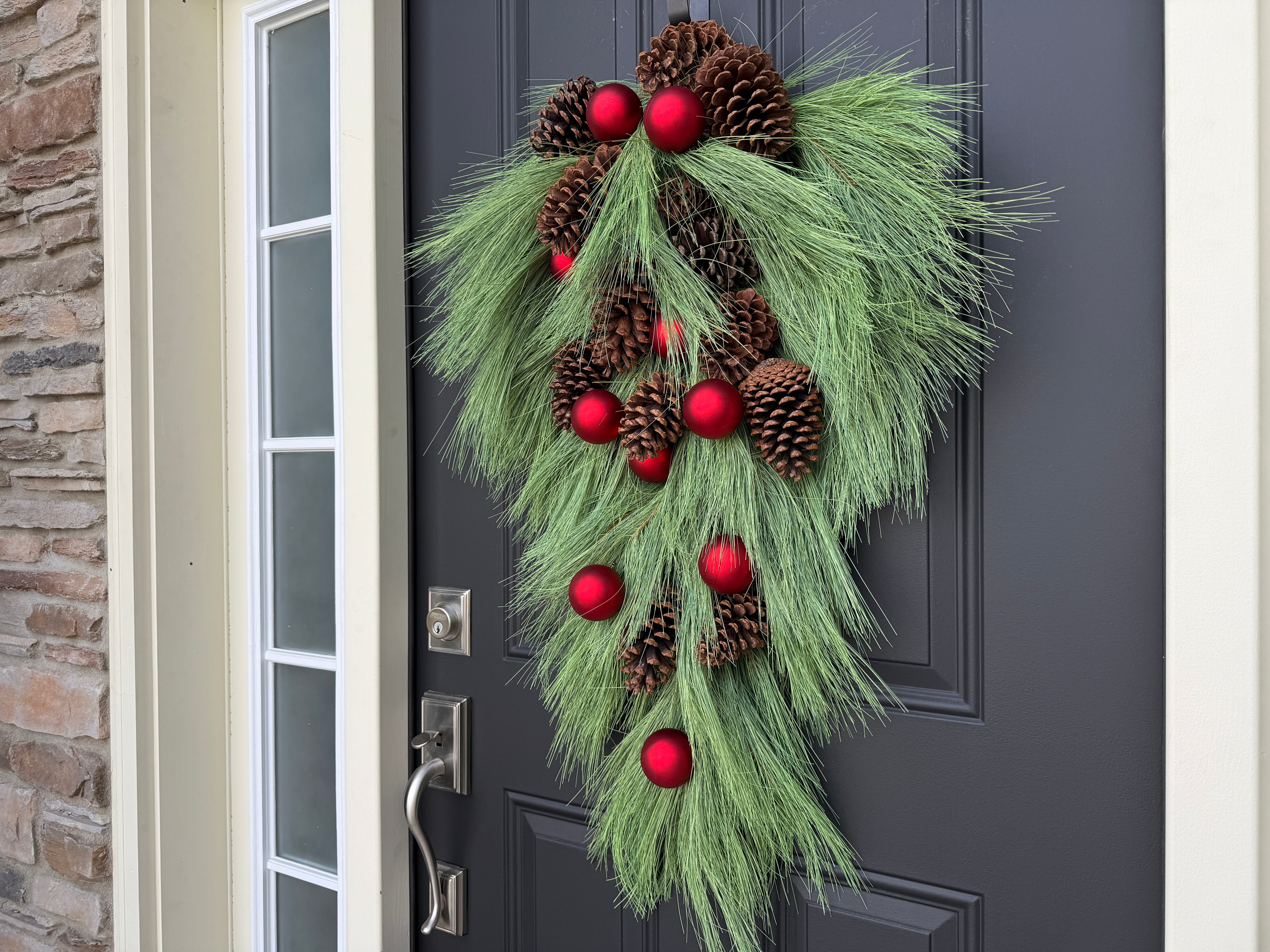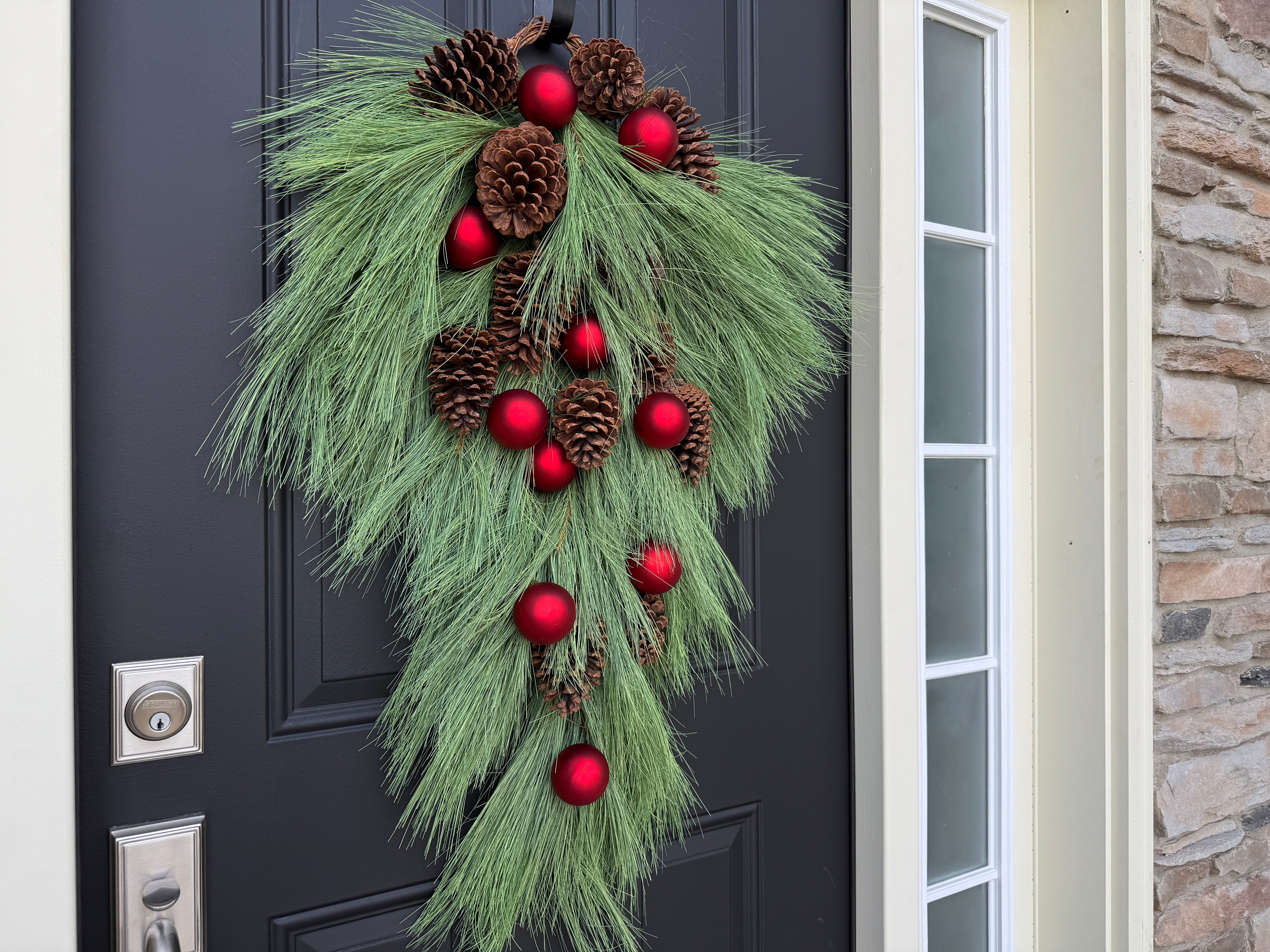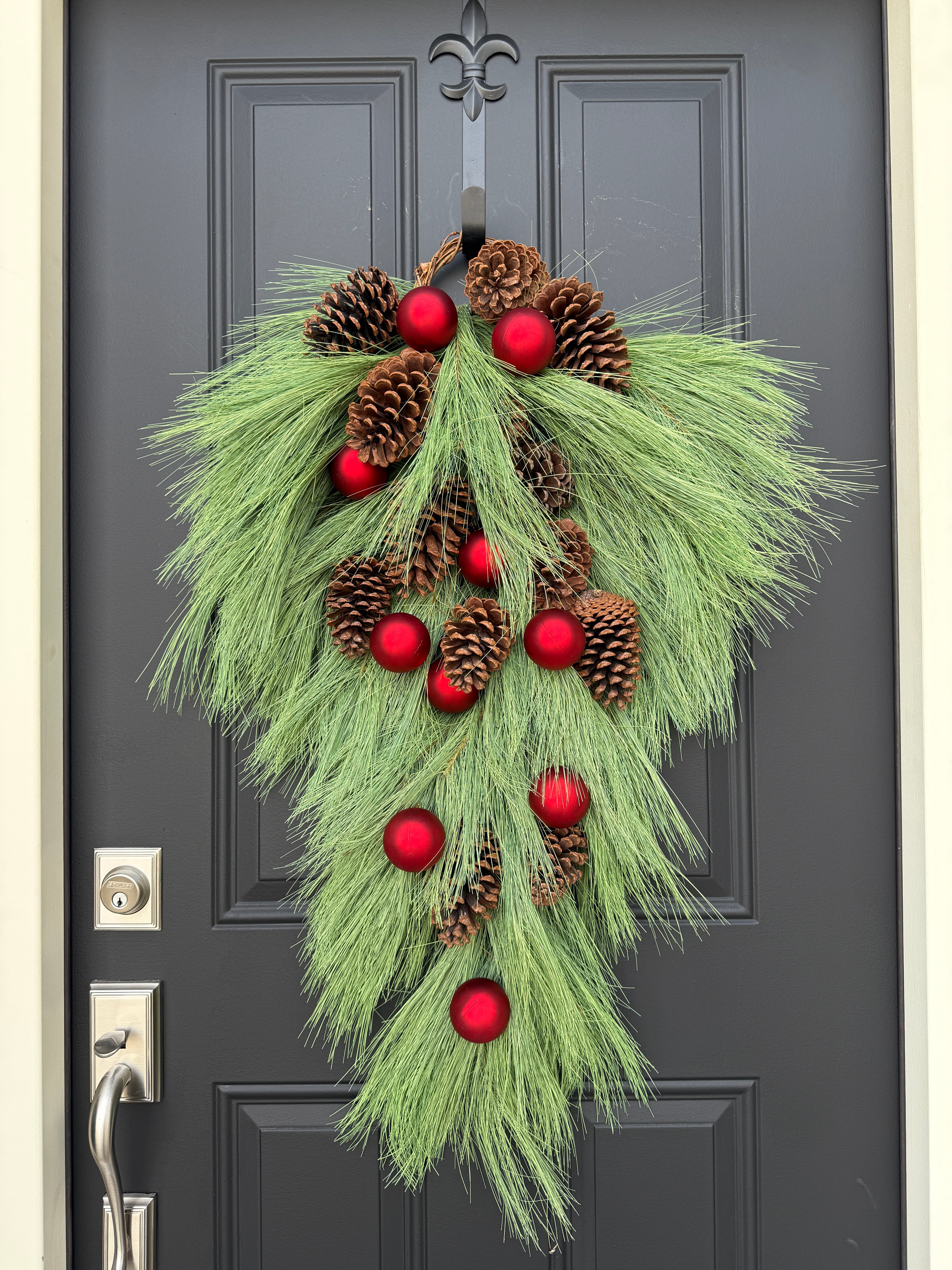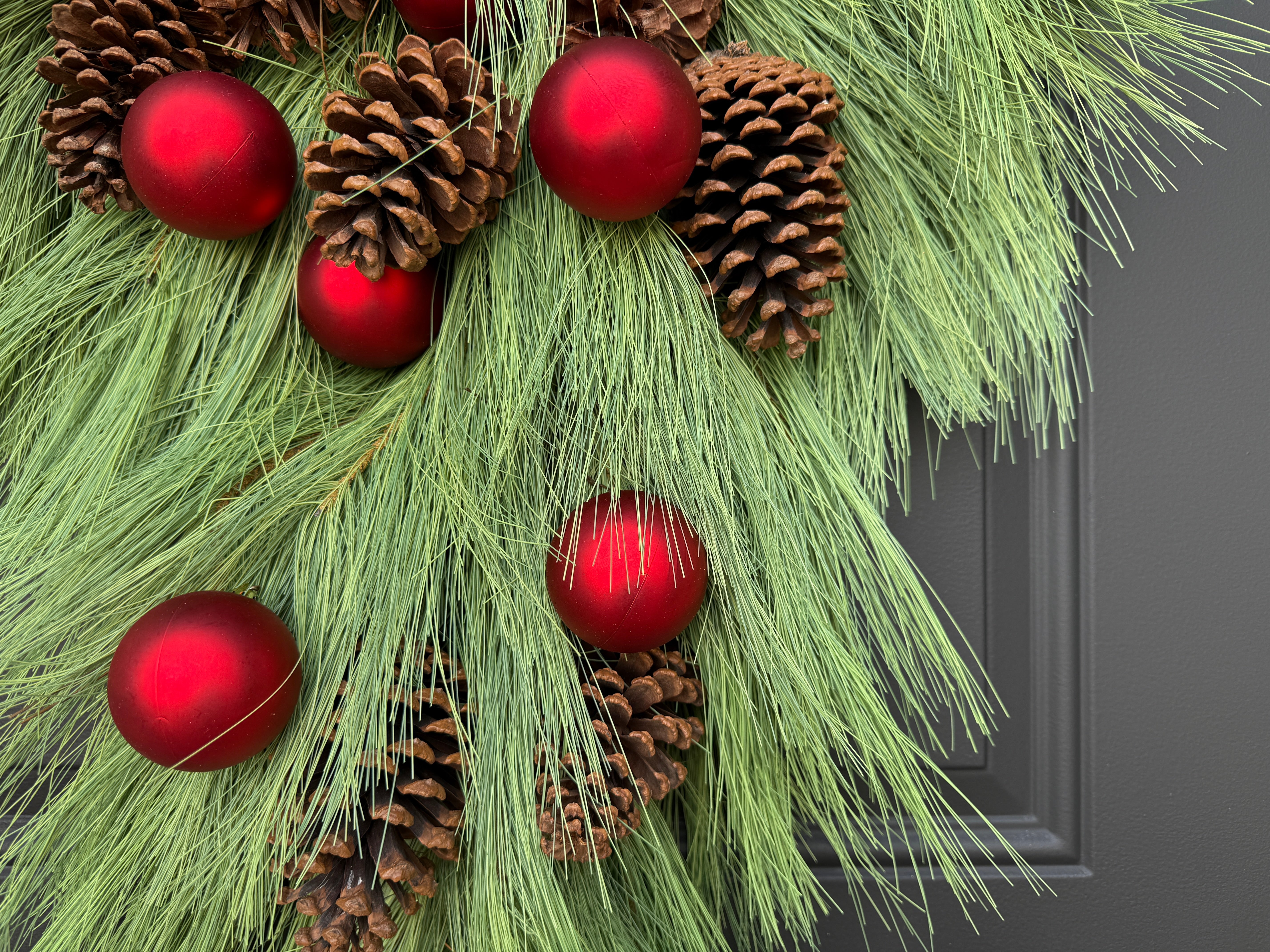 Nostalgic Red Ornament & Pine Swag β Handcrafted Christmas Door Decor |
