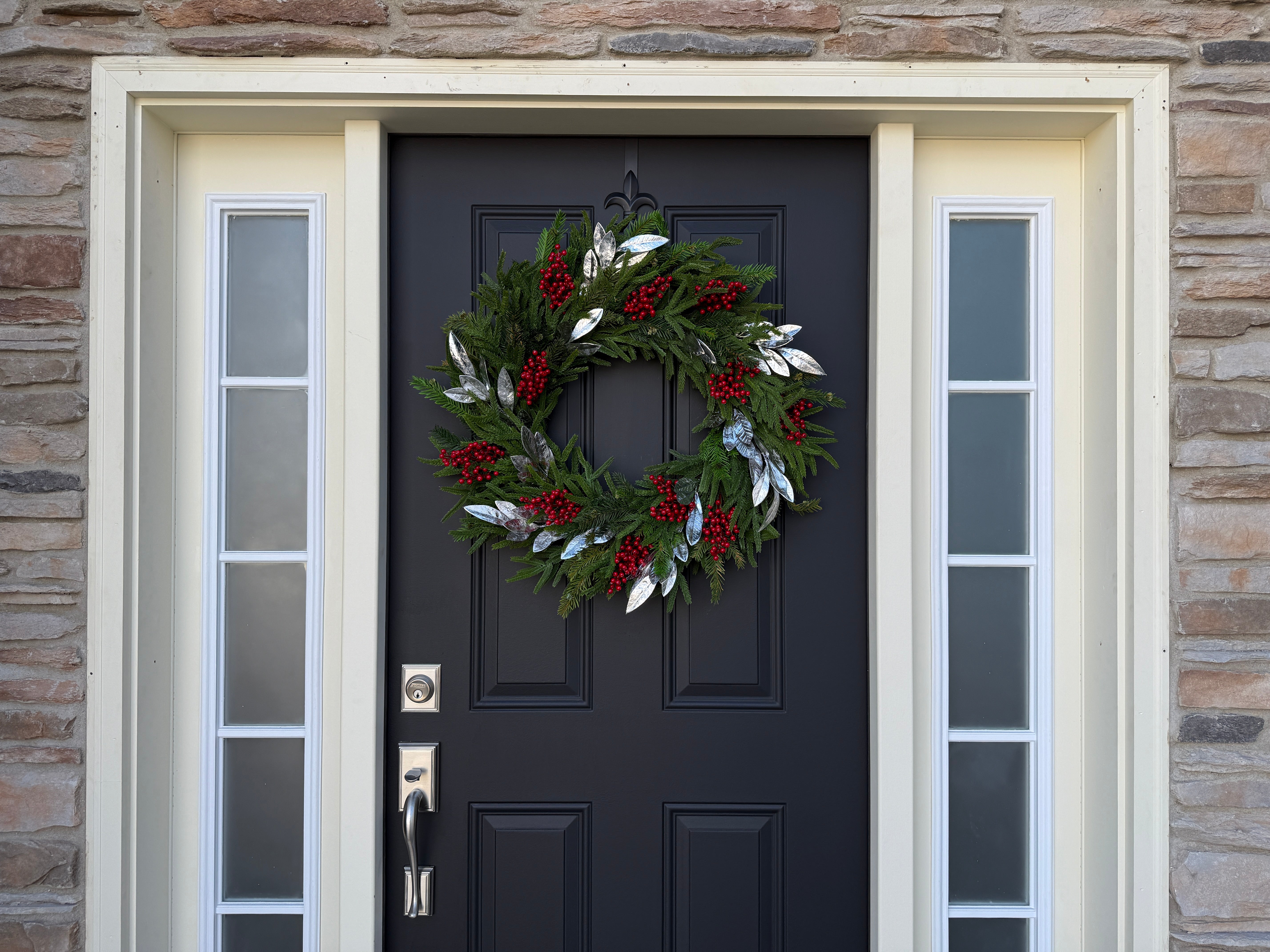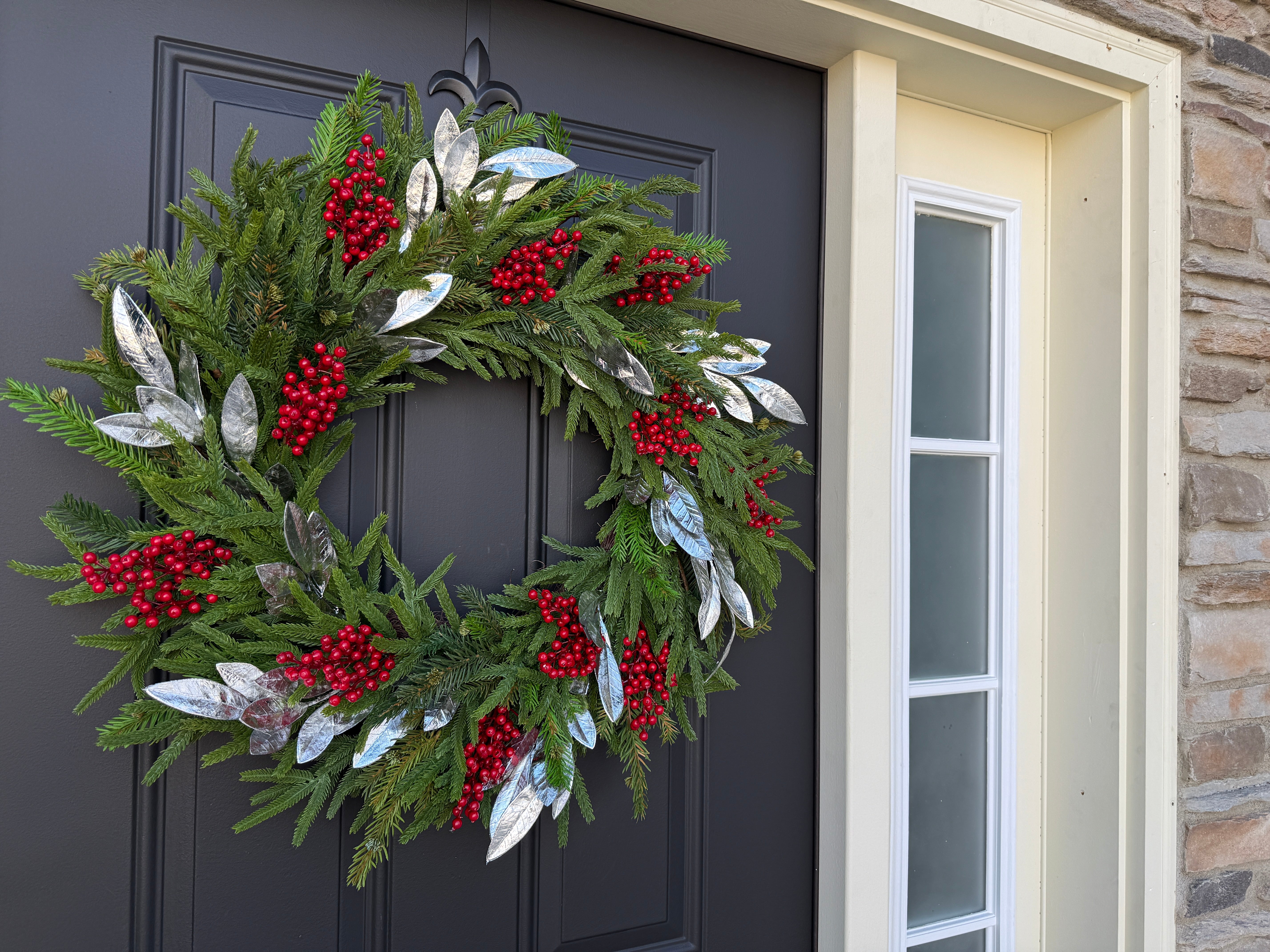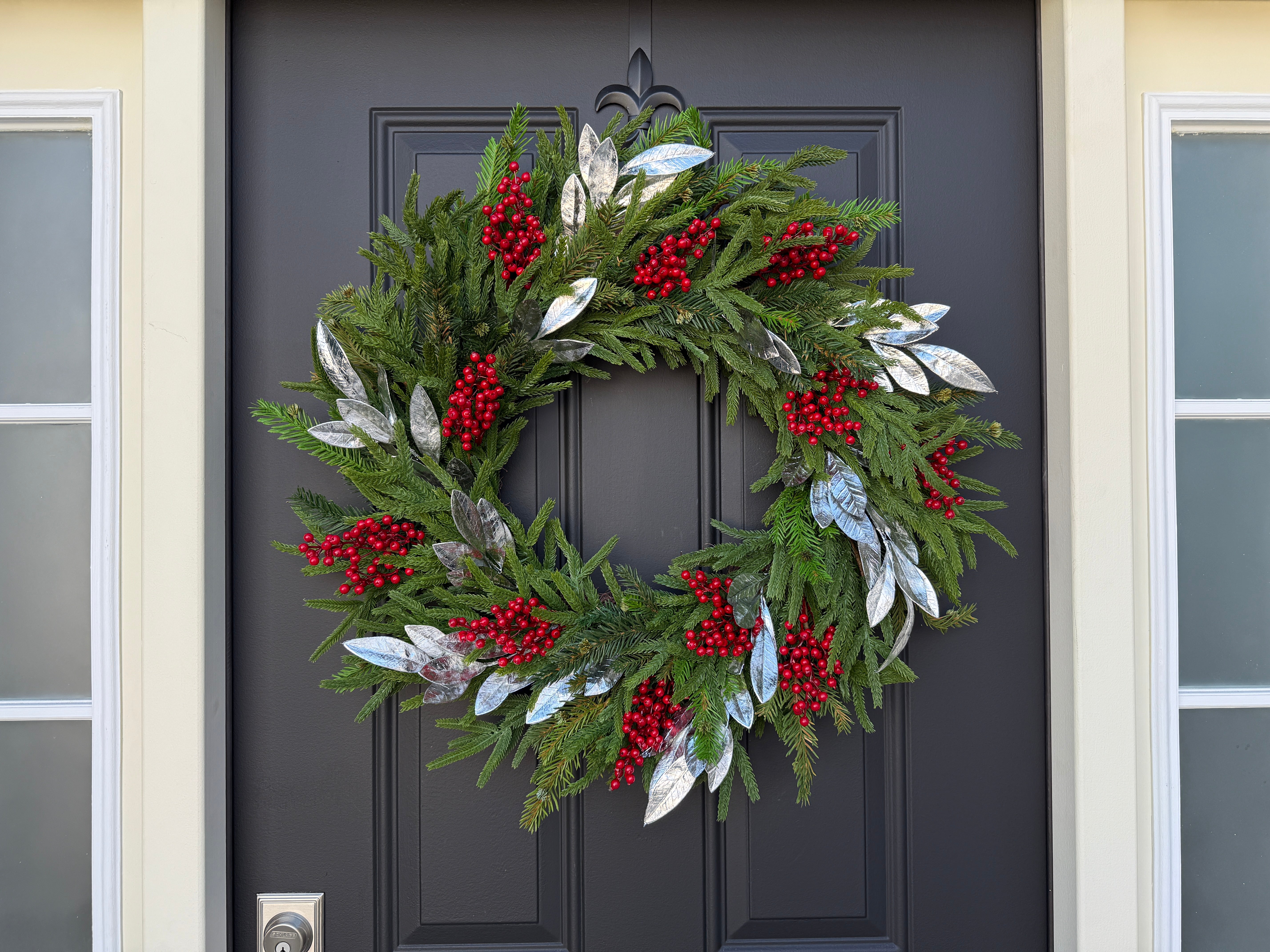 This handcrafted Christmas wreath blends the natural beauty of Norfolk pine with clusters of vivid red berries and shimmering silver bay leaves. The result is a refined holiday statement piece that feels both modern and timeless. Each wreath is carefully designed for fullness and dimension, creating an elegant mix of greenery and metallic tones that instantly elevate your door, mantel, or interior wall.