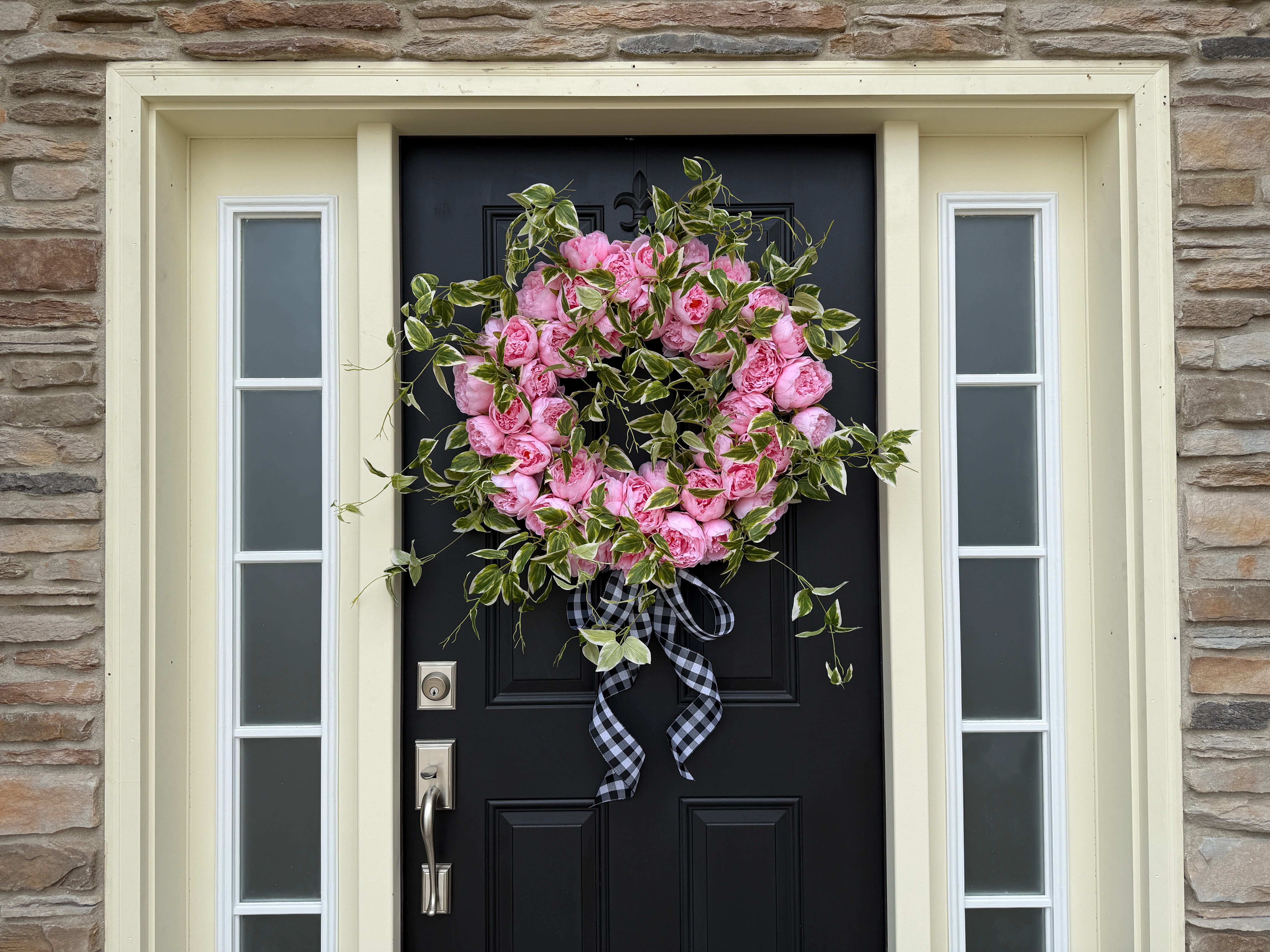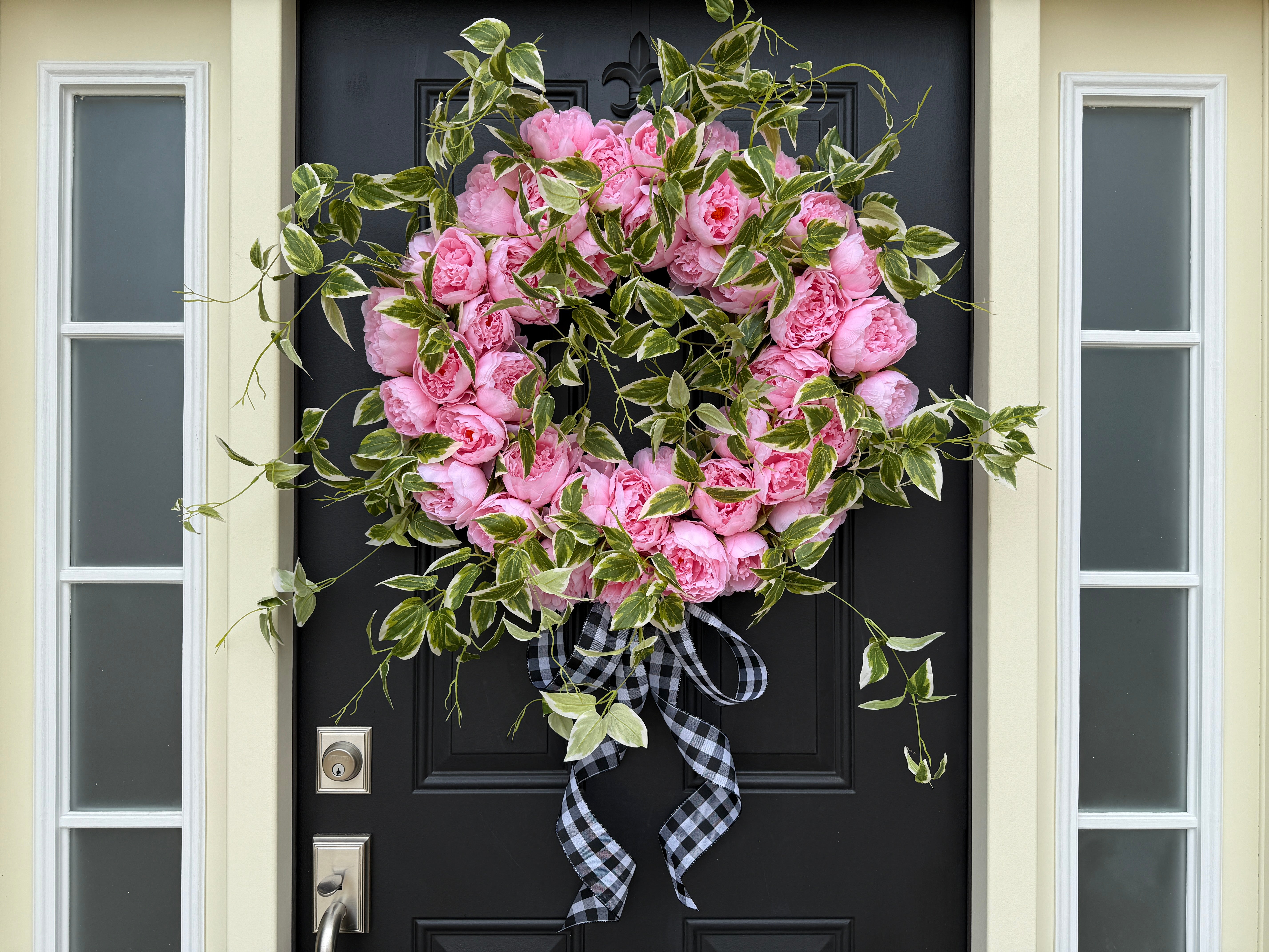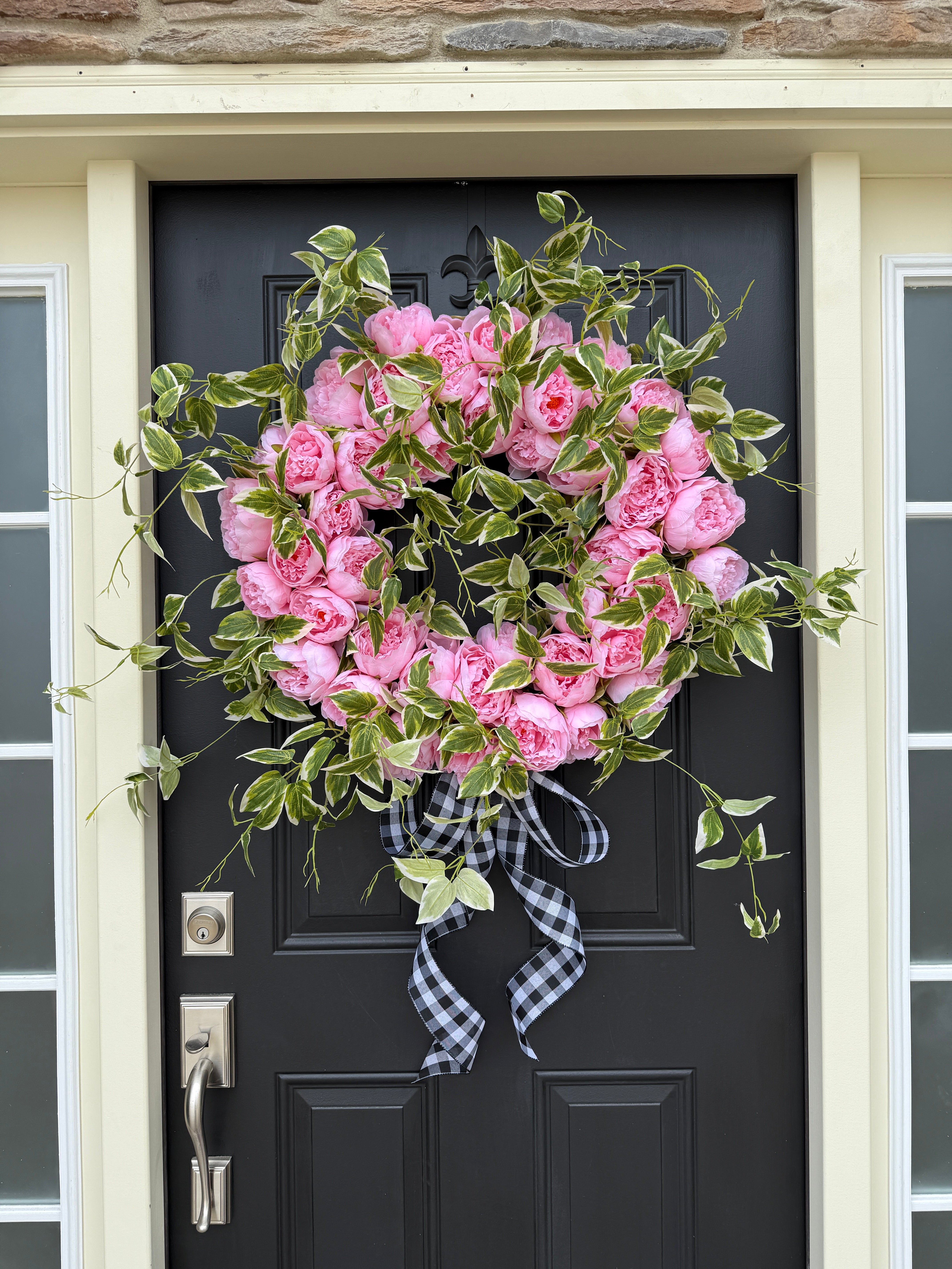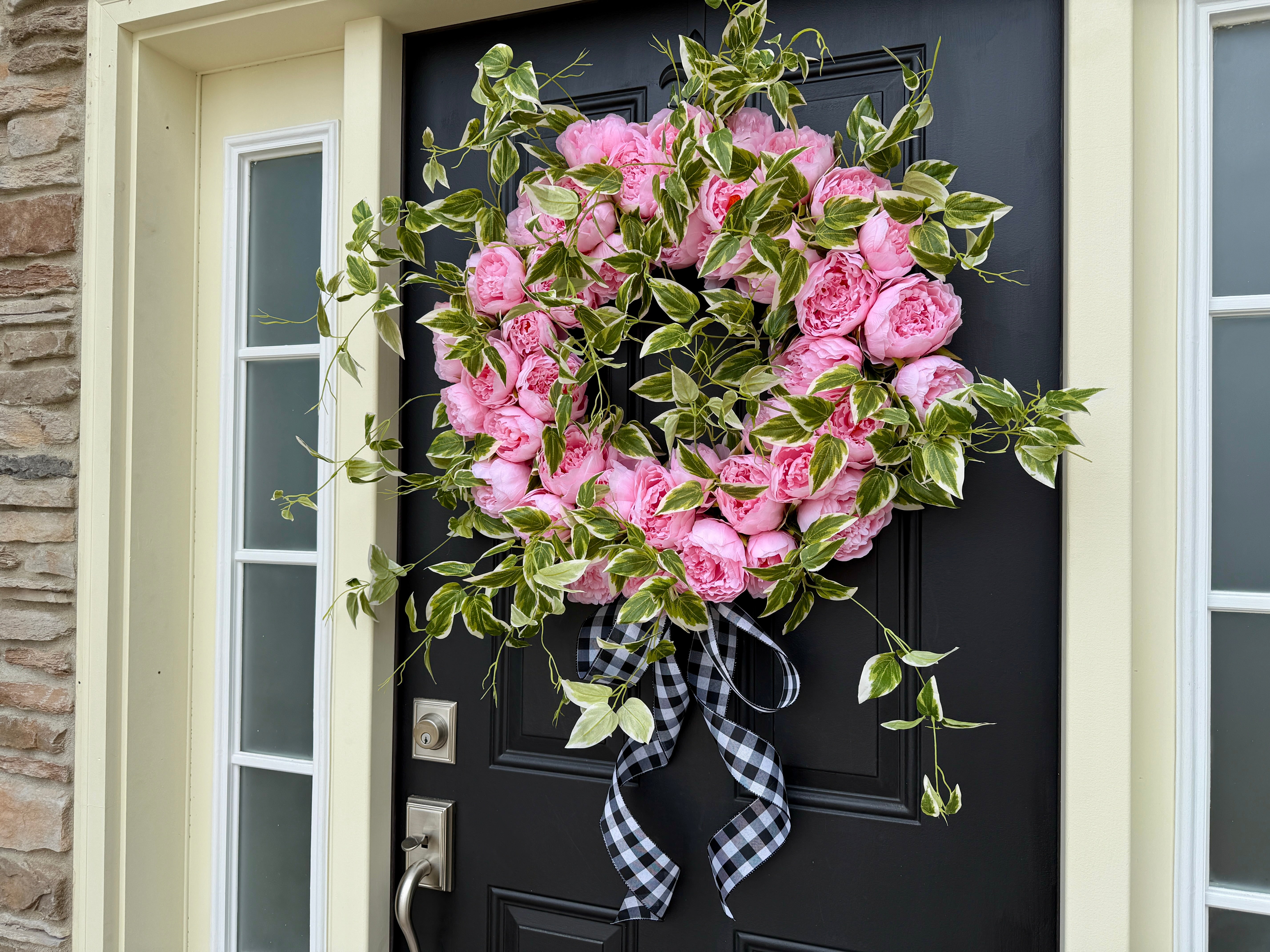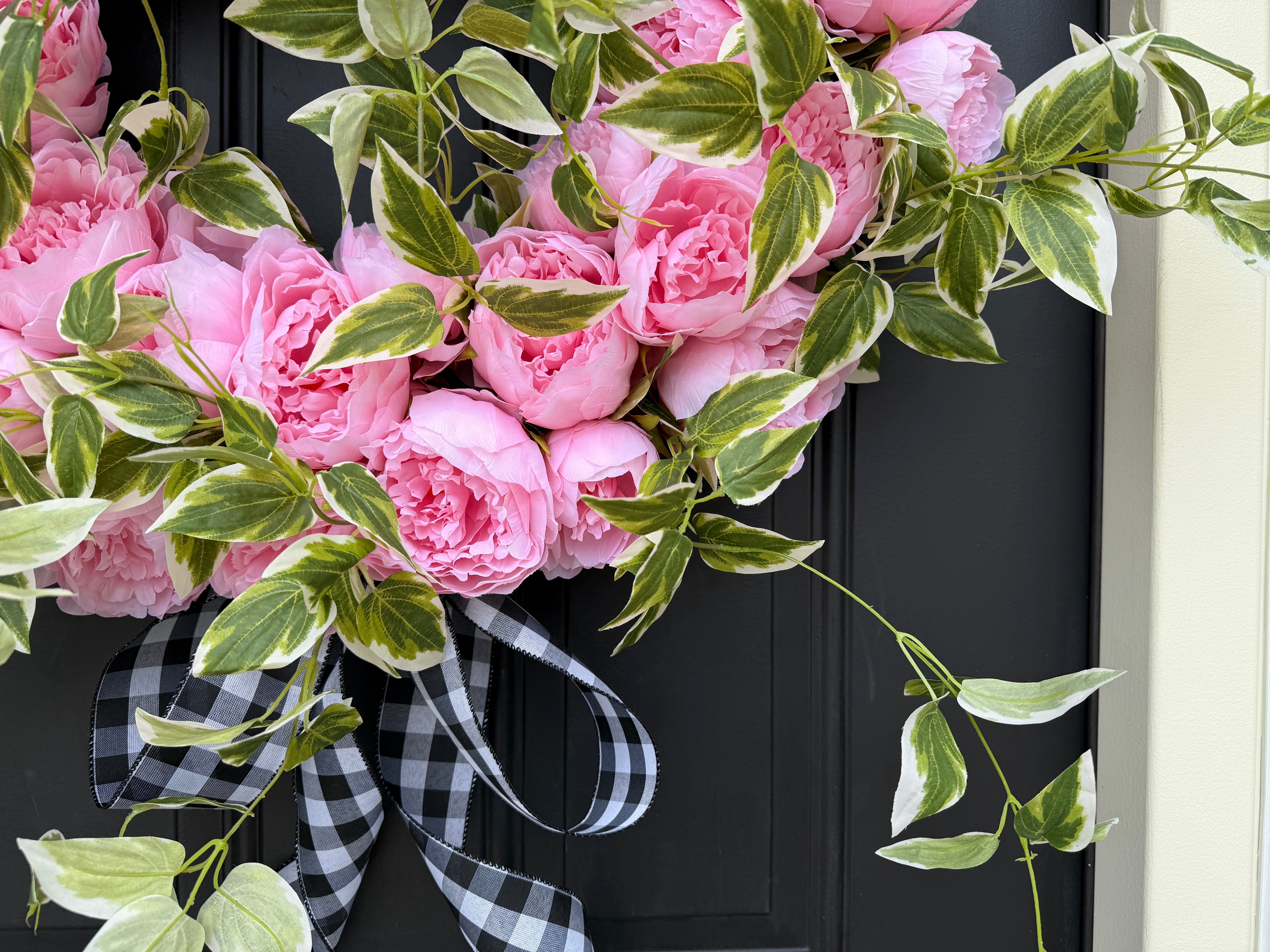 Pink Peony Front Door Wreath with Variegated Greenery & Gingham Ribbon