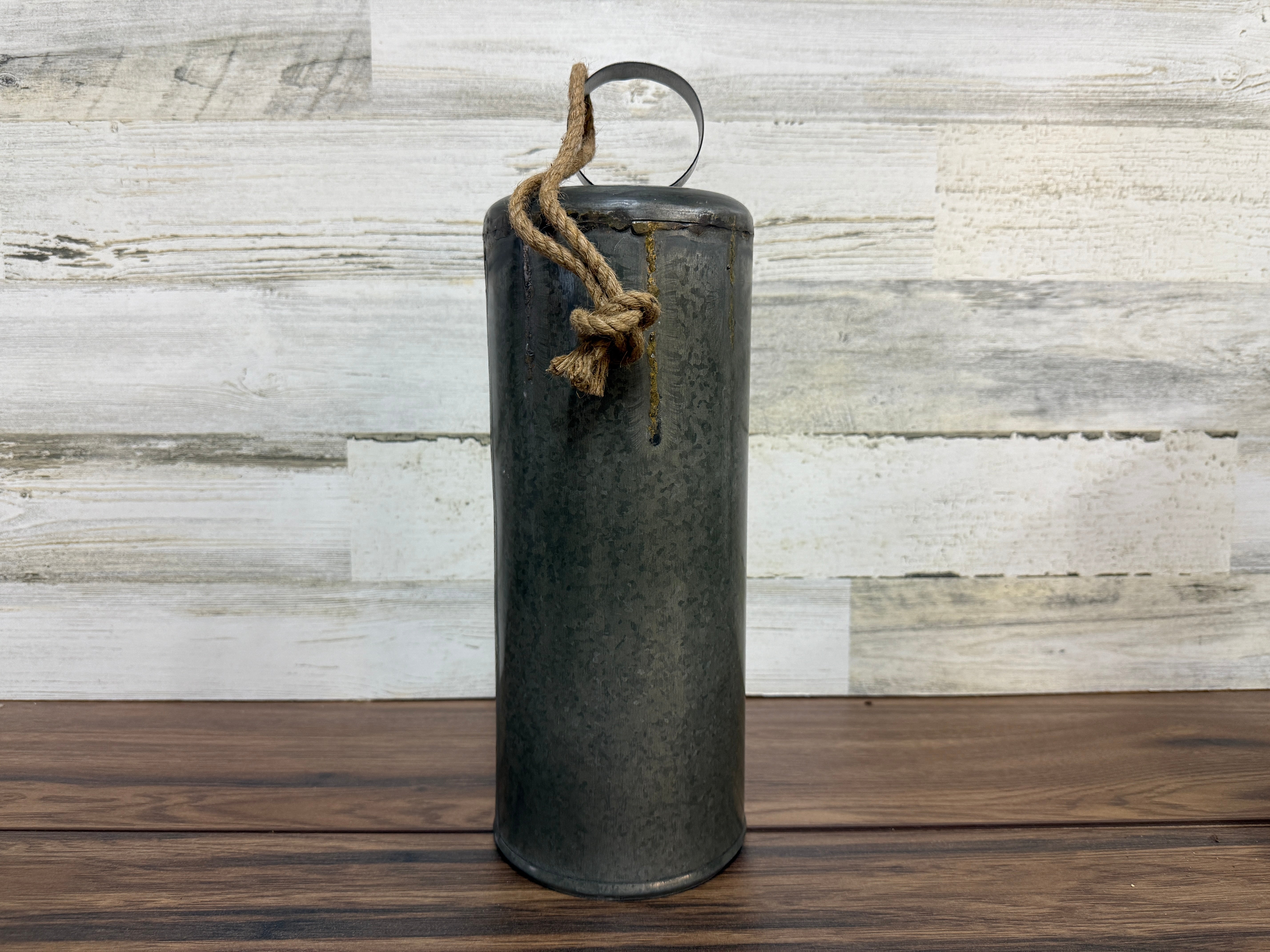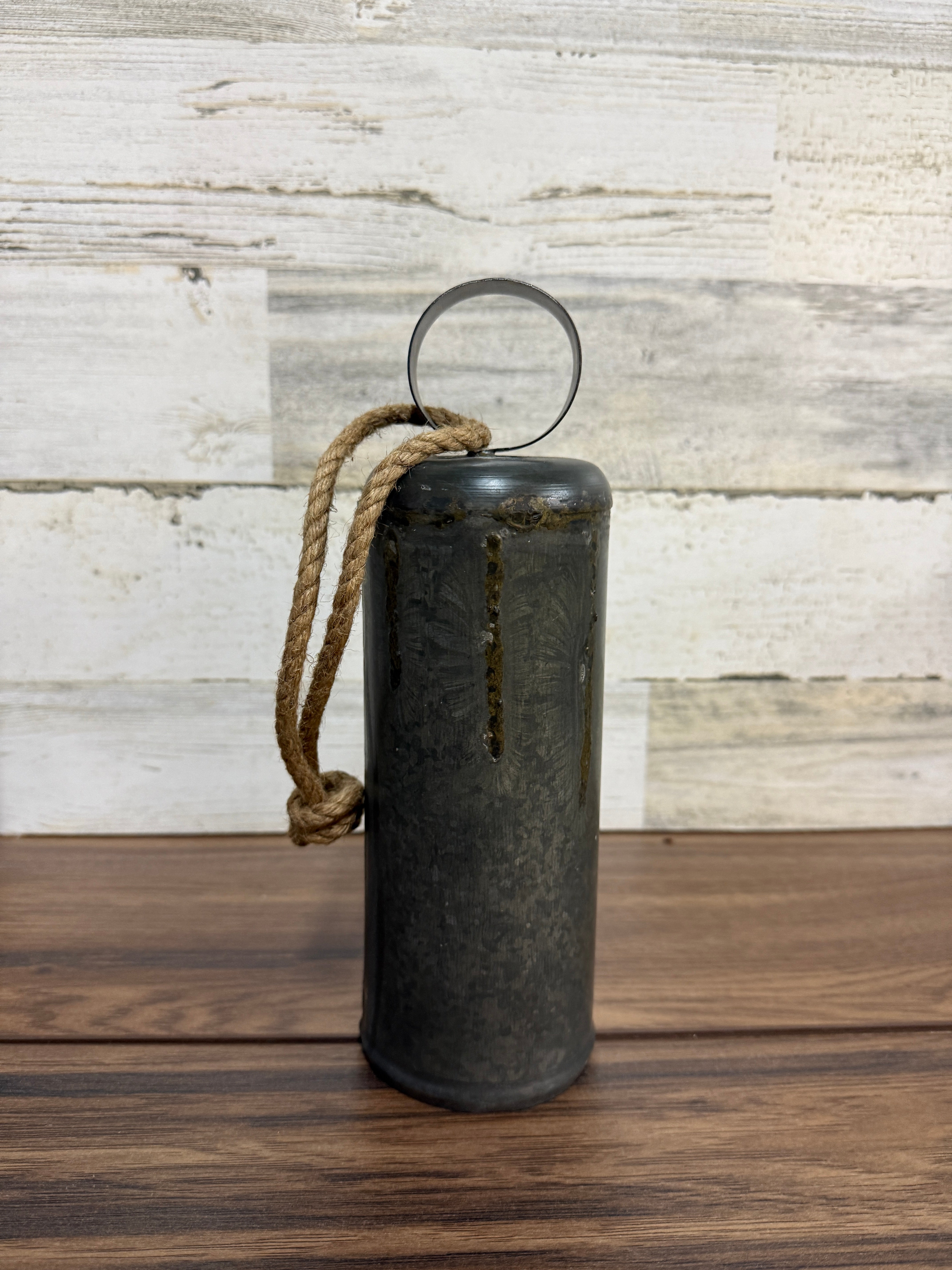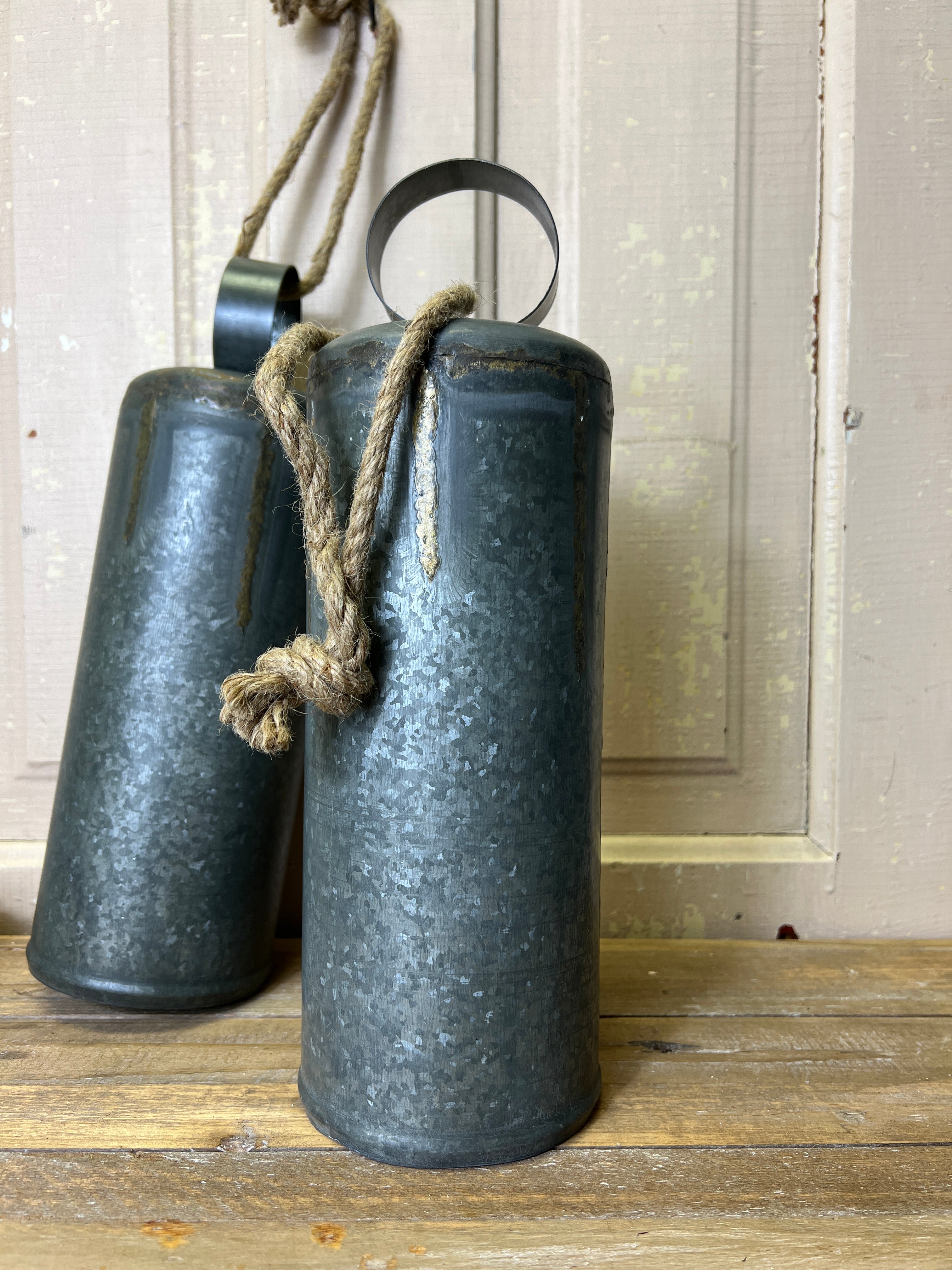 Bring a warm, rustic touch to your holiday decorating with these dark galvanized metal hanging bells. Their tall, narrow shape and beautifully weathered finish create an authentic vintage look that blends effortlessly with farmhouse, woodland, and classic Christmas styling. Each bell hangs from a thick jute rope, adding natural texture and timeless character to your mantel, tabletop arrangements, or wreath displays.