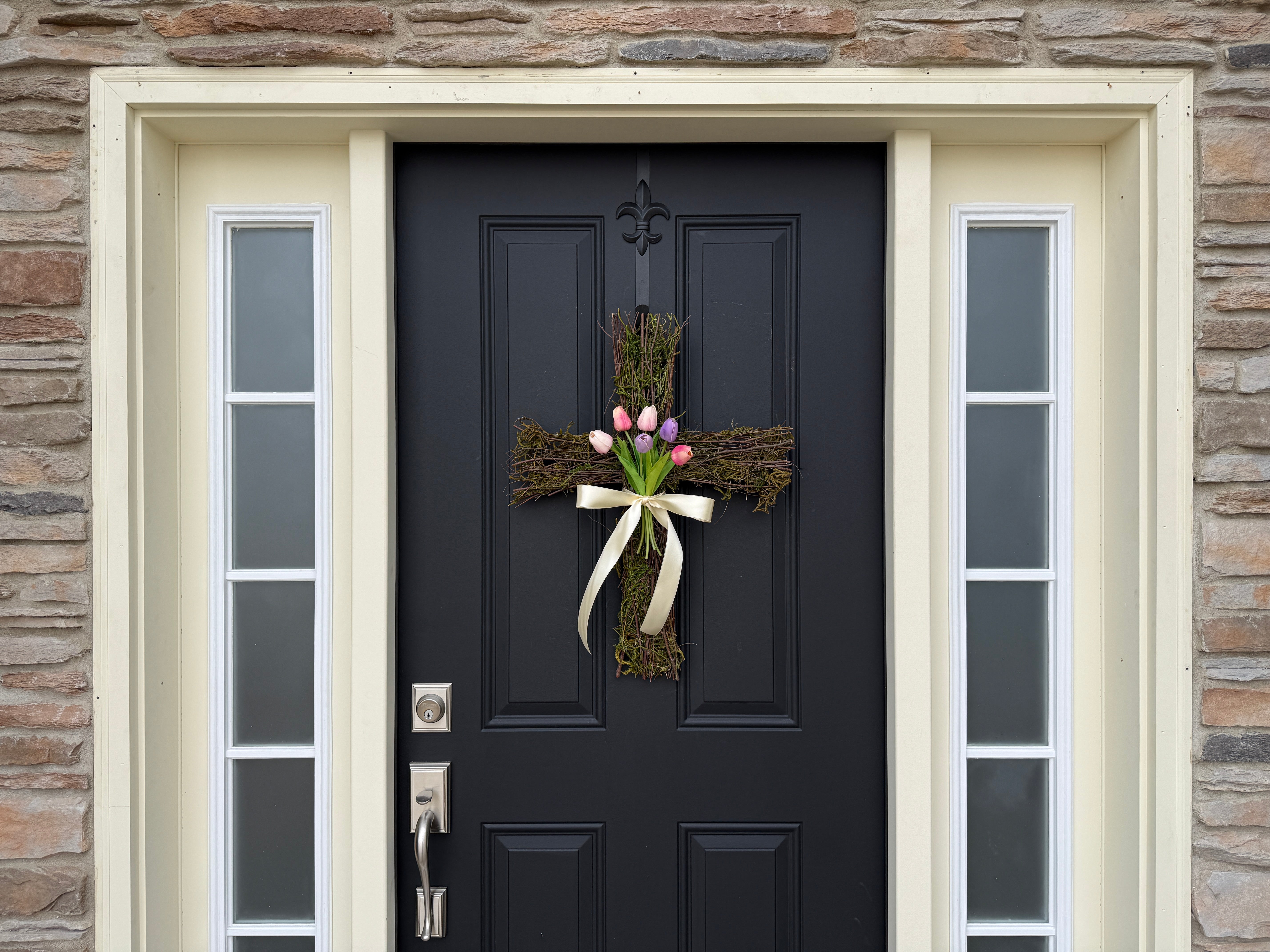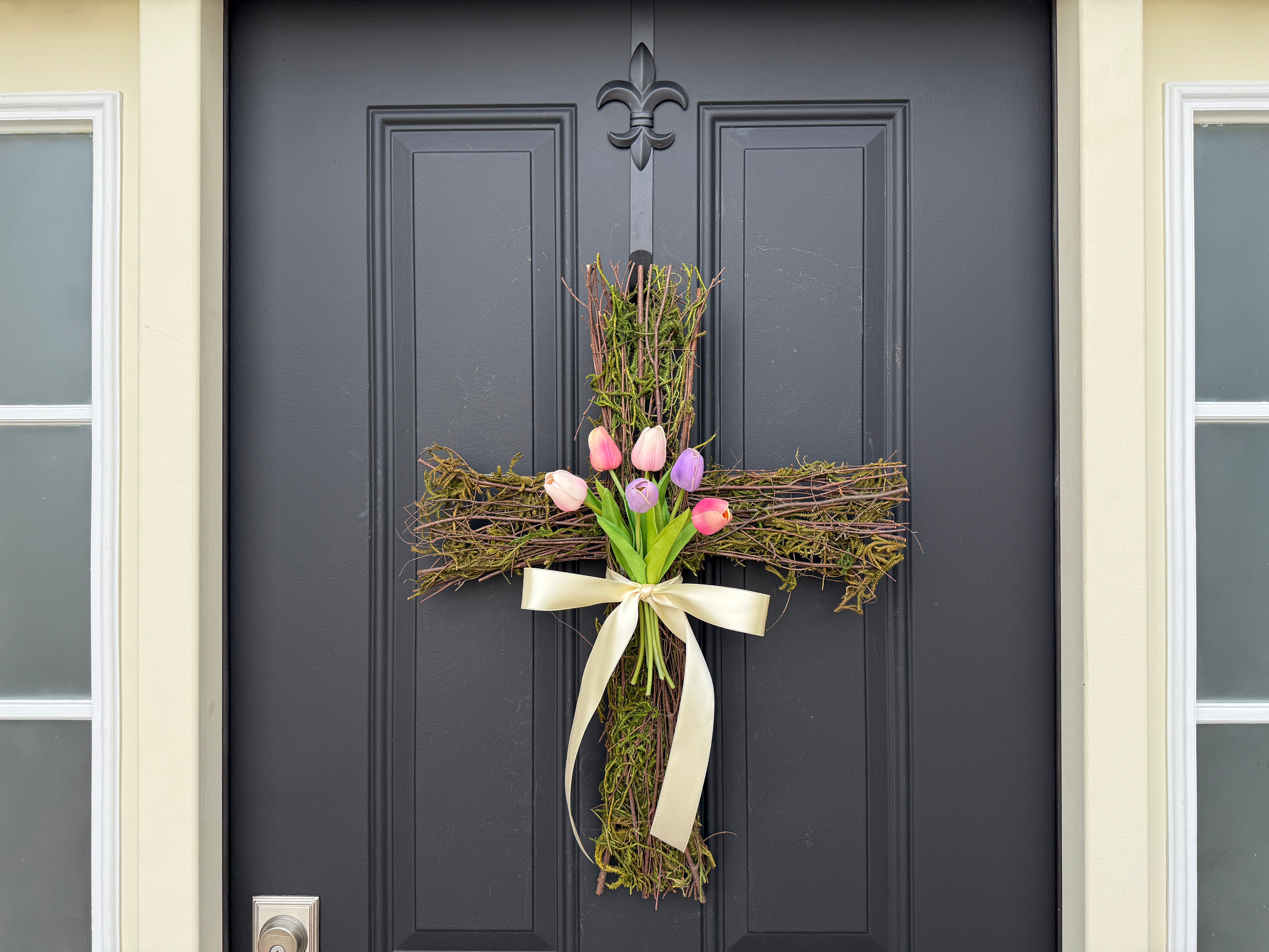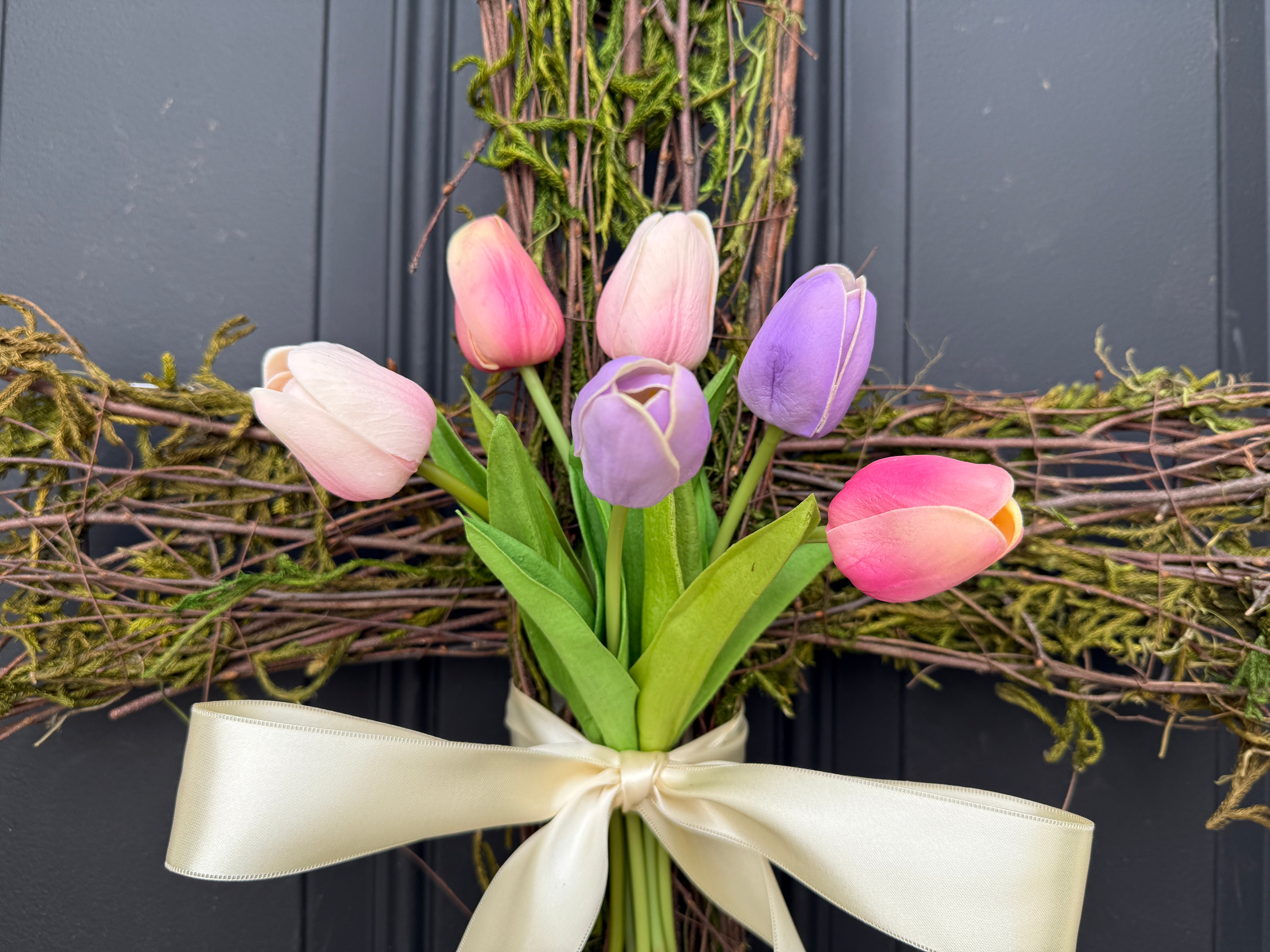 This handmade moss cross combines the timeless symbol of faith with the fresh beauty of spring tulips. The soft pink and purple blooms create a peaceful, elegant look that's perfect for honoring the Easter season or celebrating special occasions where you'd love to incorporate a touch of nature and the symbol of a cross.