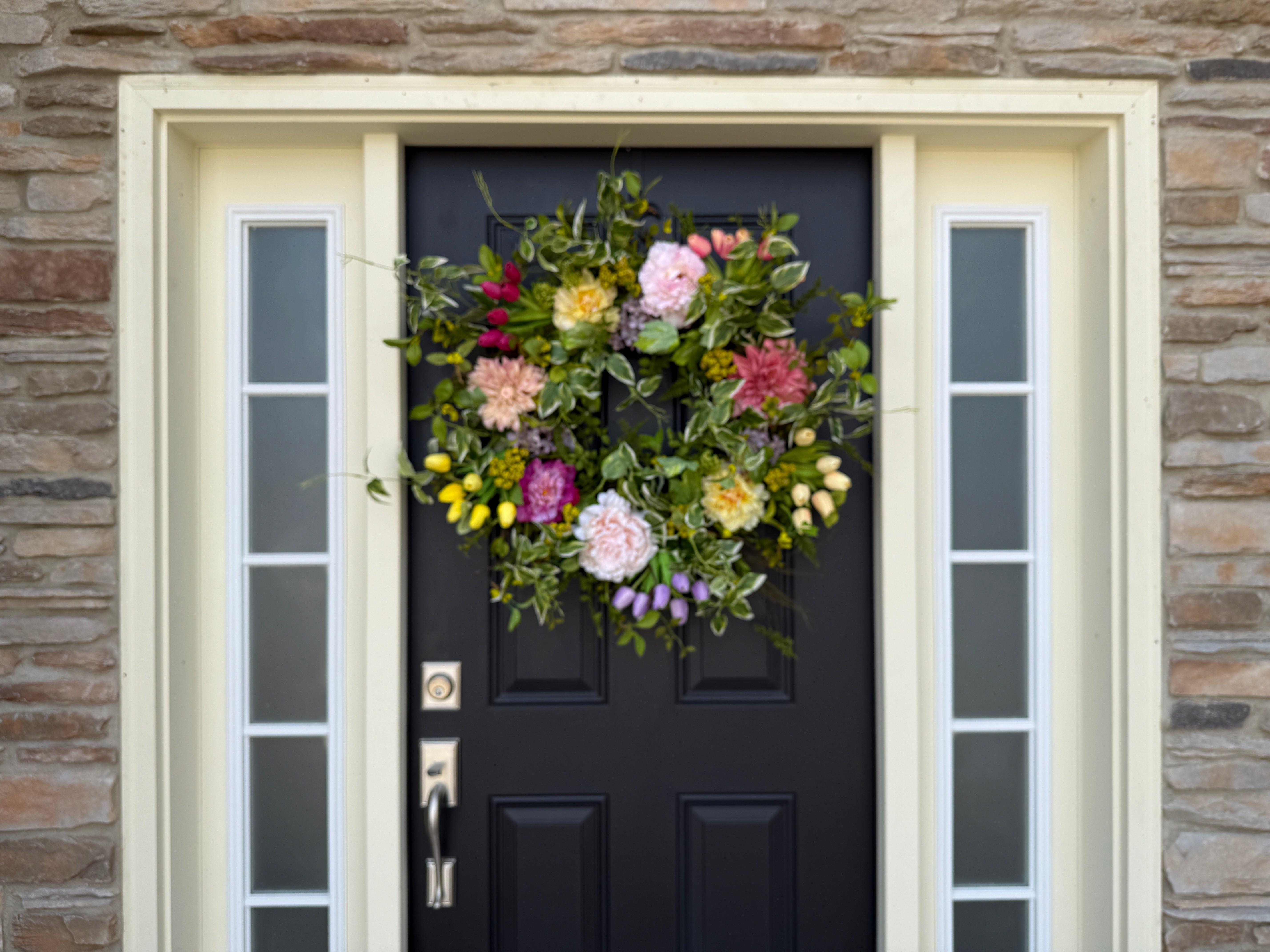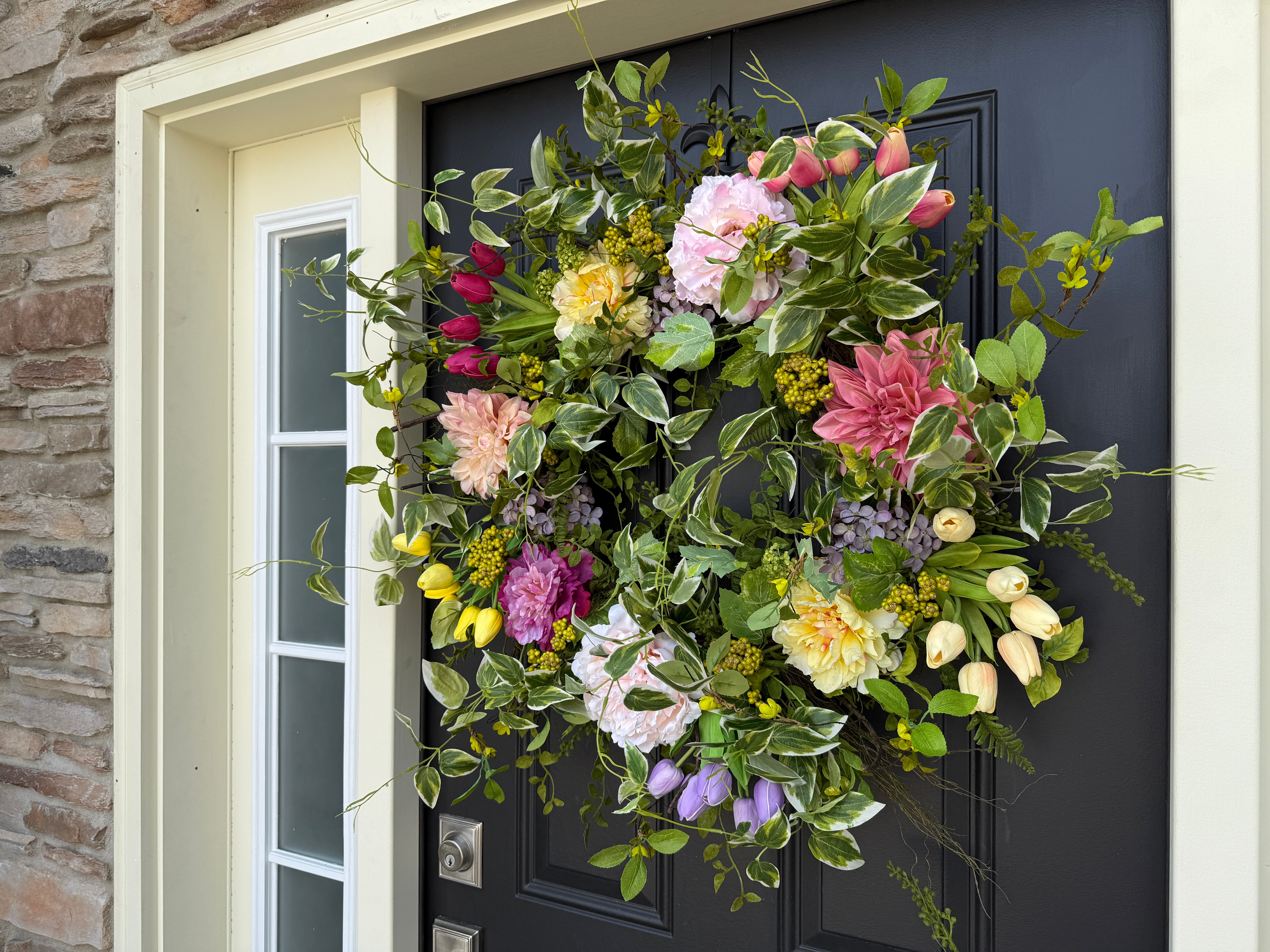 A joy to behold, our Springtime Garden Wreath celebrates the beauty of a garden in full bloom. Featuring a stunning mix of hydrangeas, peonies, and tulips in shades of soft cream, vibrant pink, buttery yellow, and lavender, this wreath evokes the joy of a sunny day spent strolling through flower-lined paths. Variegated greenery and delicate blossoms create a lush, layered look that’s perfect for welcoming guests and adding a cheerful touch to your home as the days grow longer and the flowers come alive. Suitable for indoor and covered outdoor use, and a perfect gift for Mother's Day.