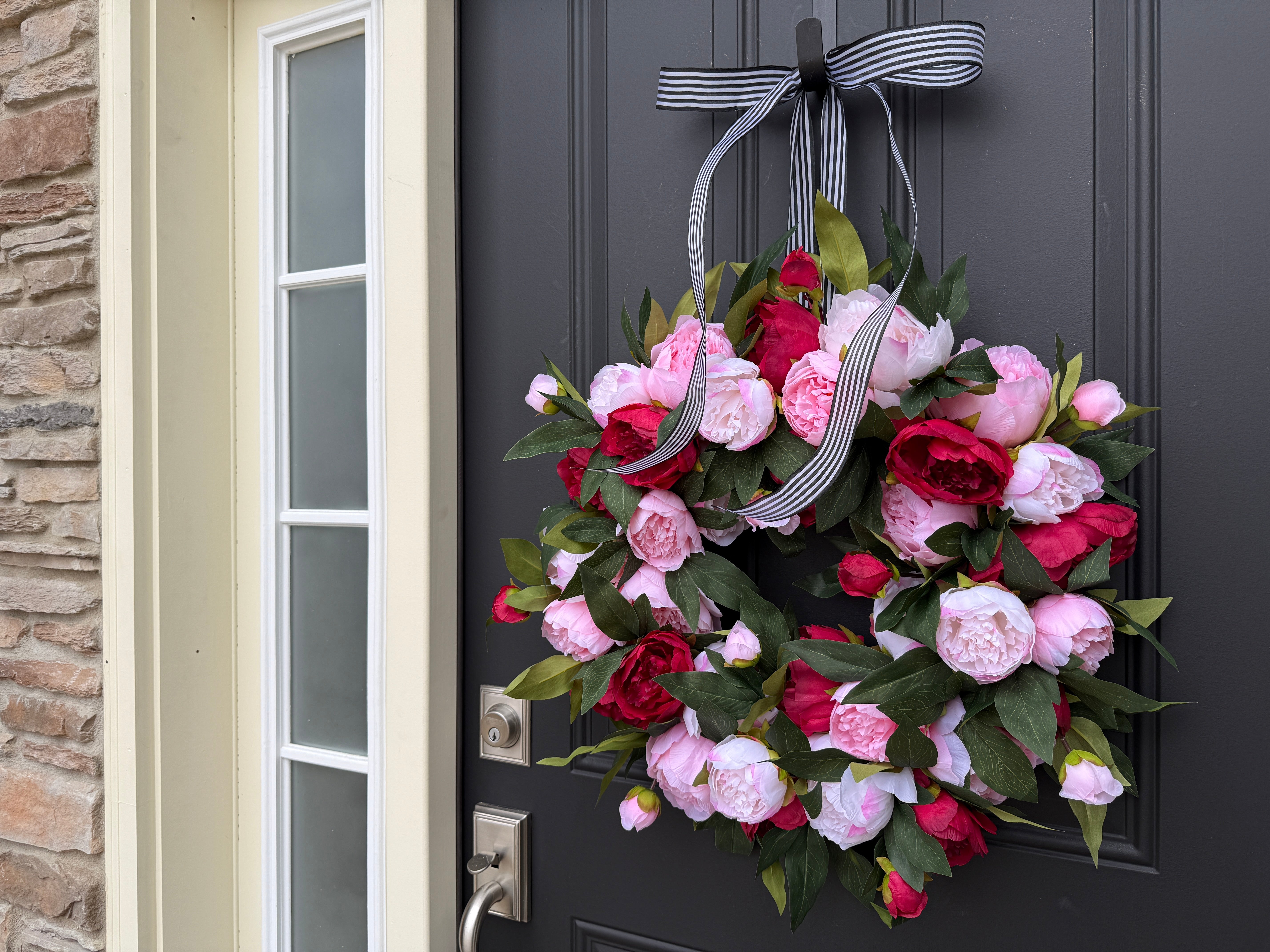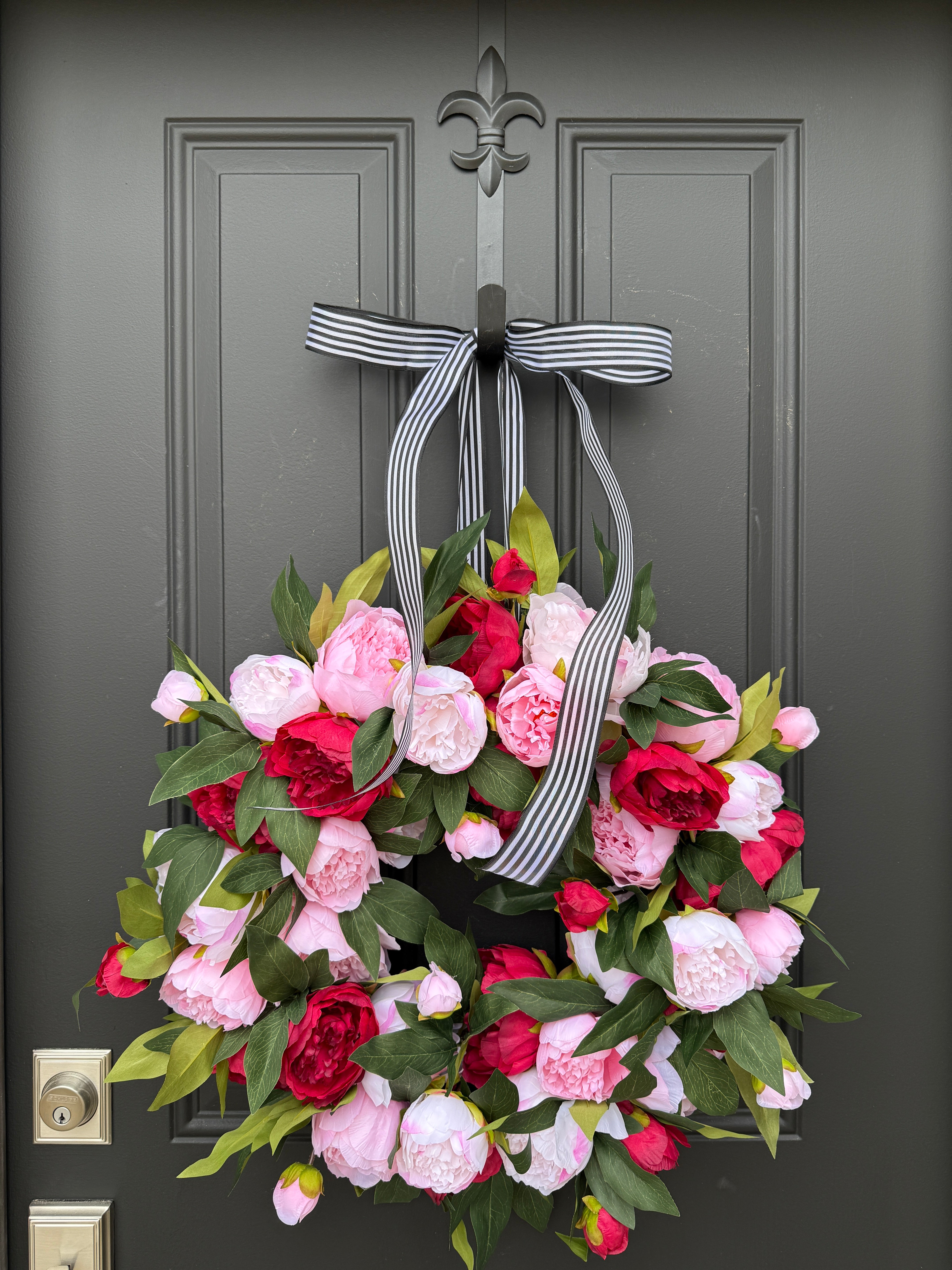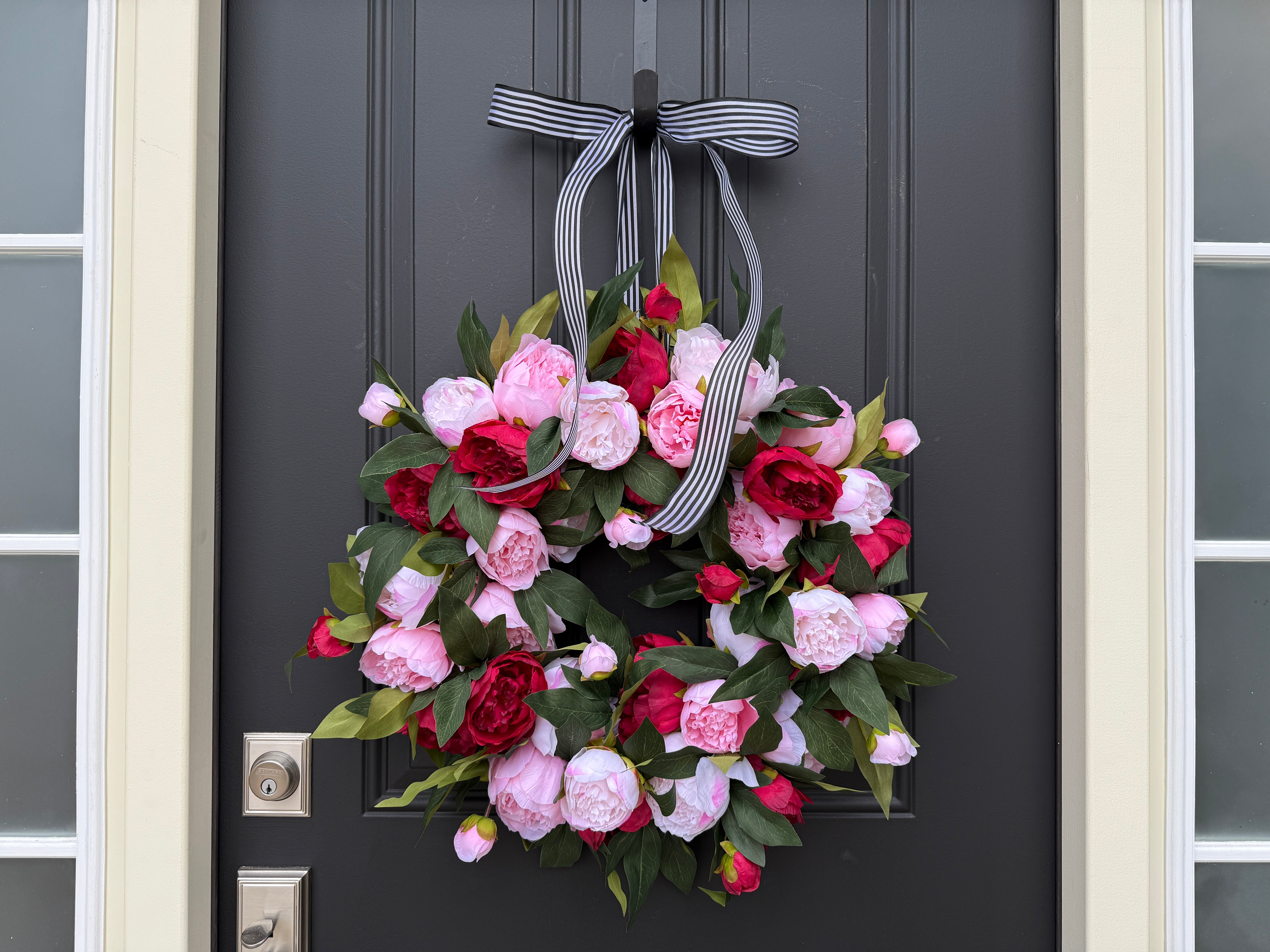 This handcrafted Valentine’s Day peony wreath features lush pink and red blooms arranged for a full, romantic look that instantly elevates your front door.