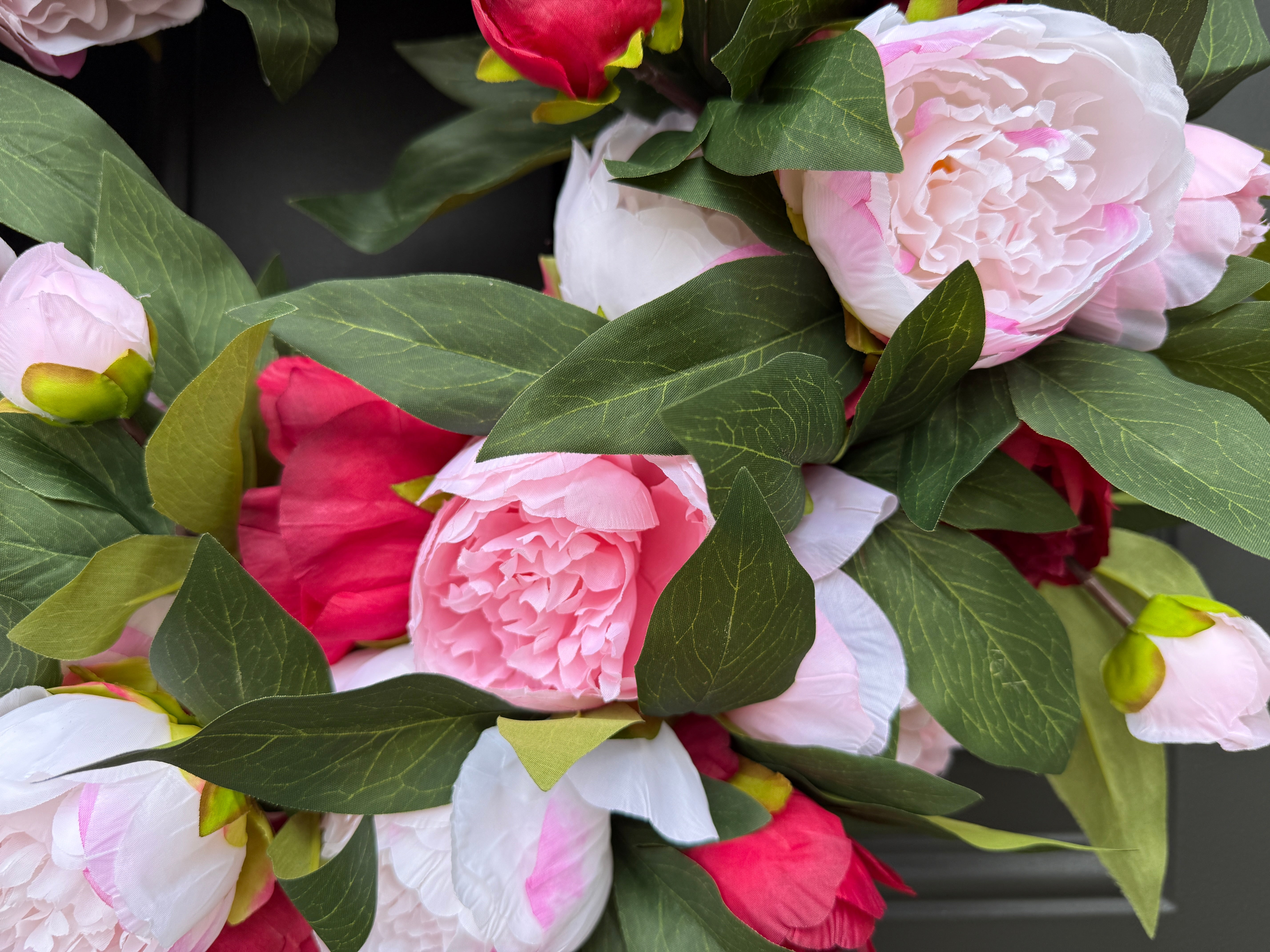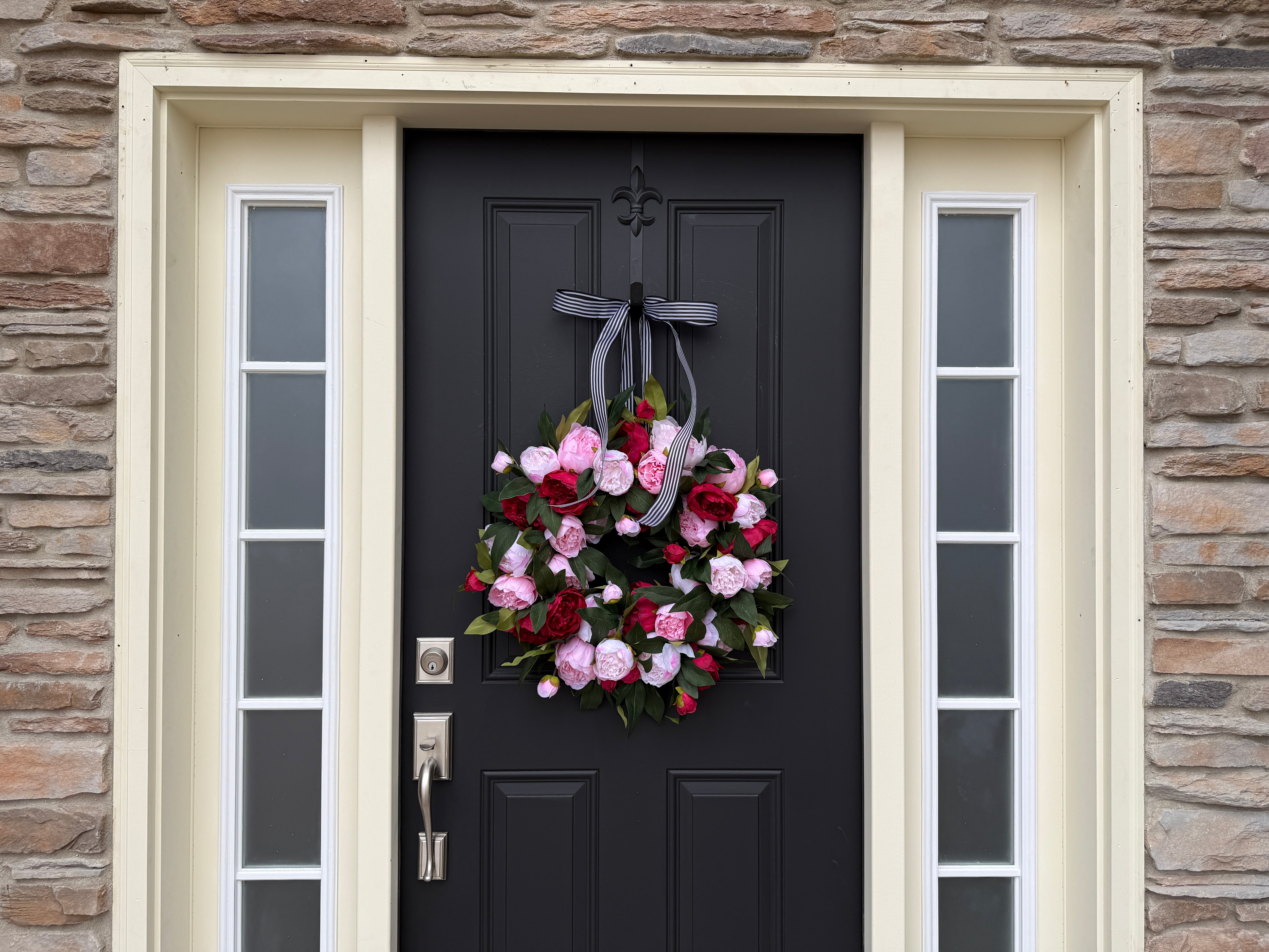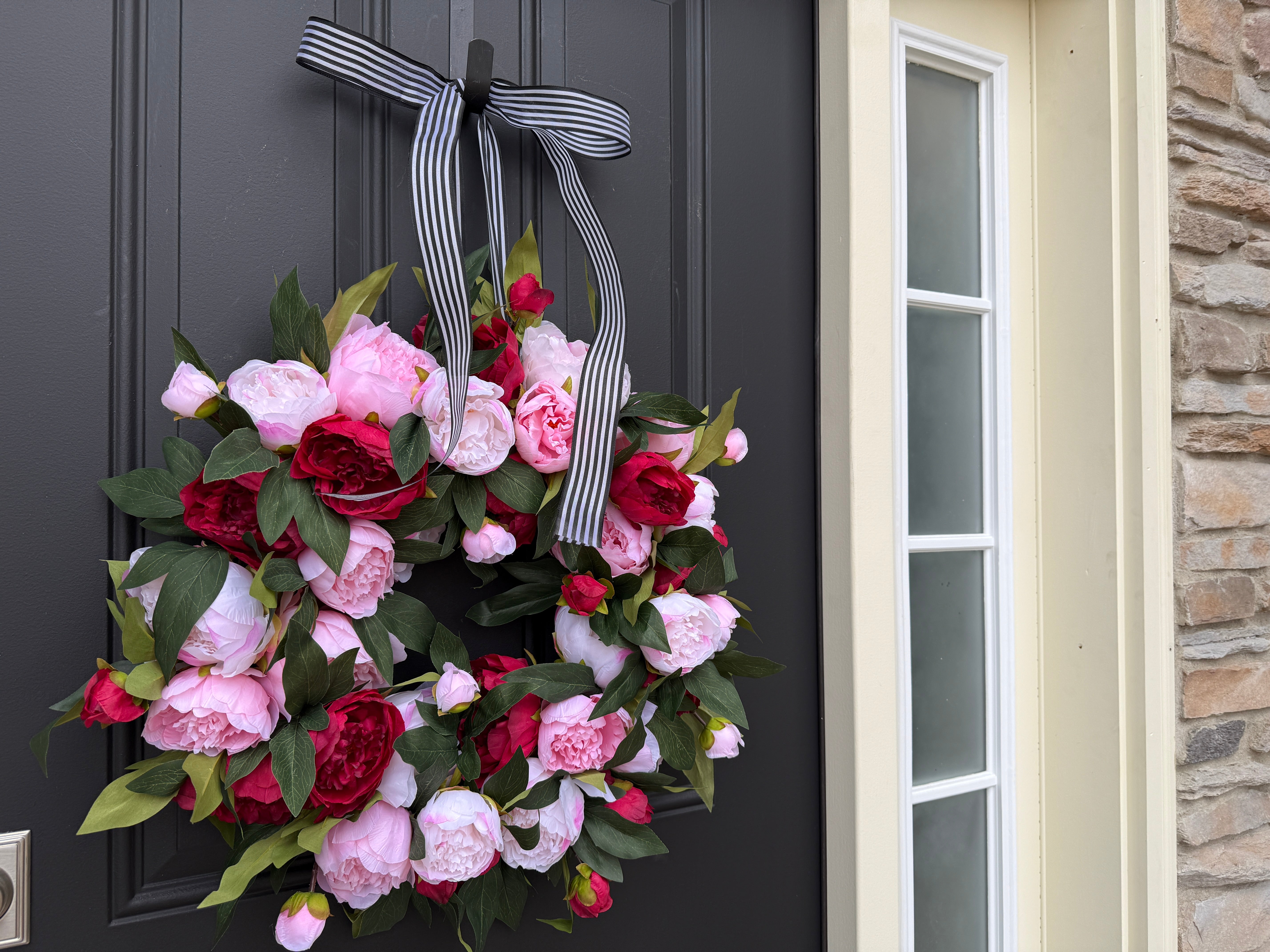 This handcrafted Valentine’s Day peony wreath features lush pink and red blooms arranged for a full, romantic look that instantly elevates your front door.