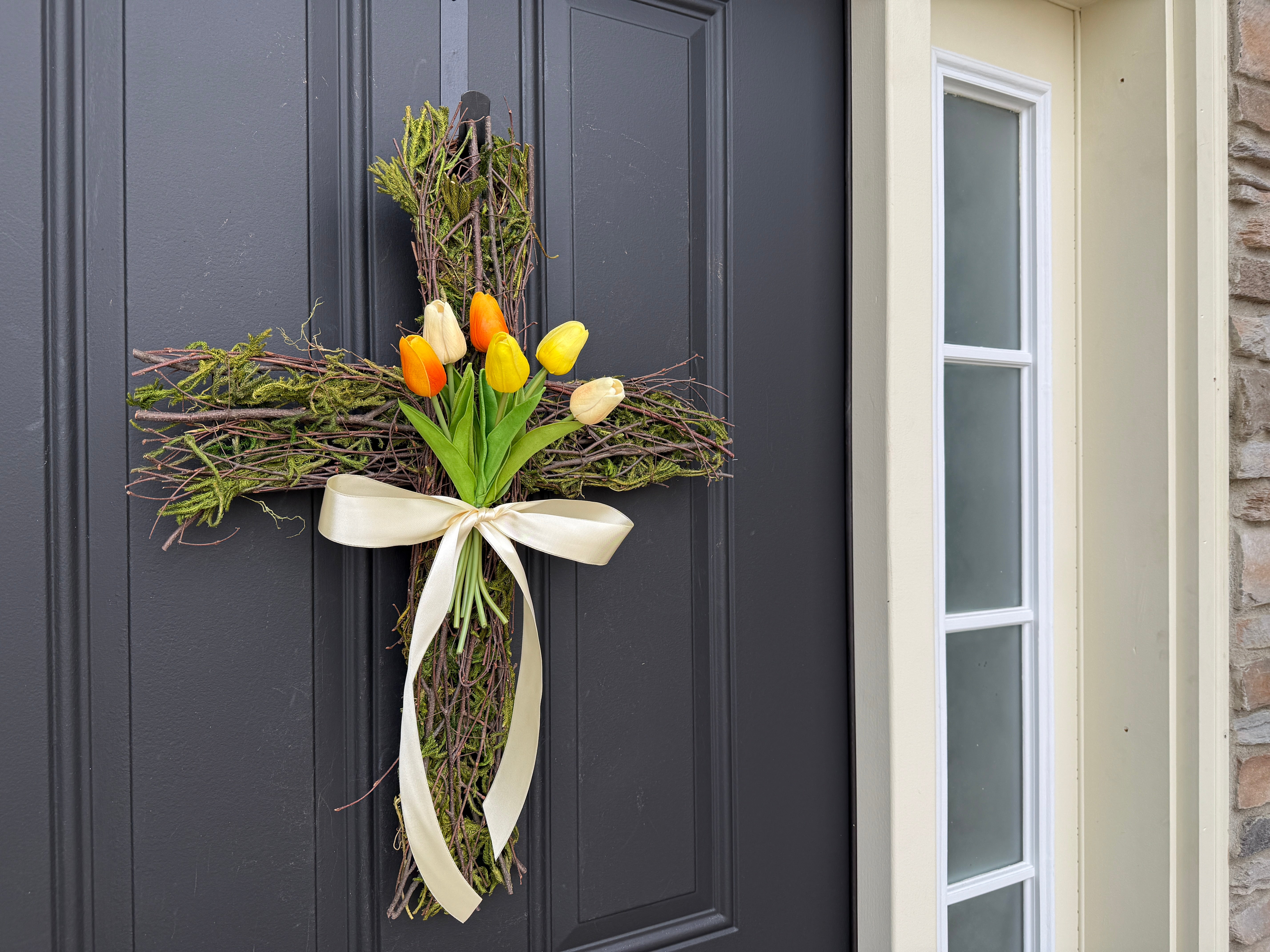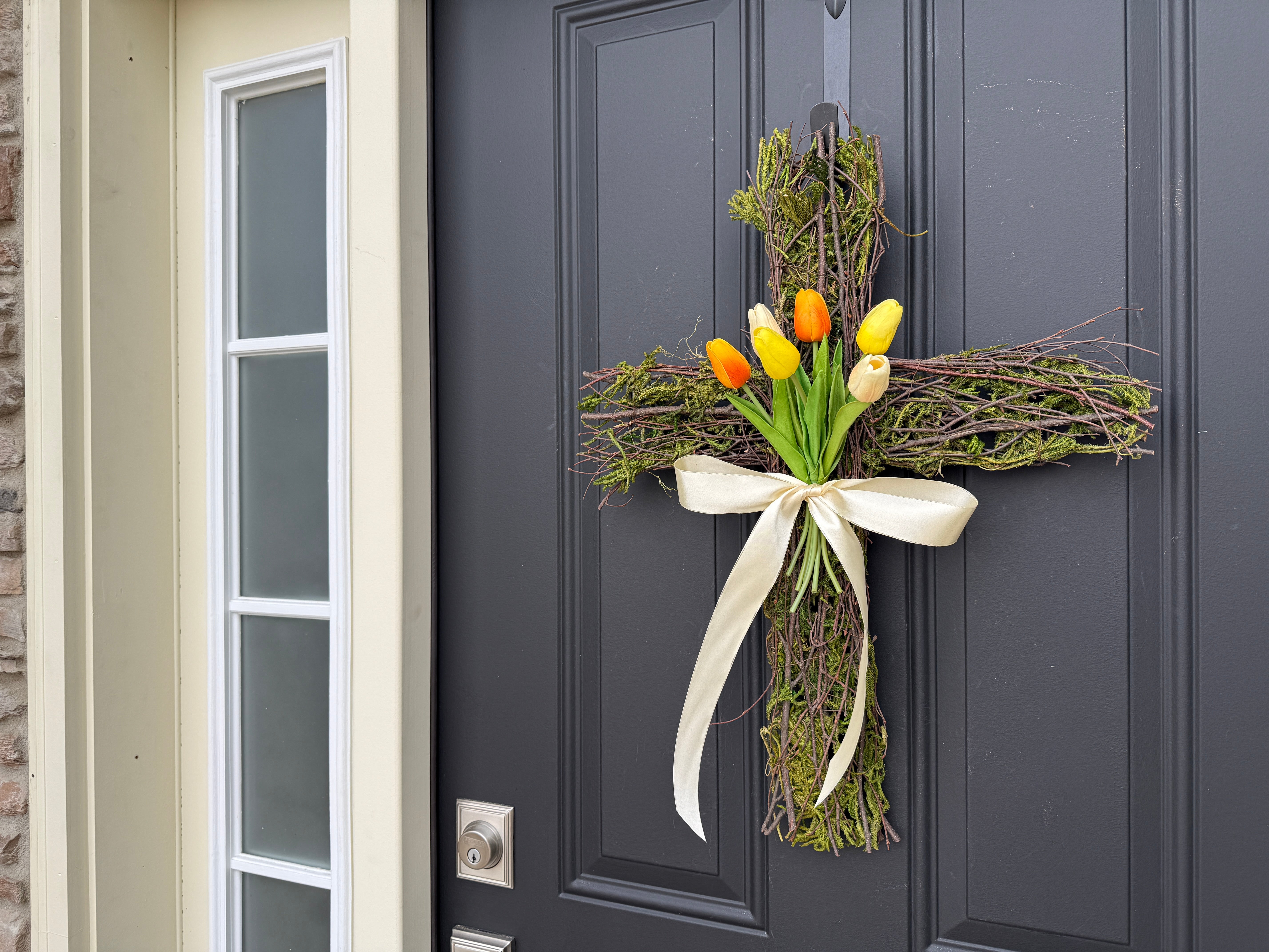 This handmade moss cross combines the timeless symbol of faith with the fresh beauty of spring tulips. The warm orange, yellow, and peach blooms create a cheerful, uplifting look that's perfect for honoring the Easter season or celebrating special occasions where you'd love to incorporate a touch of nature and the symbol of a cross.