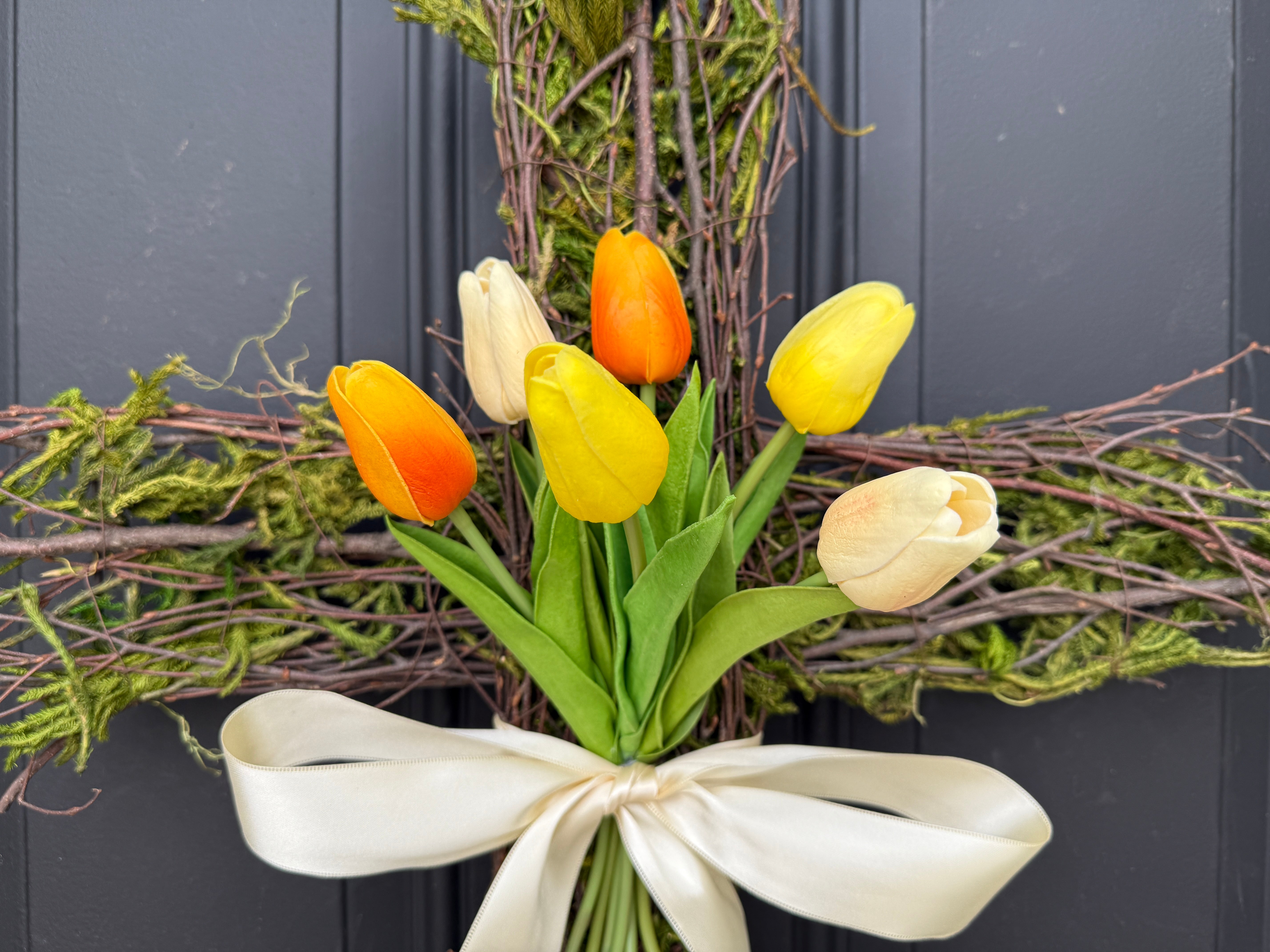 Celebrate the renewal of the season with this handcrafted Easter Natural Moss Cross. Featuring a natural twig cross wrapped in soft moss and adorned with six real-touch tulips in vibrant orange, yellow, and peach tones, finished with a flowing silk ribbon, this elegant piece brings meaningful beauty to your Easter décor.