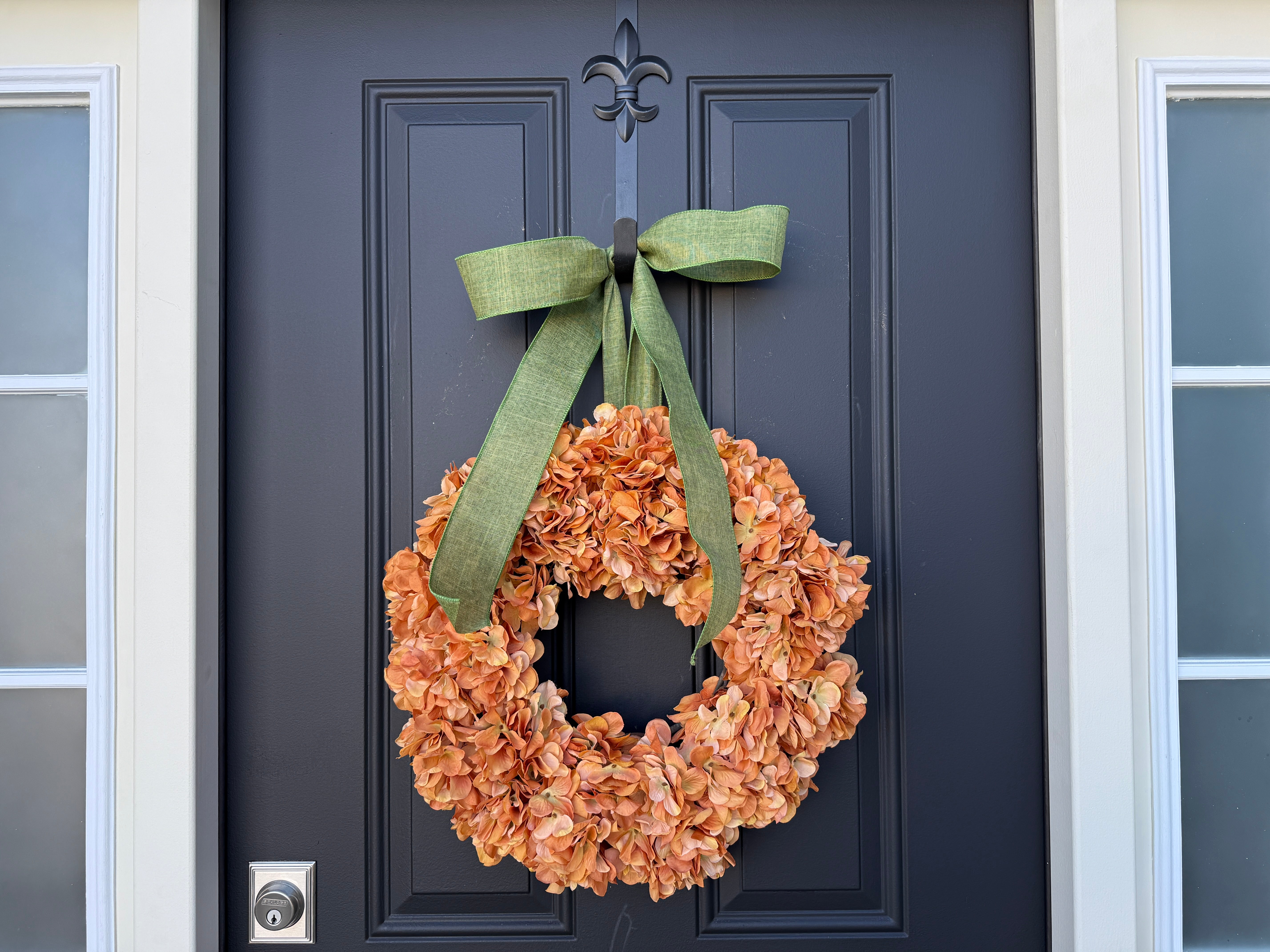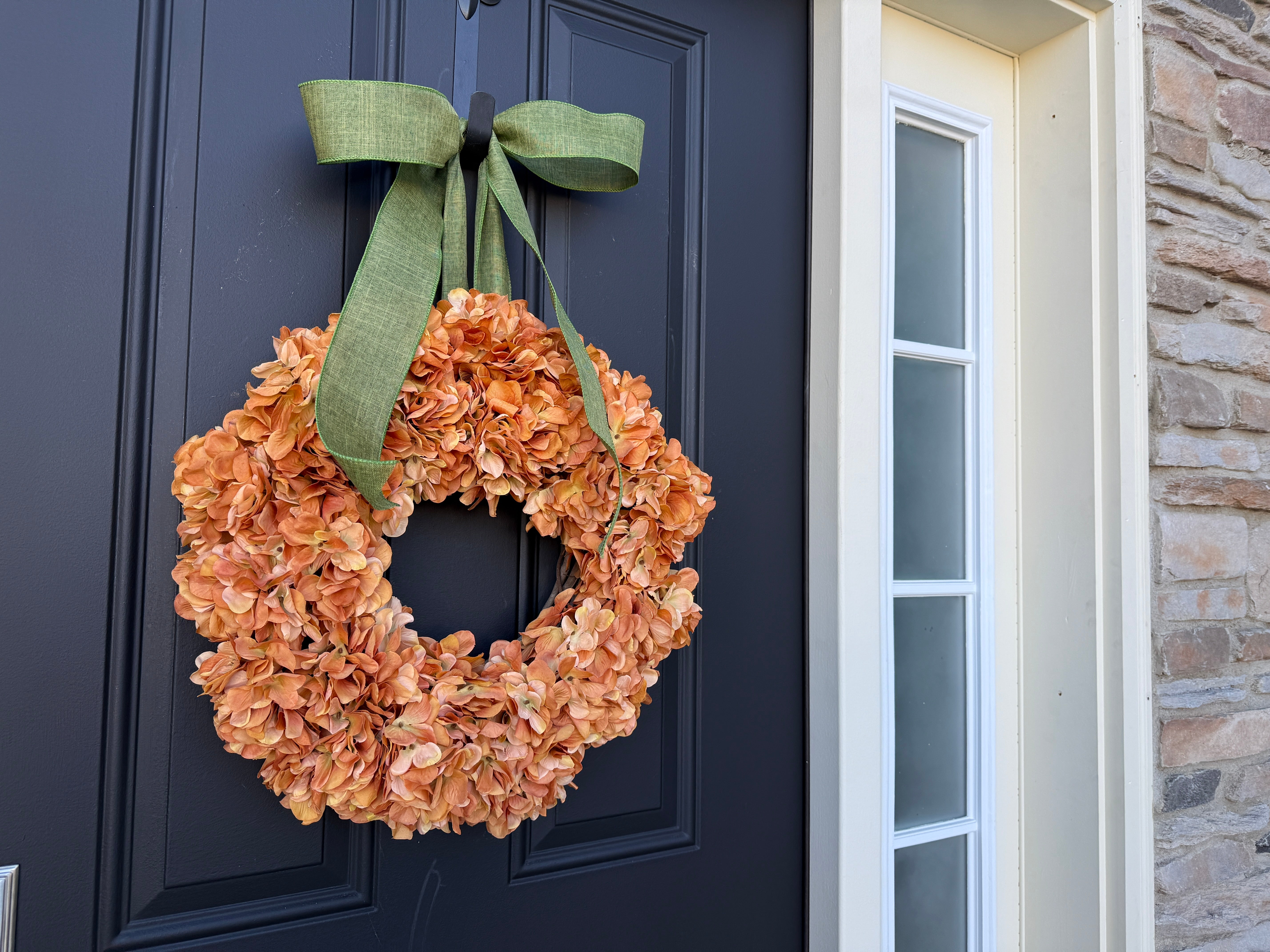 Burnt Orange Hydrangea Wreath with Green Linen Bow – Fall Door Décor |