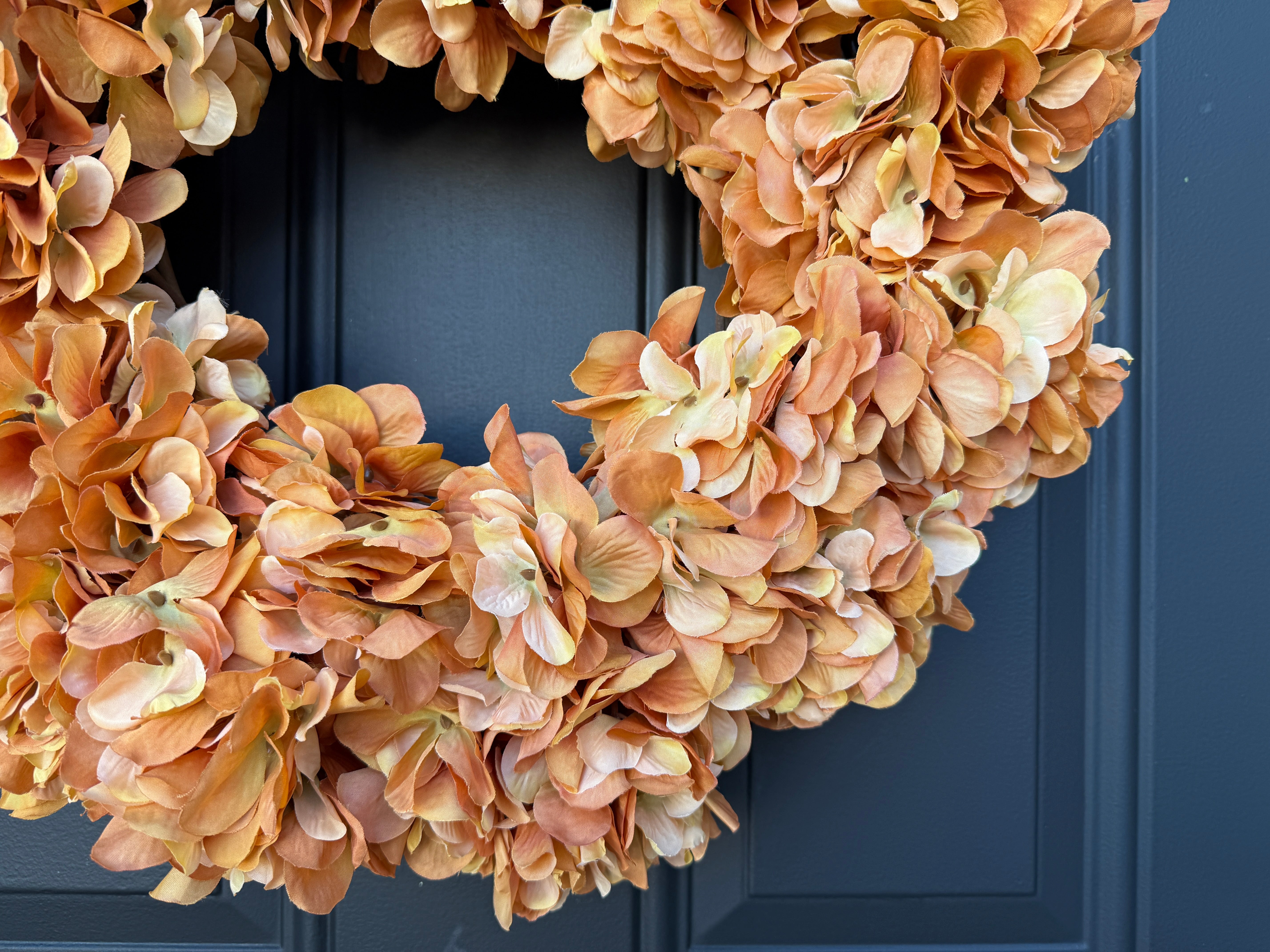 Celebrate autumn’s natural warmth with this lush wreath of lifelike burnt orange hydrangeas, accented by a wide green linen bow. Each petal captures the essence of the harvest season, adding soft texture and inviting color to your front door.