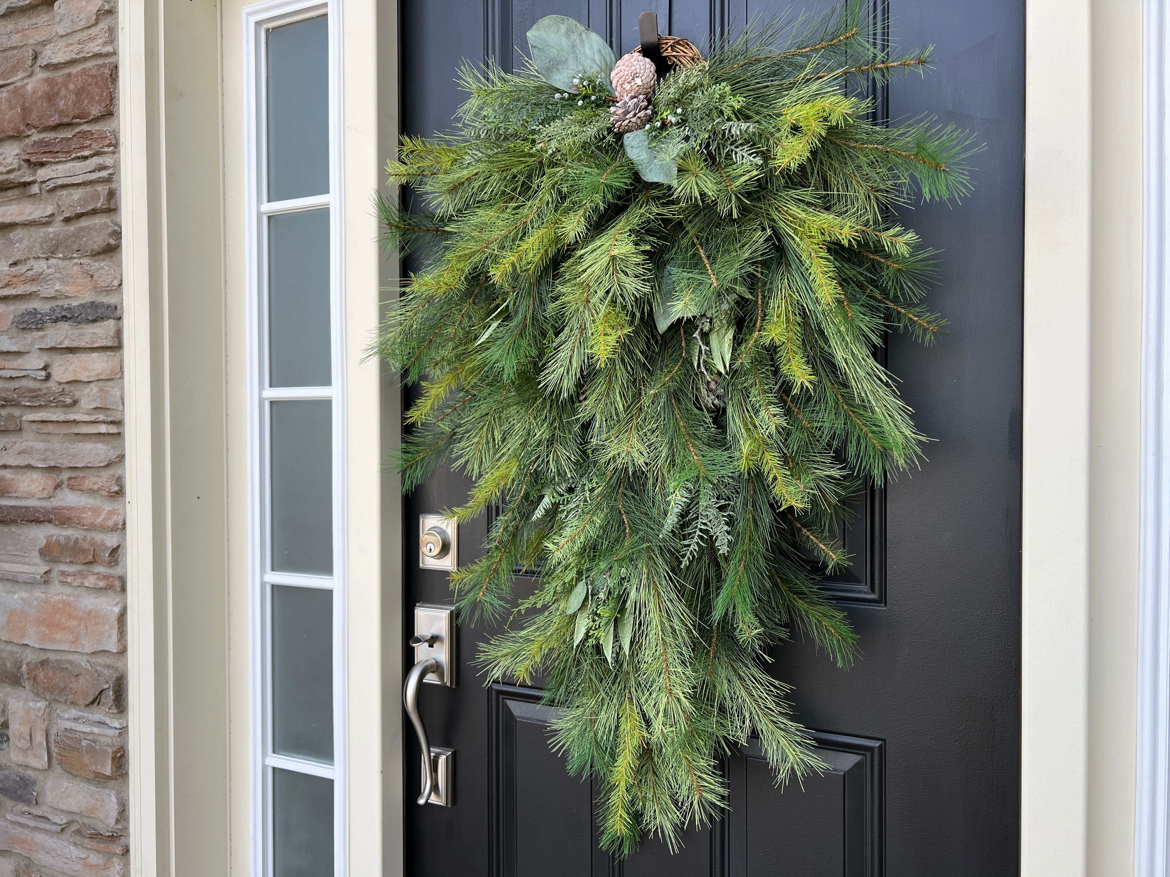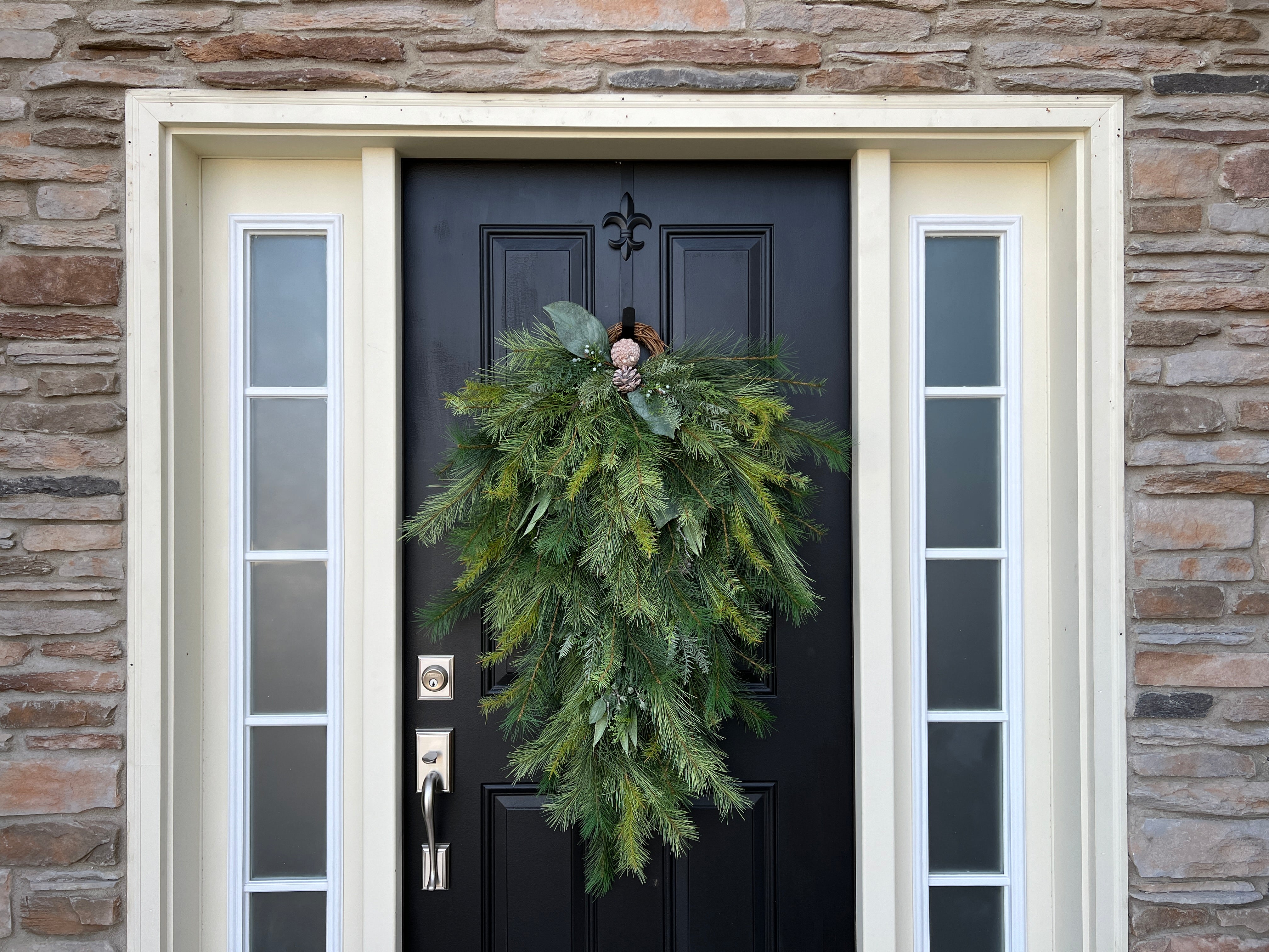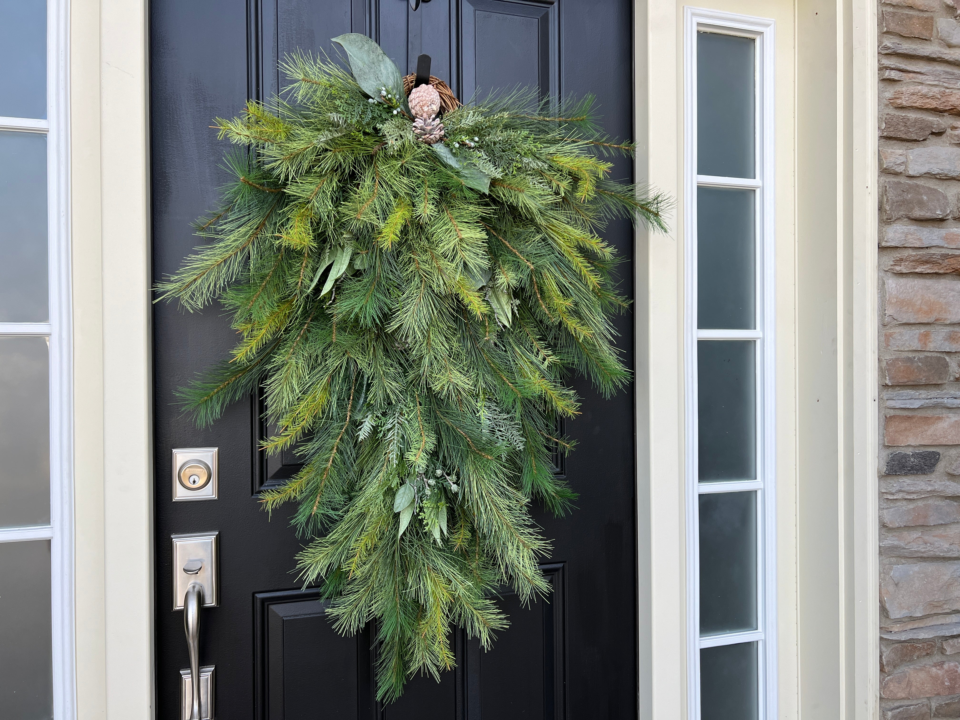 Welcome the wonder of Christmas with this full, cascading teardrop swag crafted from a beautiful blend of mixed pines. Each branch drapes softly, creating that gathered-from-the-woods look that instantly warms your entryway. The texture is rich, the greenery lifelike, and the overall shape beautifully elongated — the kind of festive décor that feels as if winter itself paused to admire it.
