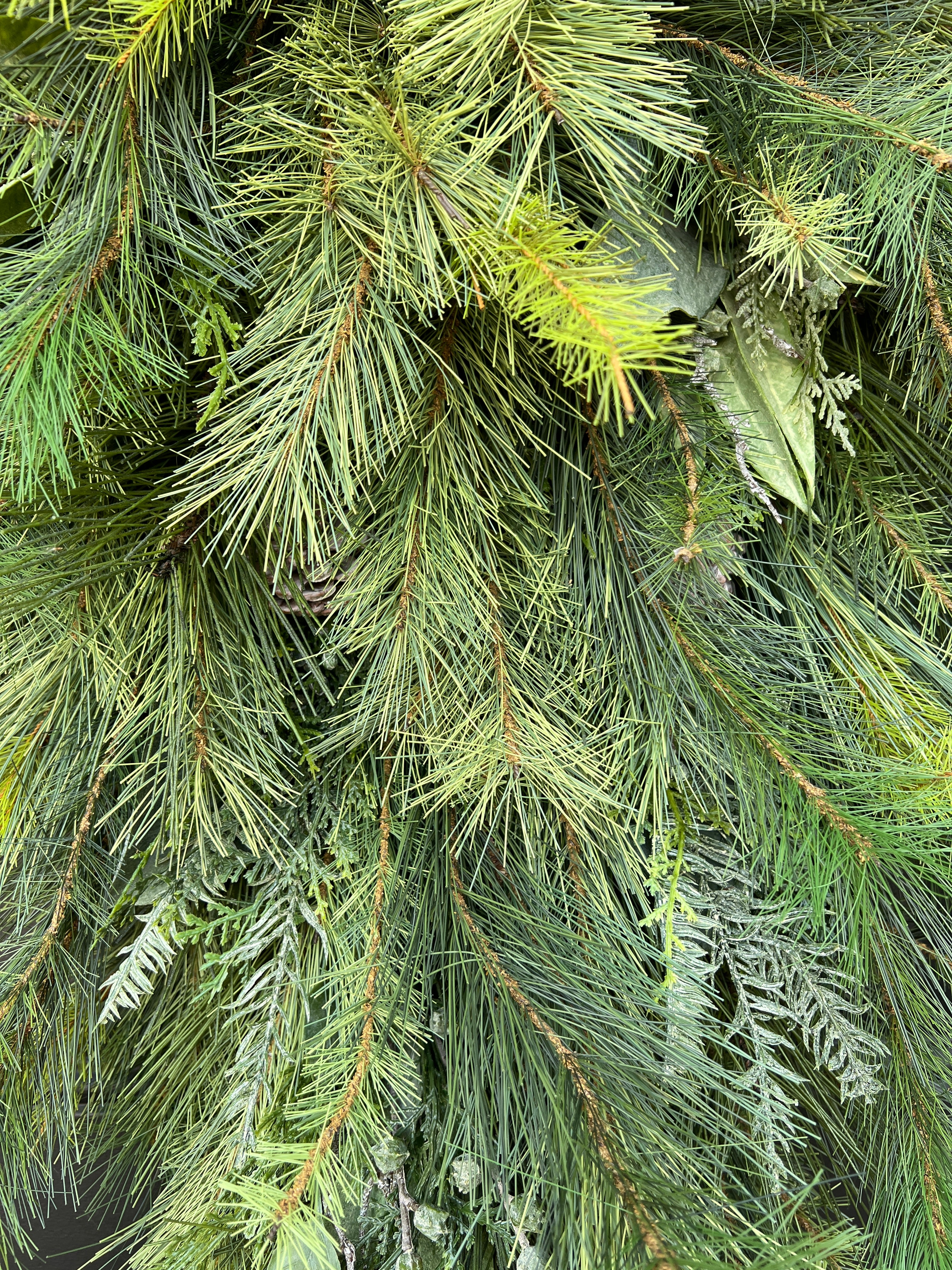 This handcrafted swag brings together long needle pine, spruce tips, and soft forest greens that look freshly gathered from an evergreen grove. Natural pinecones add earthy charm and subtle contrast, making this piece both elegant and organic. Whether your home leans rustic, classic, or modern, this design feels right at home all season long.