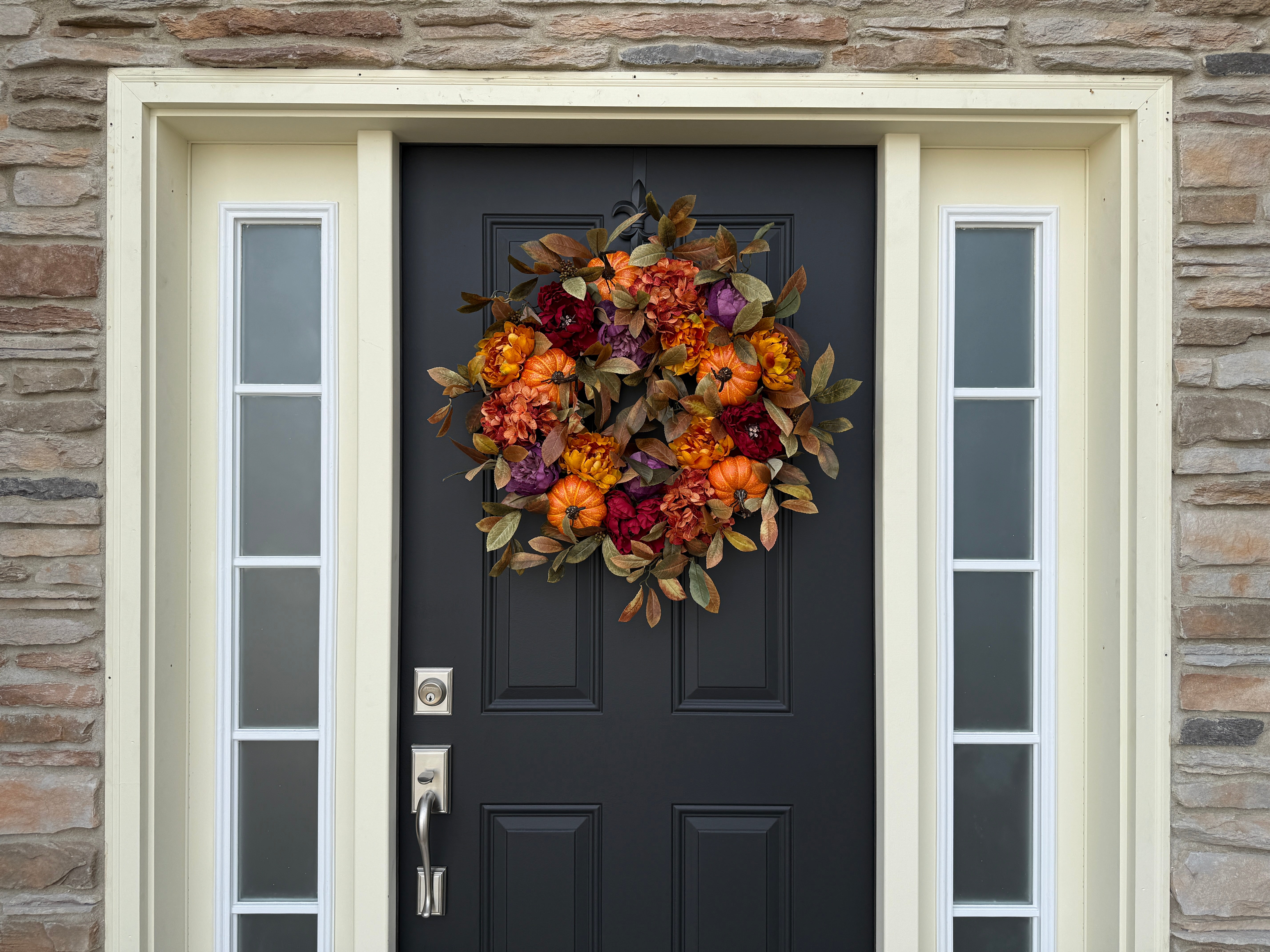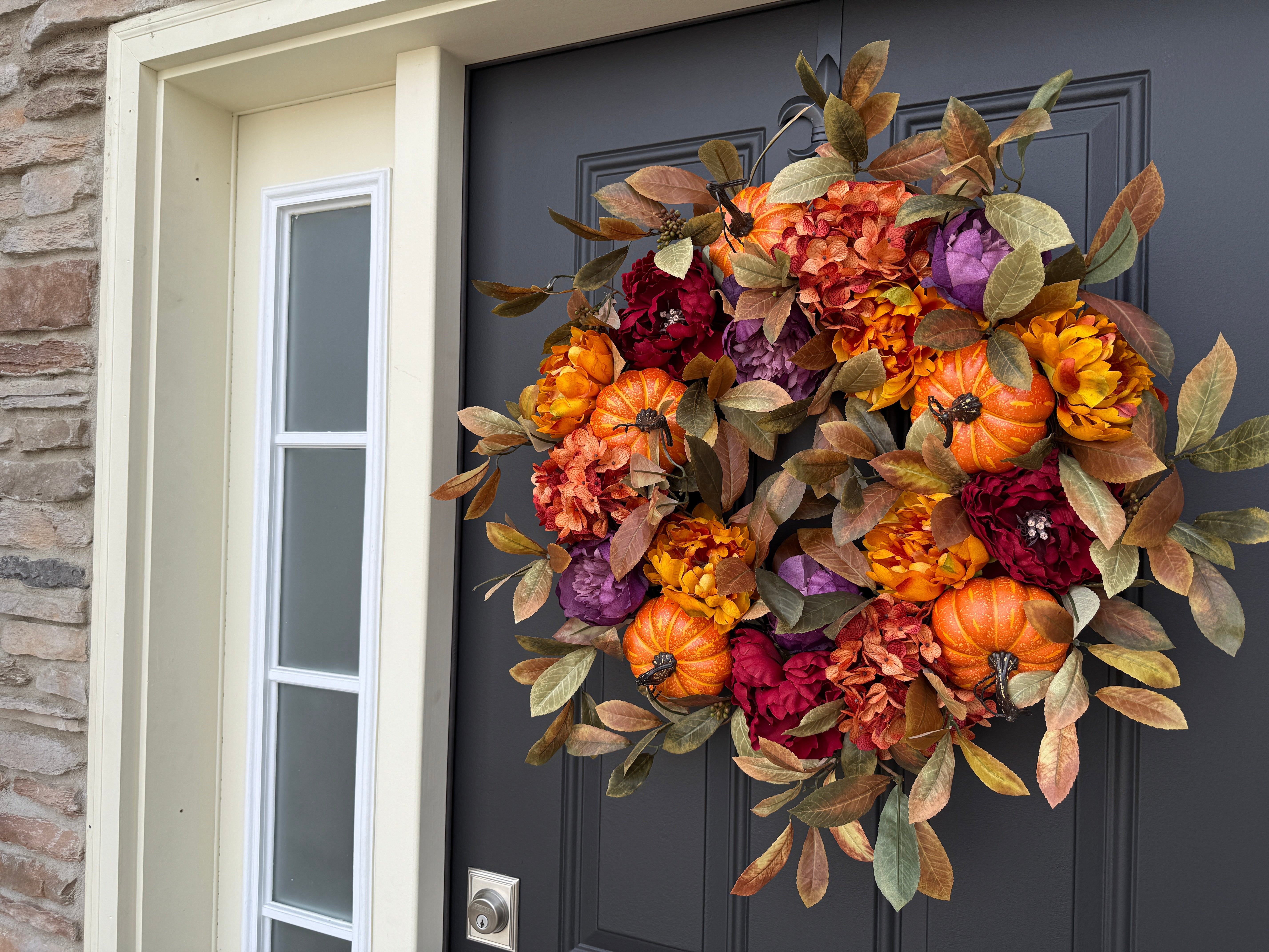 Bring home the glow of harvest season with a statement wreath layered in mini pumpkins, plush peony- and dahlia-style blooms, and soft olive foliage. The rich palette—pumpkin orange, burgundy, plum, and marigold—adds instant warmth to your front door and makes a beautiful backdrop for fall gatherings and Thanksgiving photos.