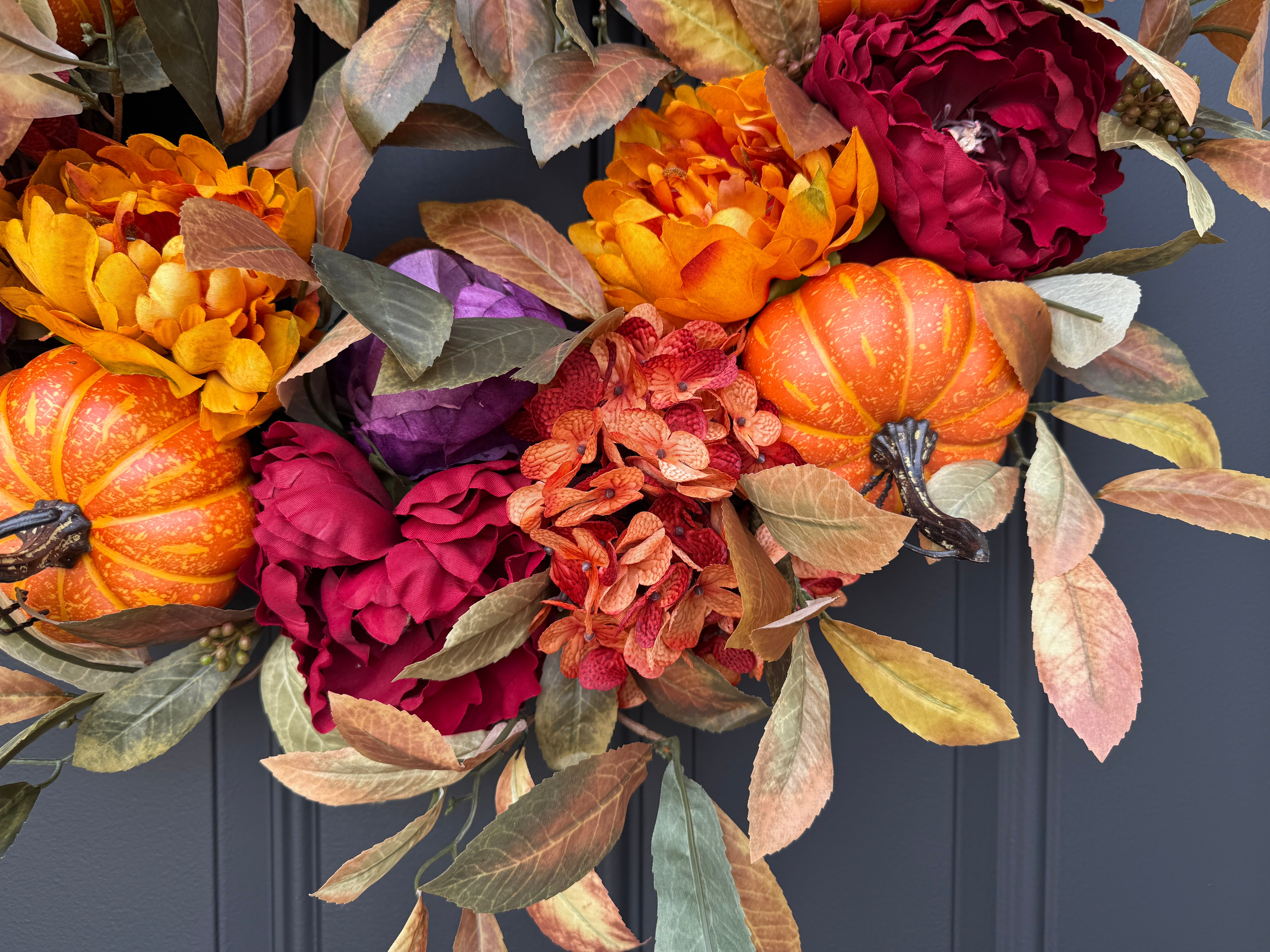 Handcrafted on a natural grapevine base with premium faux pumpkins, peony/dahlia florals, and lifelike olive leaves
