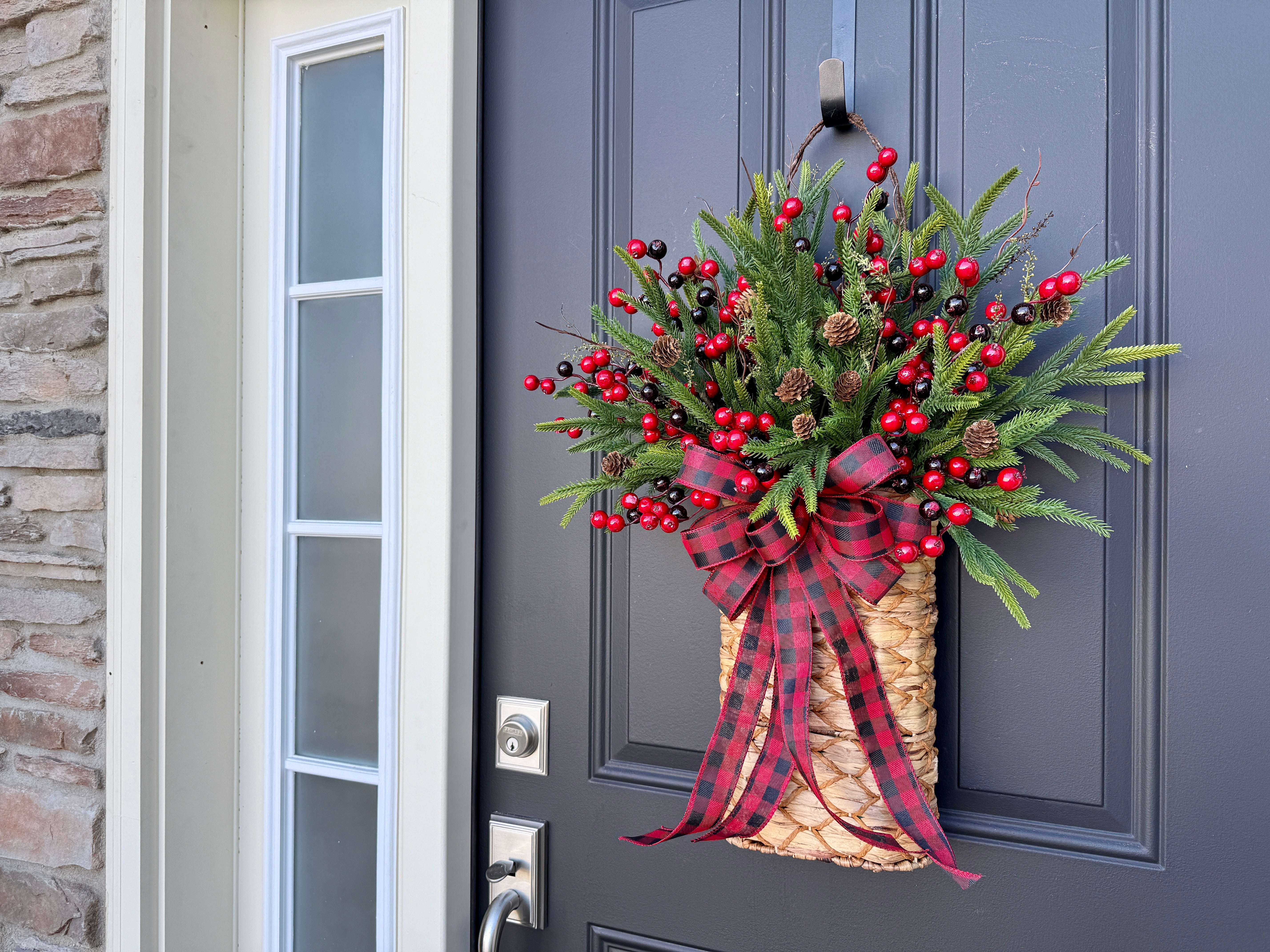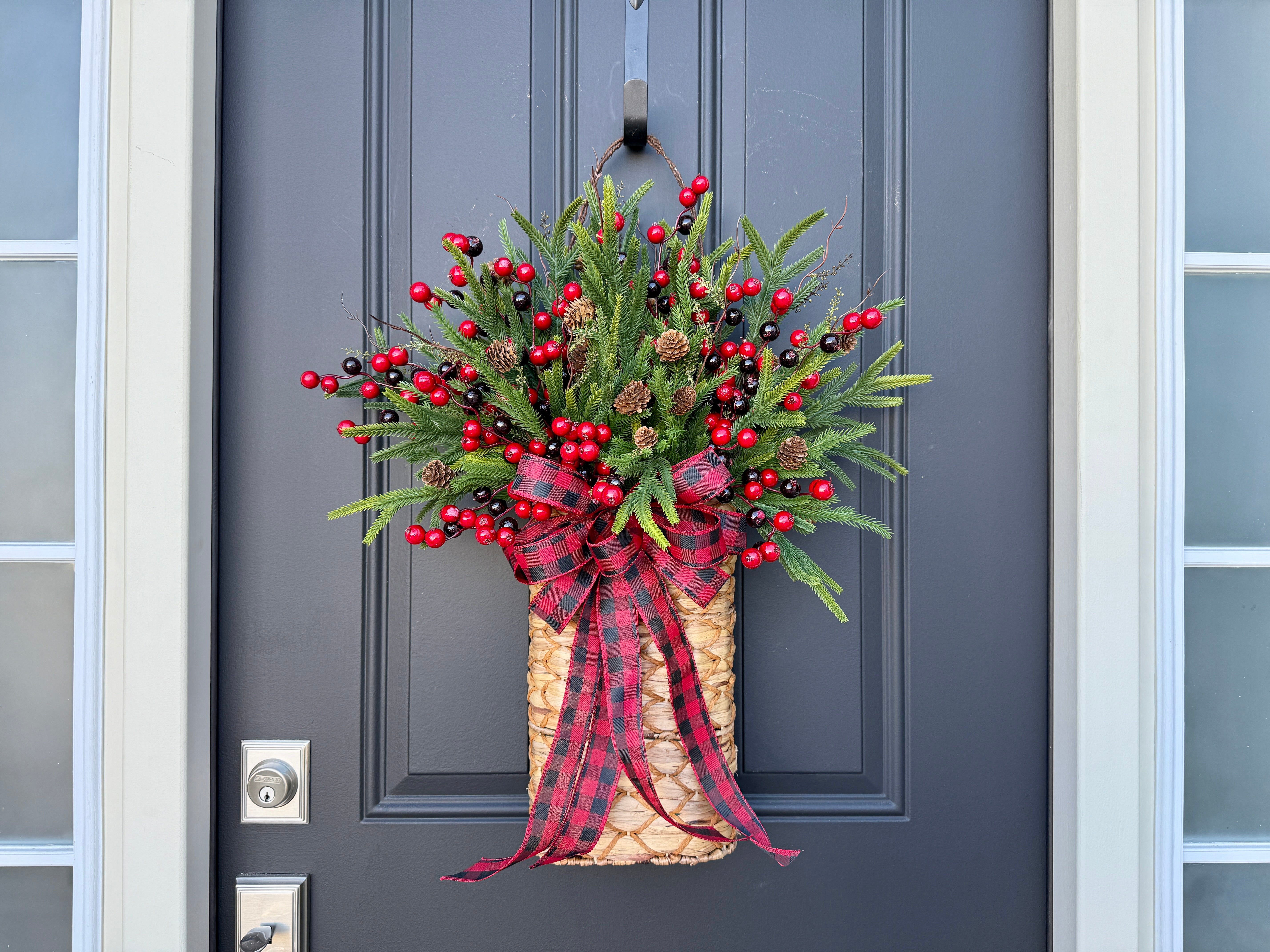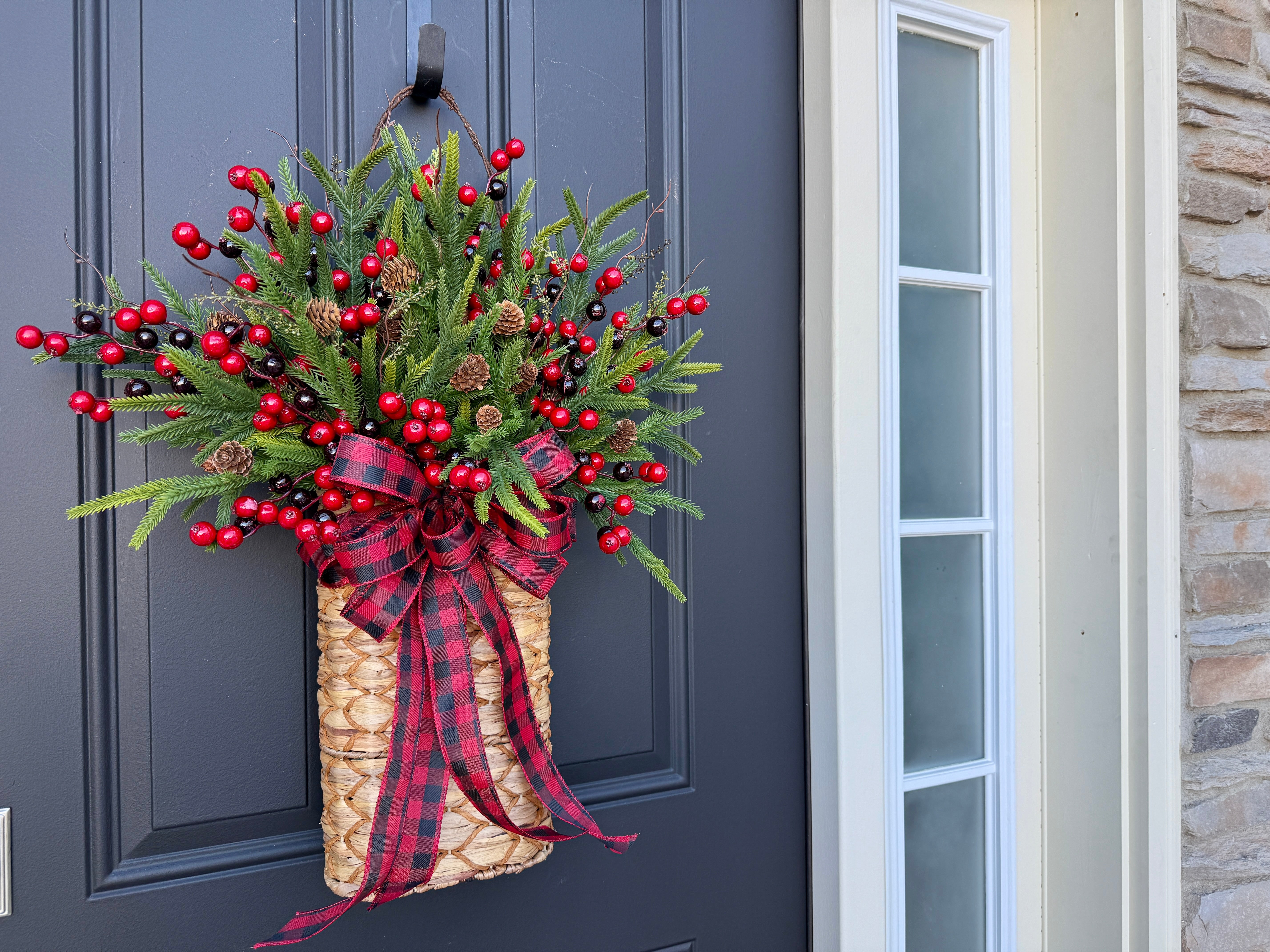 Celebrate the season with this handcrafted basket bursting with vibrant pine branches, red berries, and miniature pinecones. Finished with a bold buffalo plaid ribbon, this festive design brings rustic Christmas cheer to any front door or wall.