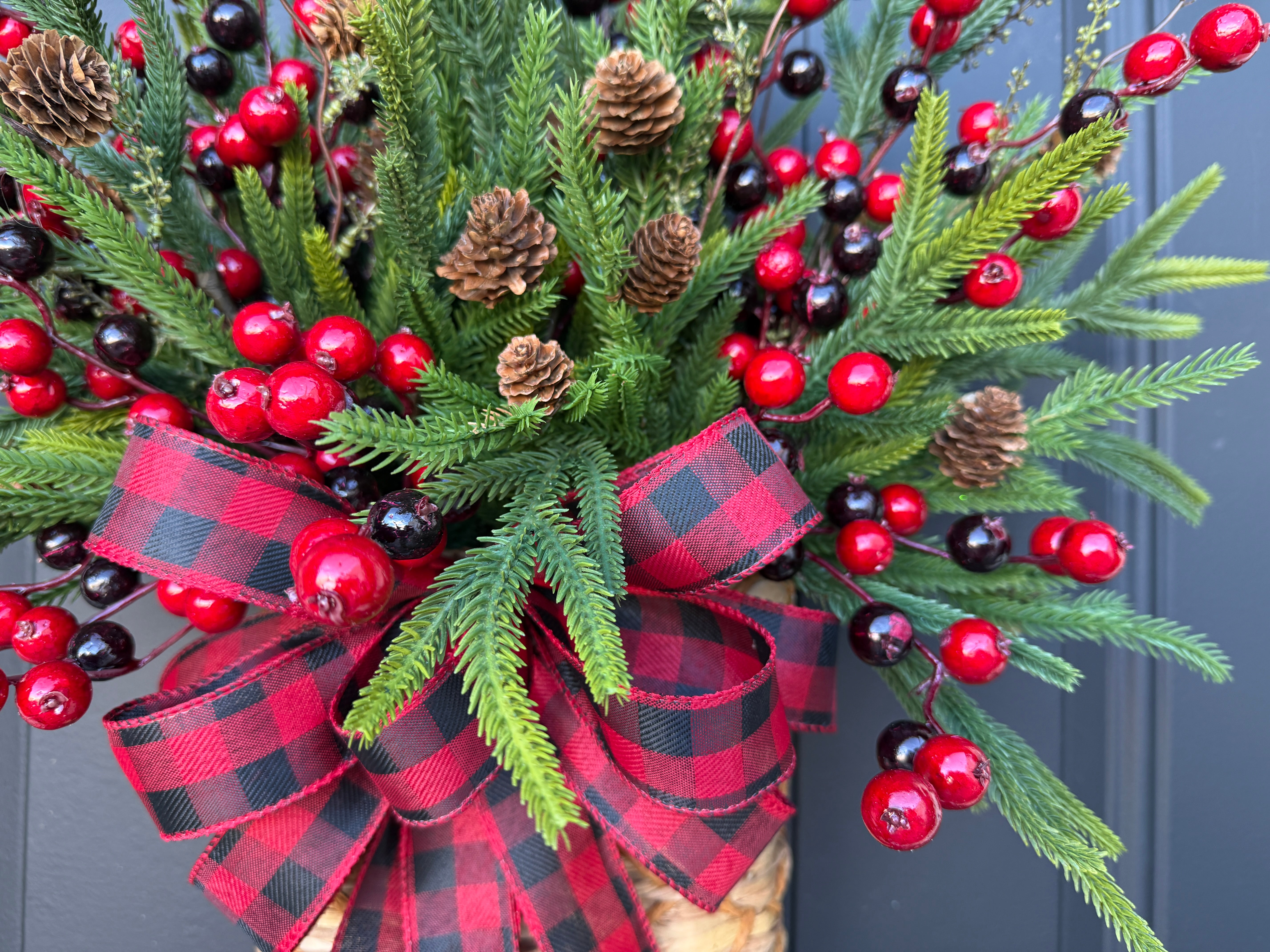 Holiday Pine and Red Berry Basket with Buffalo Plaid Bow |