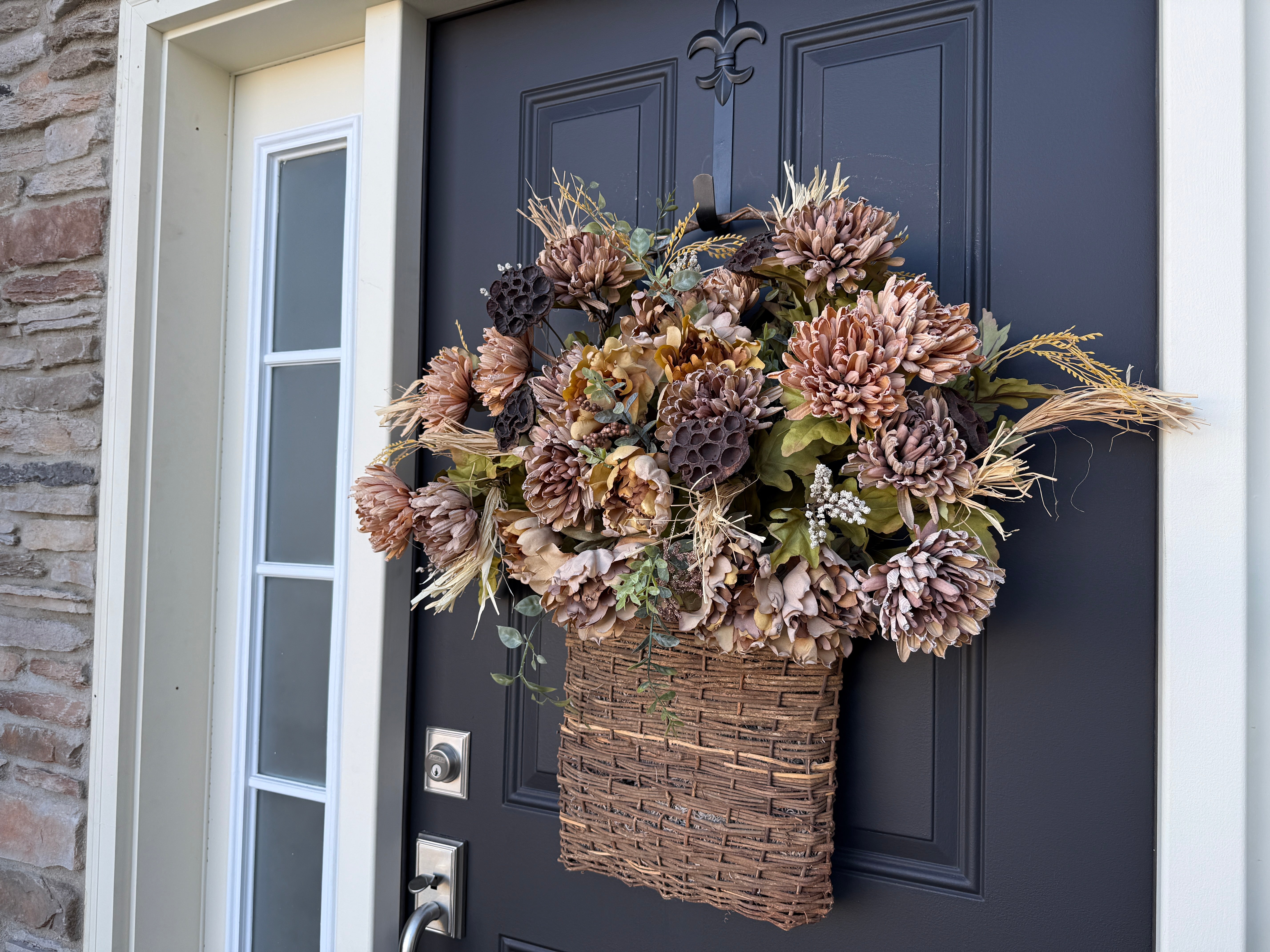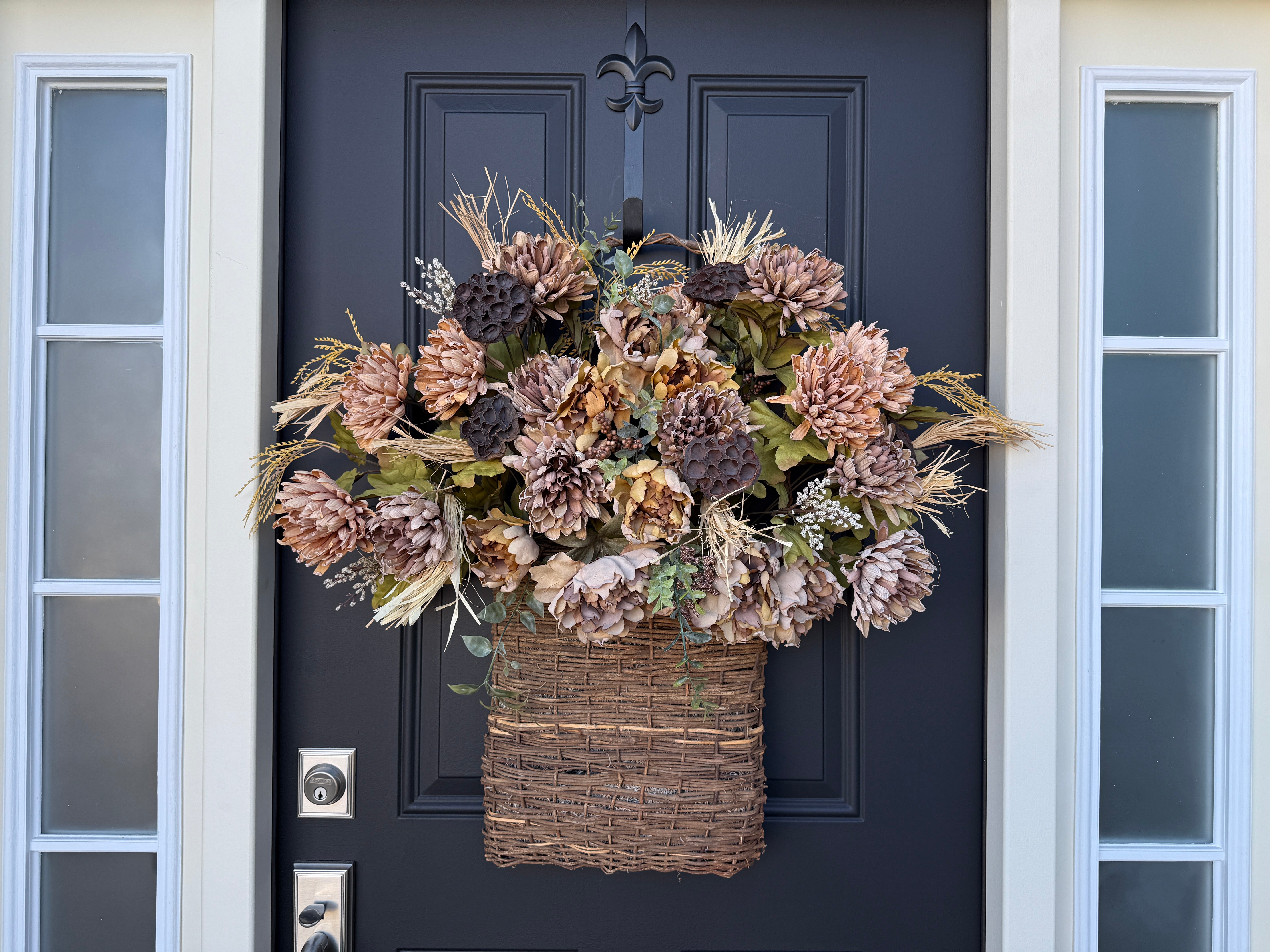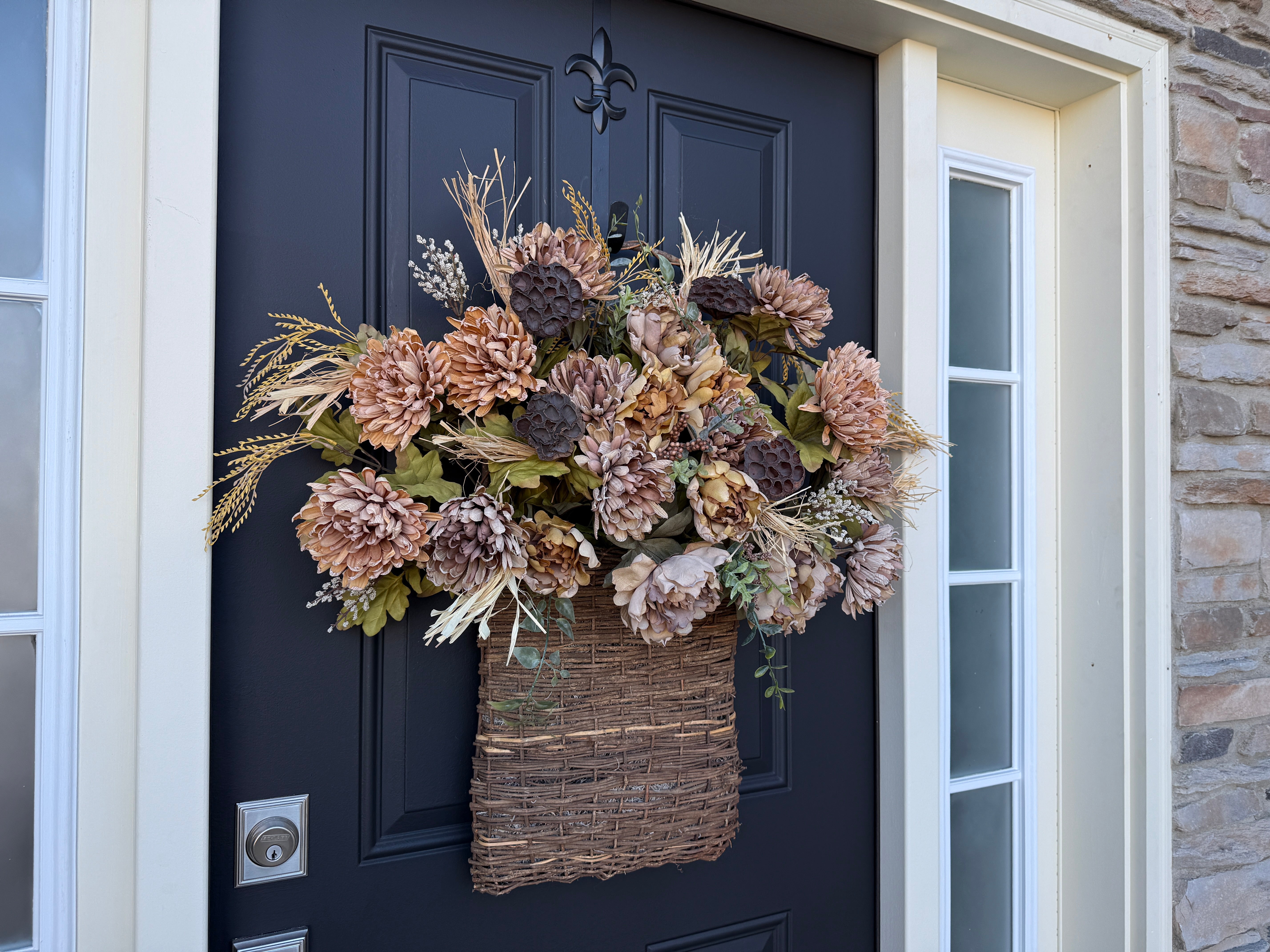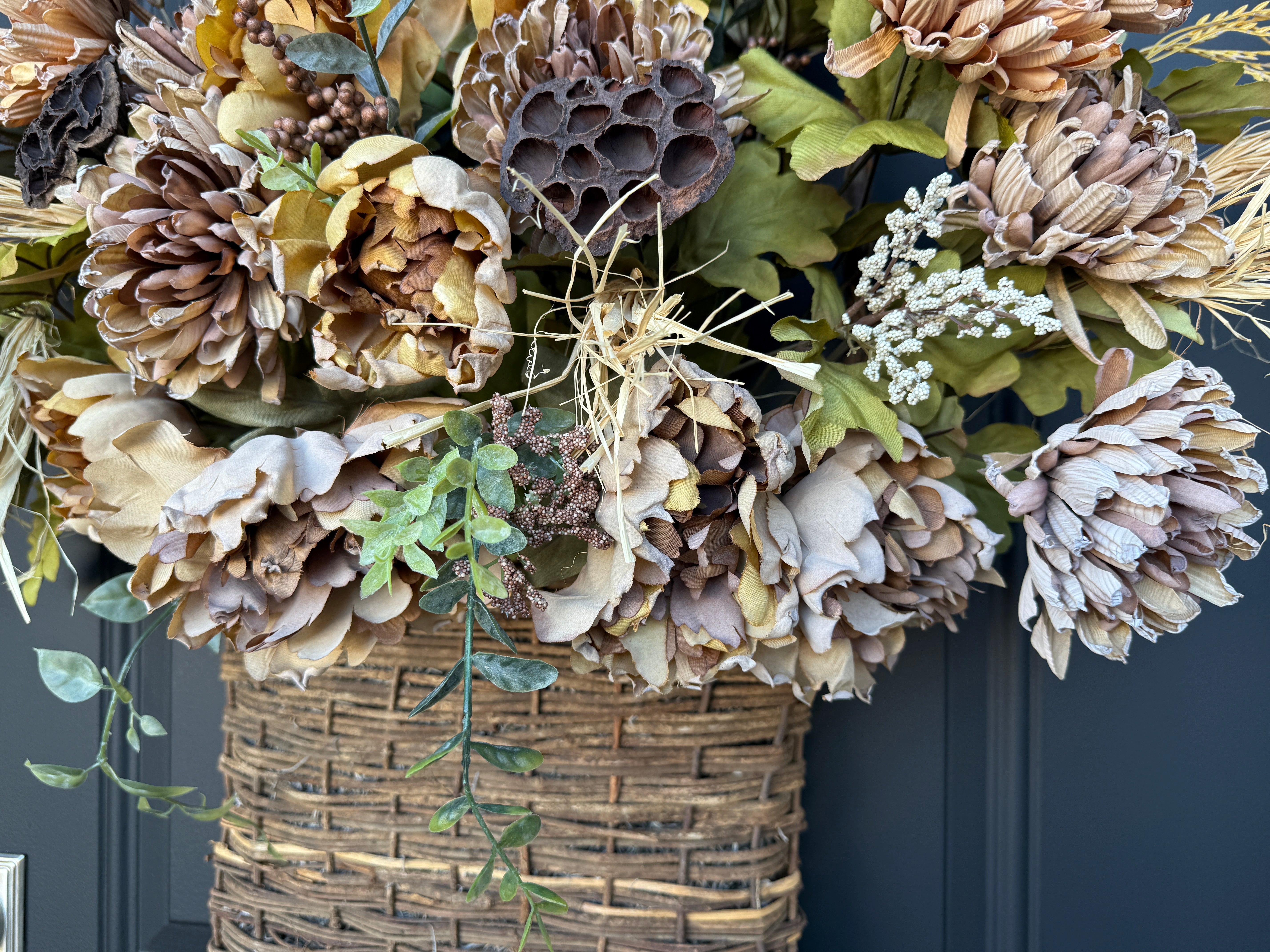Bring natural elegance to your fall entryway with this handcrafted twig basket overflowing with beige, brown, and honey-toned florals. Accented with dried lotus pods, grains, and soft greenery, this arrangement captures the peaceful beauty of the harvest season.