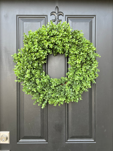 With its crisp black and white gingham ribbon, our handcrafted Classic Boxwood Wreath brings a playful, rustic touch to your home. Crafted from faux boxwood, this wreath is perfect for any season—its greenery and bold ribbon add a pop of style to both indoor spaces and covered outdoor areas.