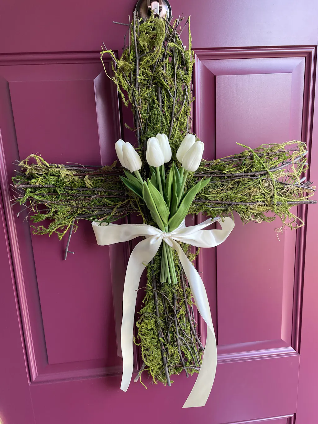 Celebrate the renewal of spring and the celebration of Christ with our Easter Cross Wreath. Beautifully handcrafted with vibrant tulips and a fresh green moss base, this cross-shaped wreath is adorned with a soft satin ribbon, symbolizing the hope and grace of the season. Perfect for adding a gentle reminder of spring’s promise and peace, this wreath is an elegant addition to any space, whether for Easter celebrations or as a meaningful spring accent. Please choose your color and number of tulips.
