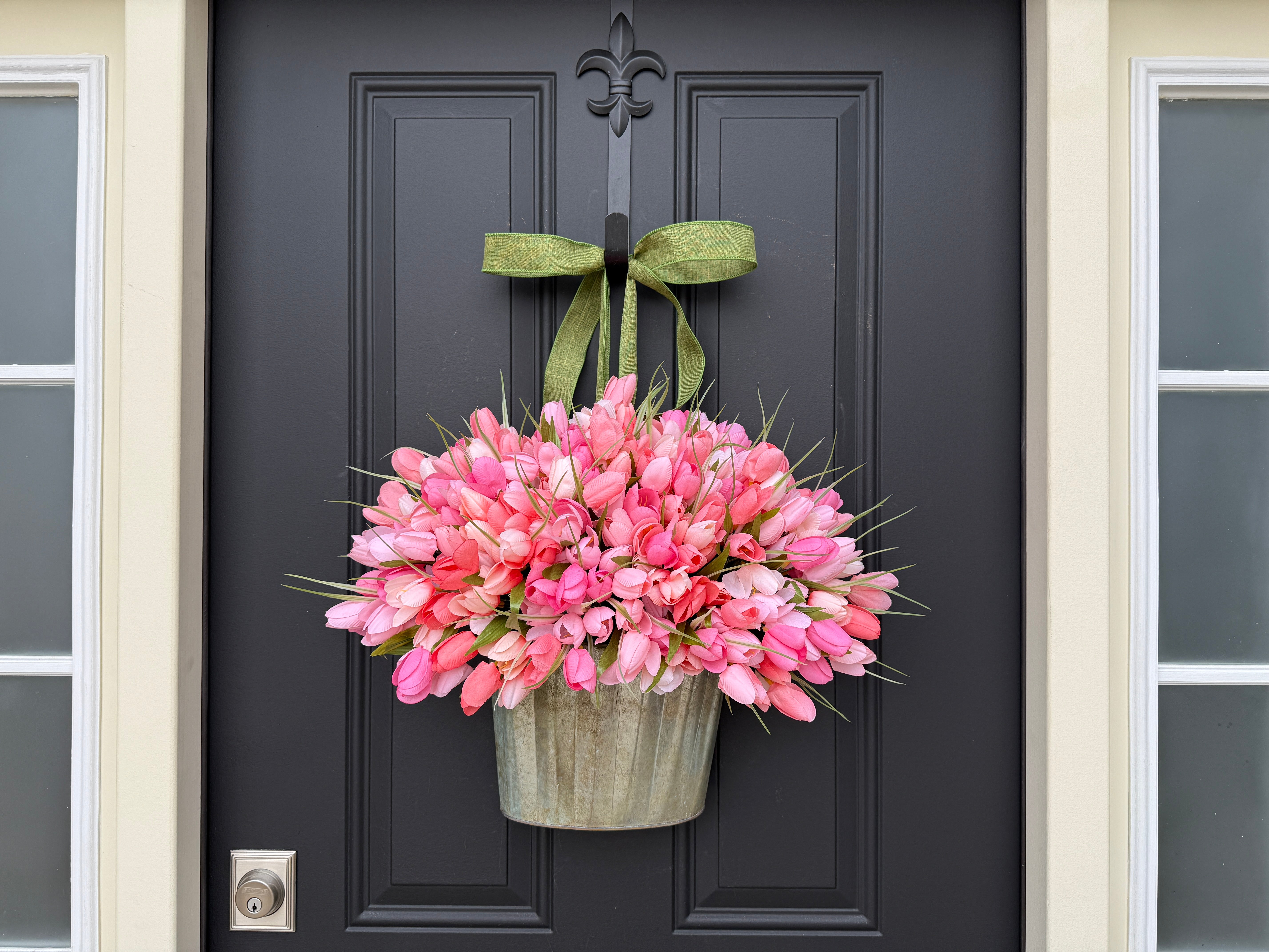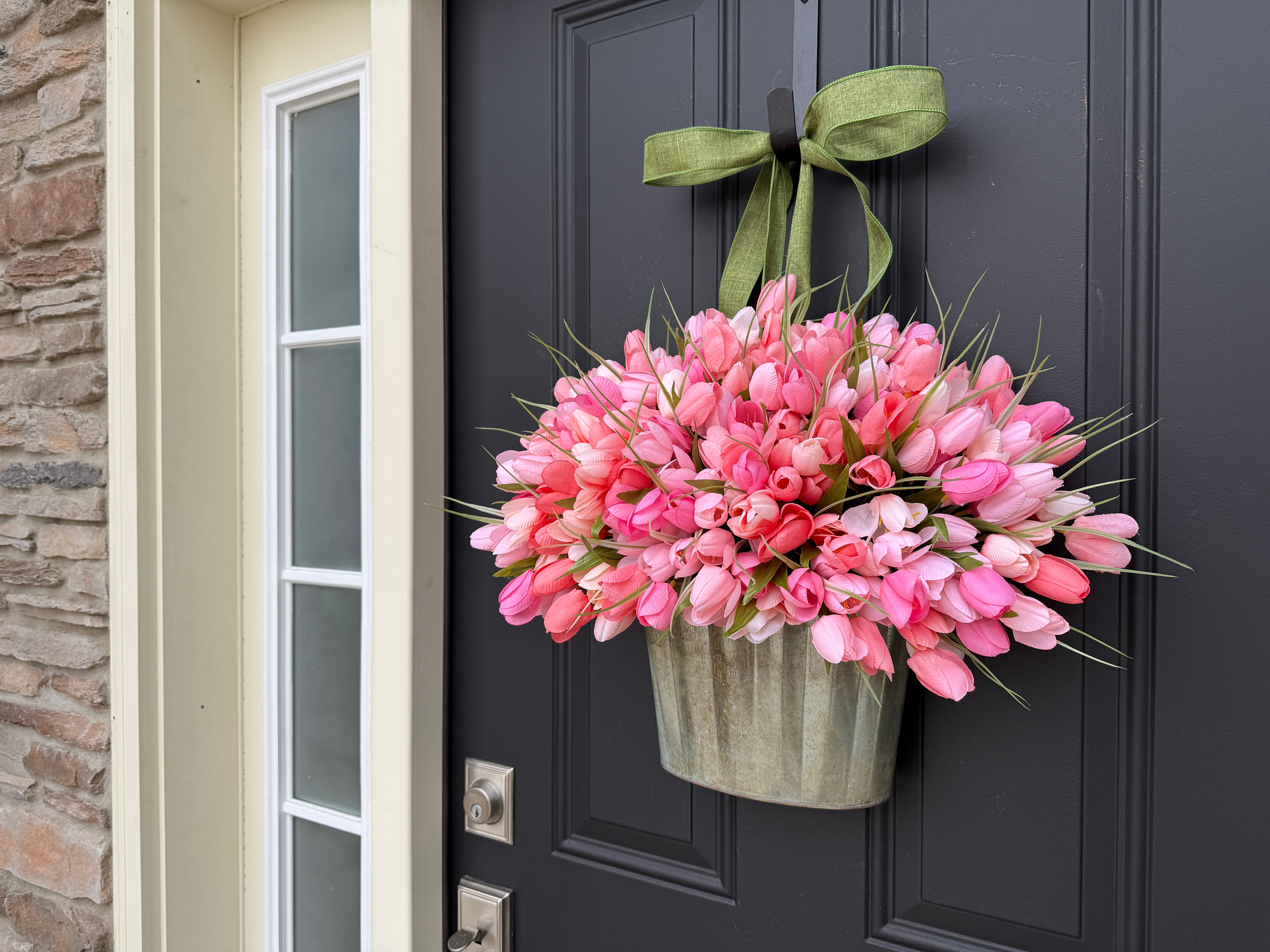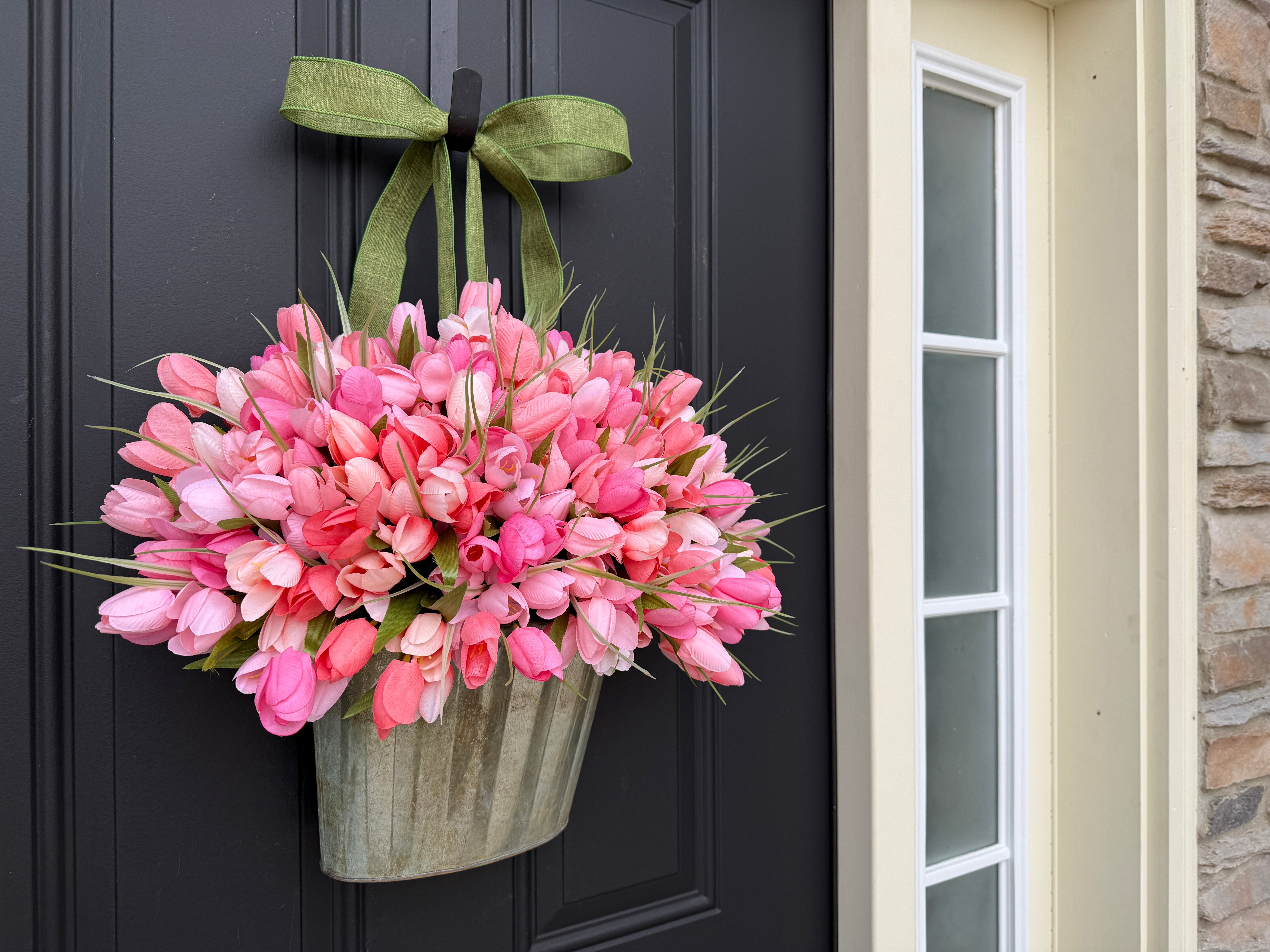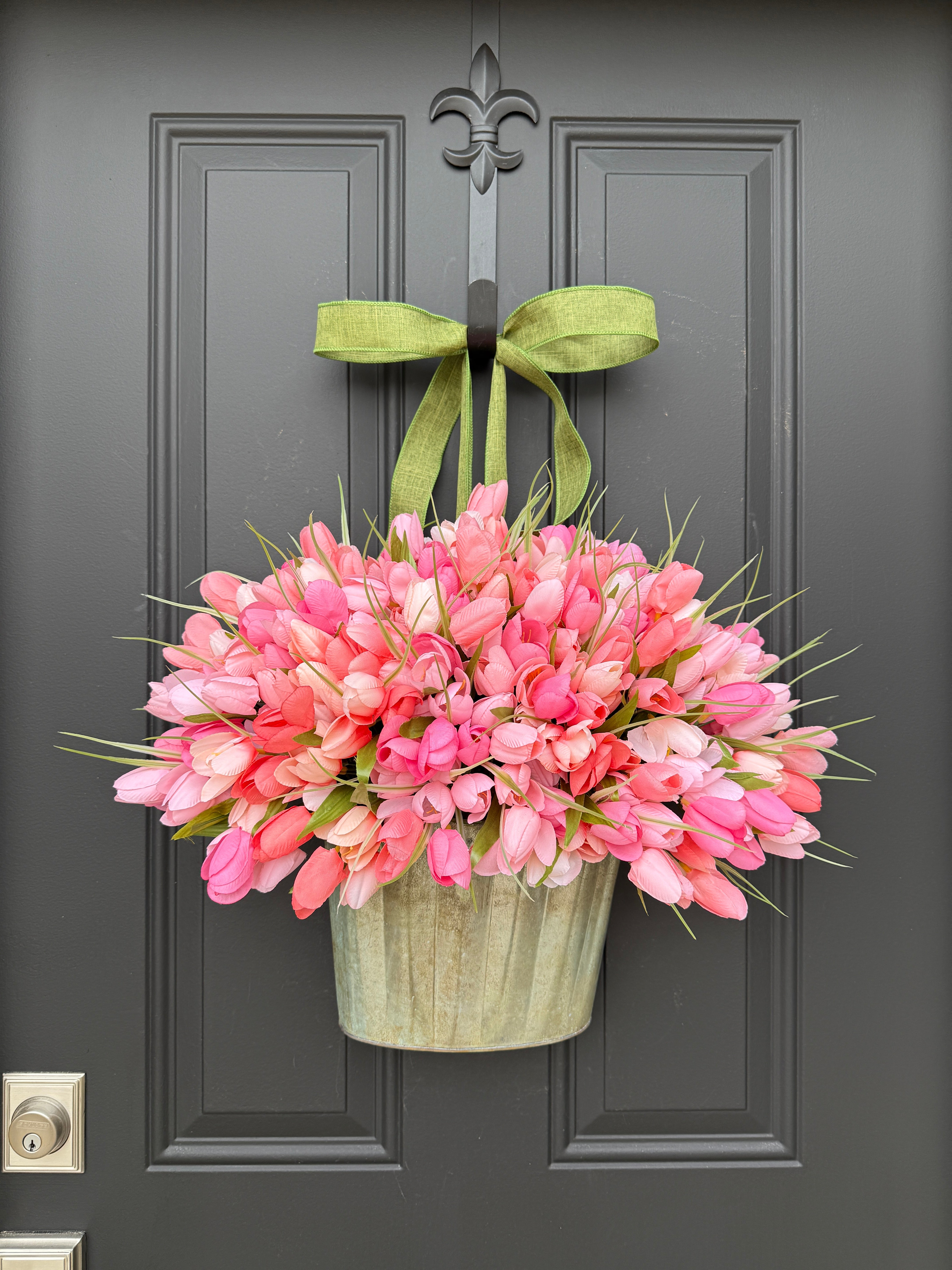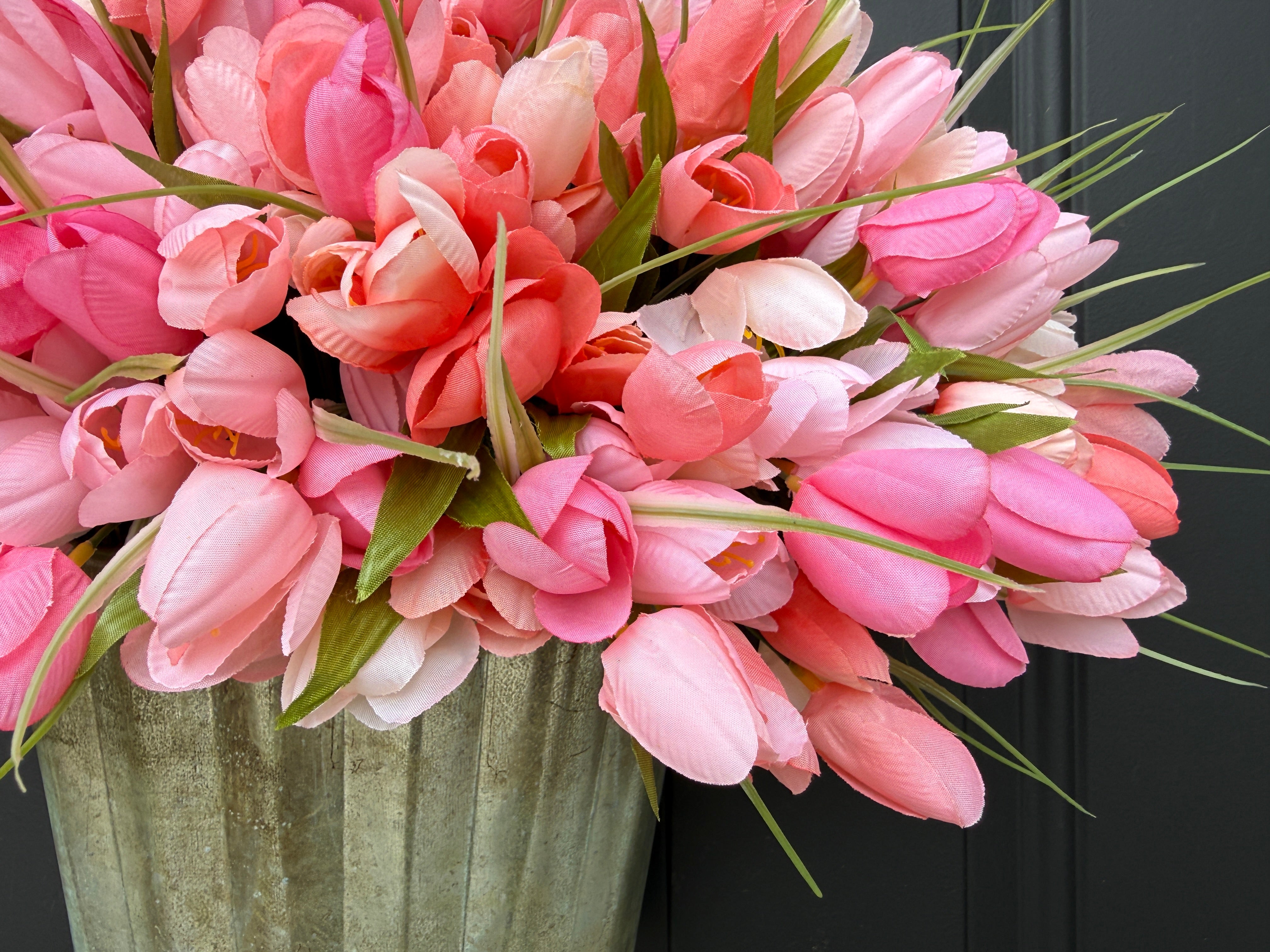 Peach and Pink Tulip Bucket Wreath - Spring Tulips for Front Door and Mother's Day