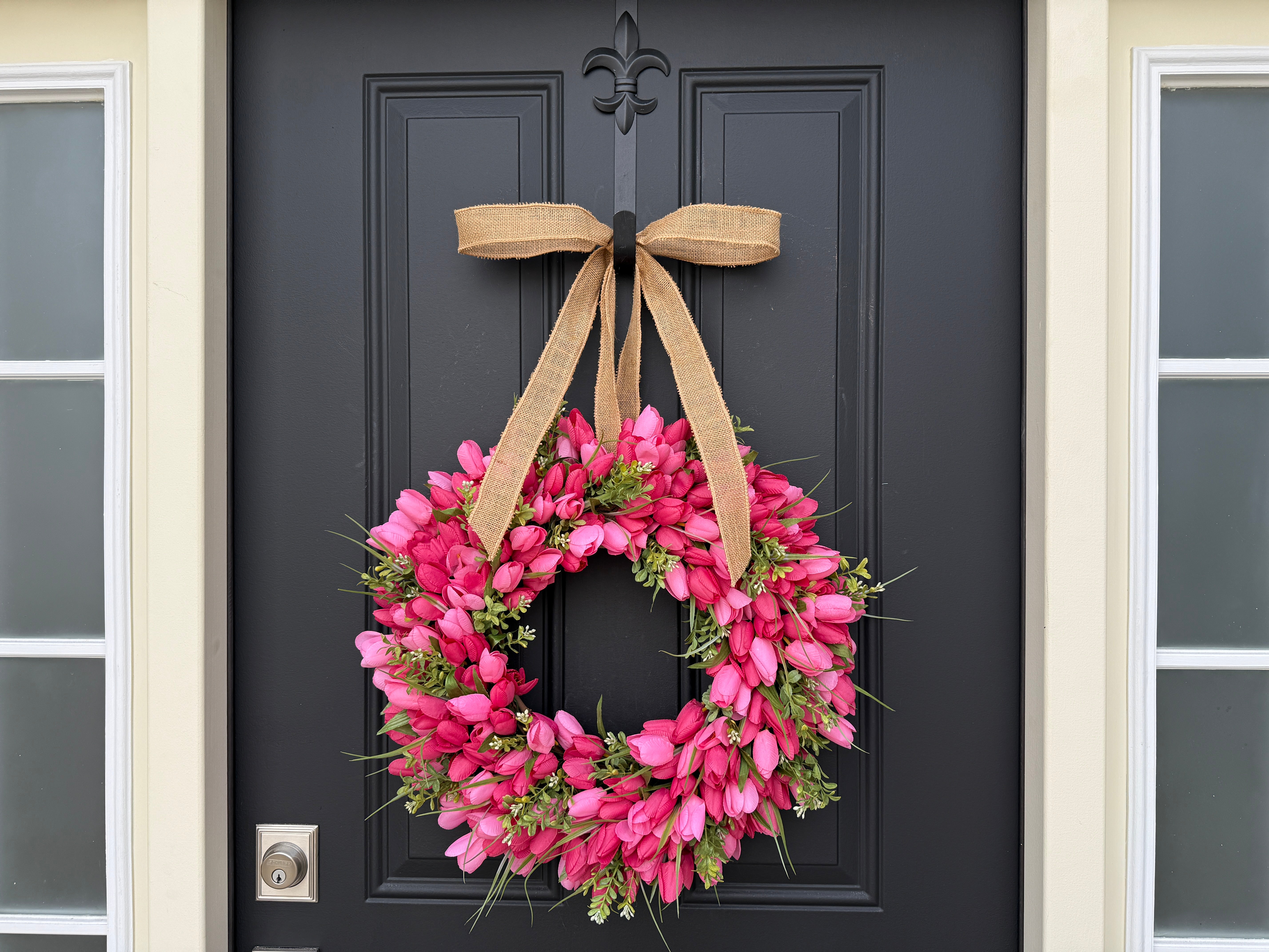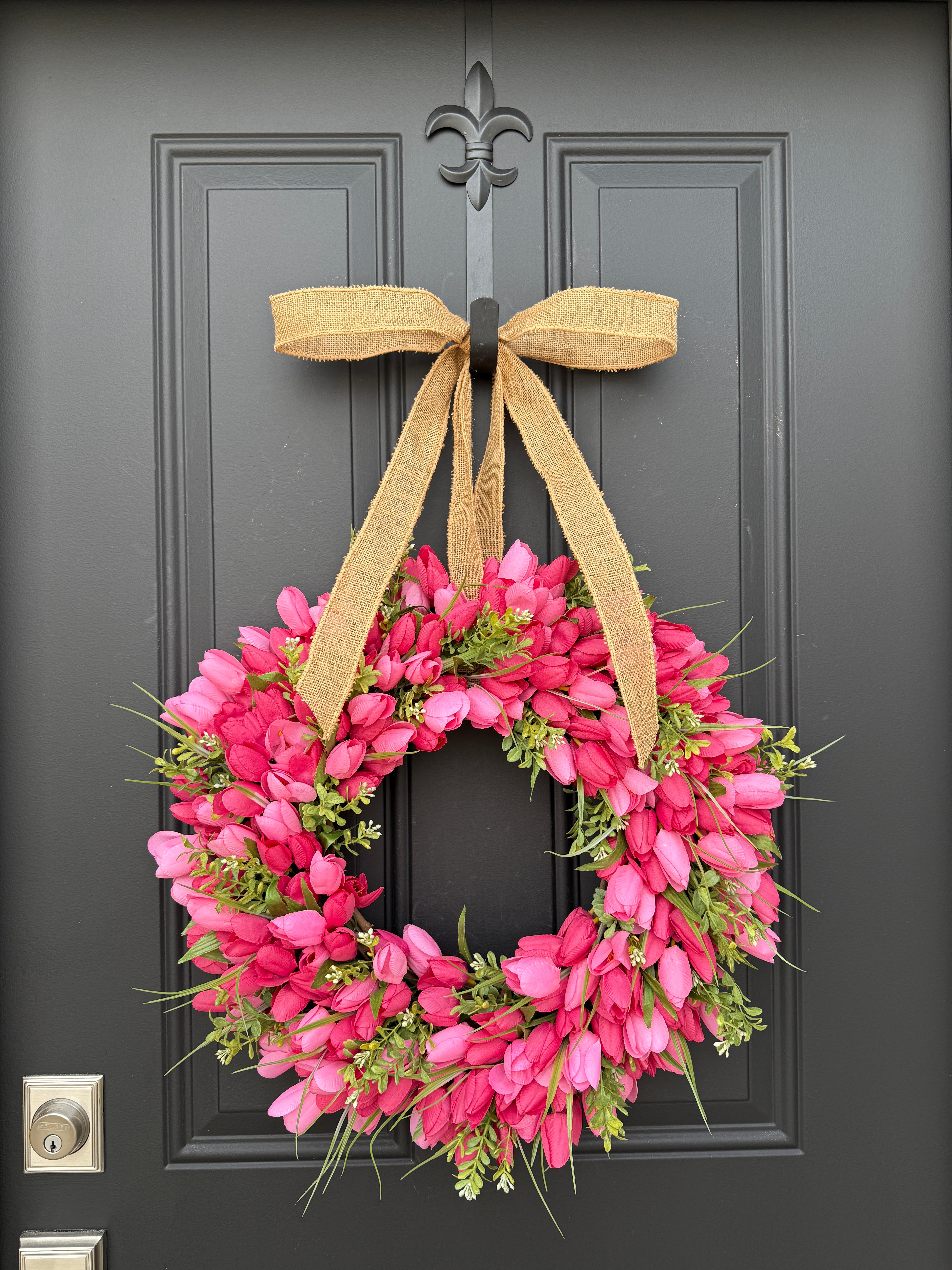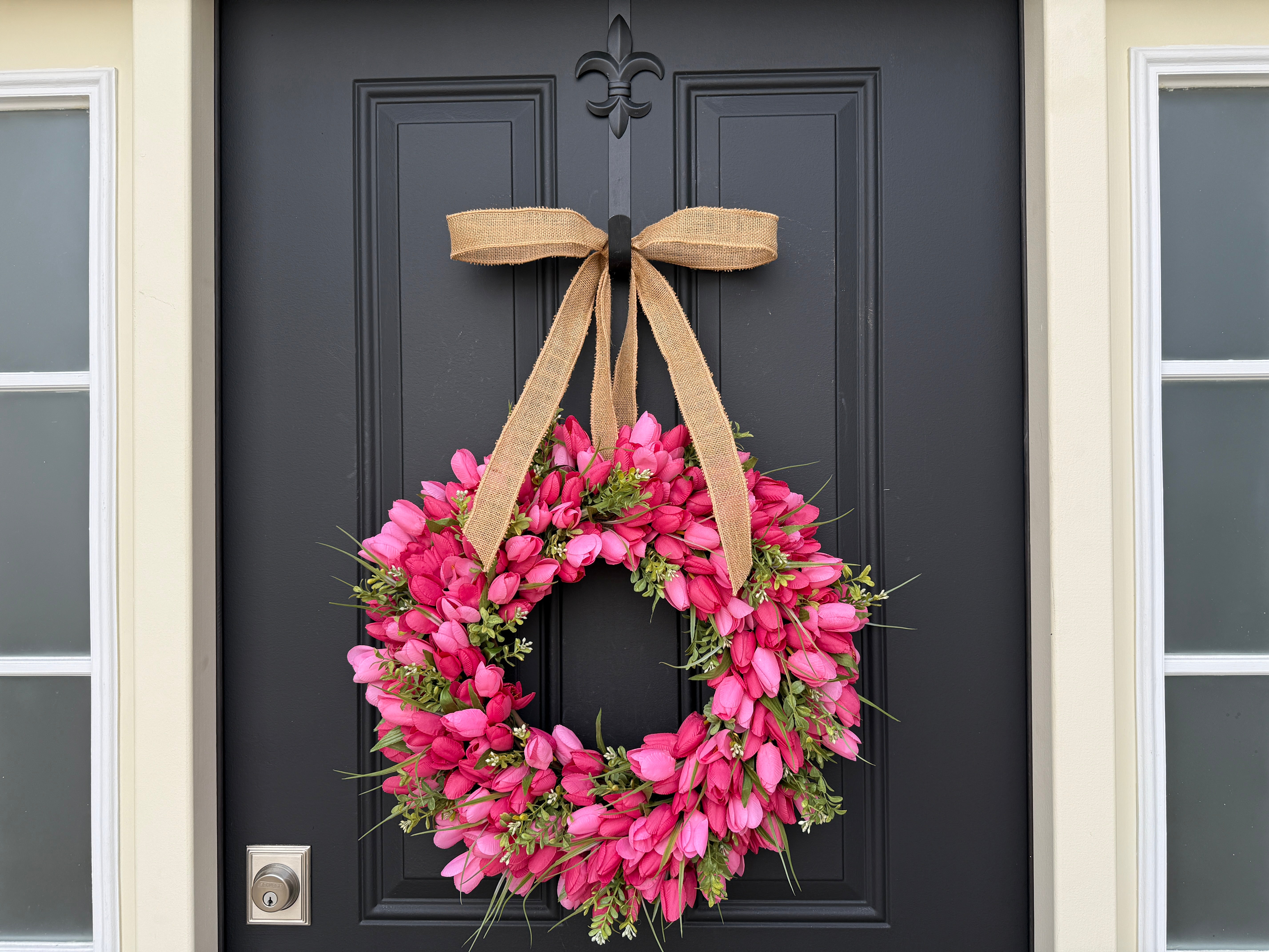 Pink Tulip Wreath with Boxwood & Burlap Bow – Spring Door Wreath 24"