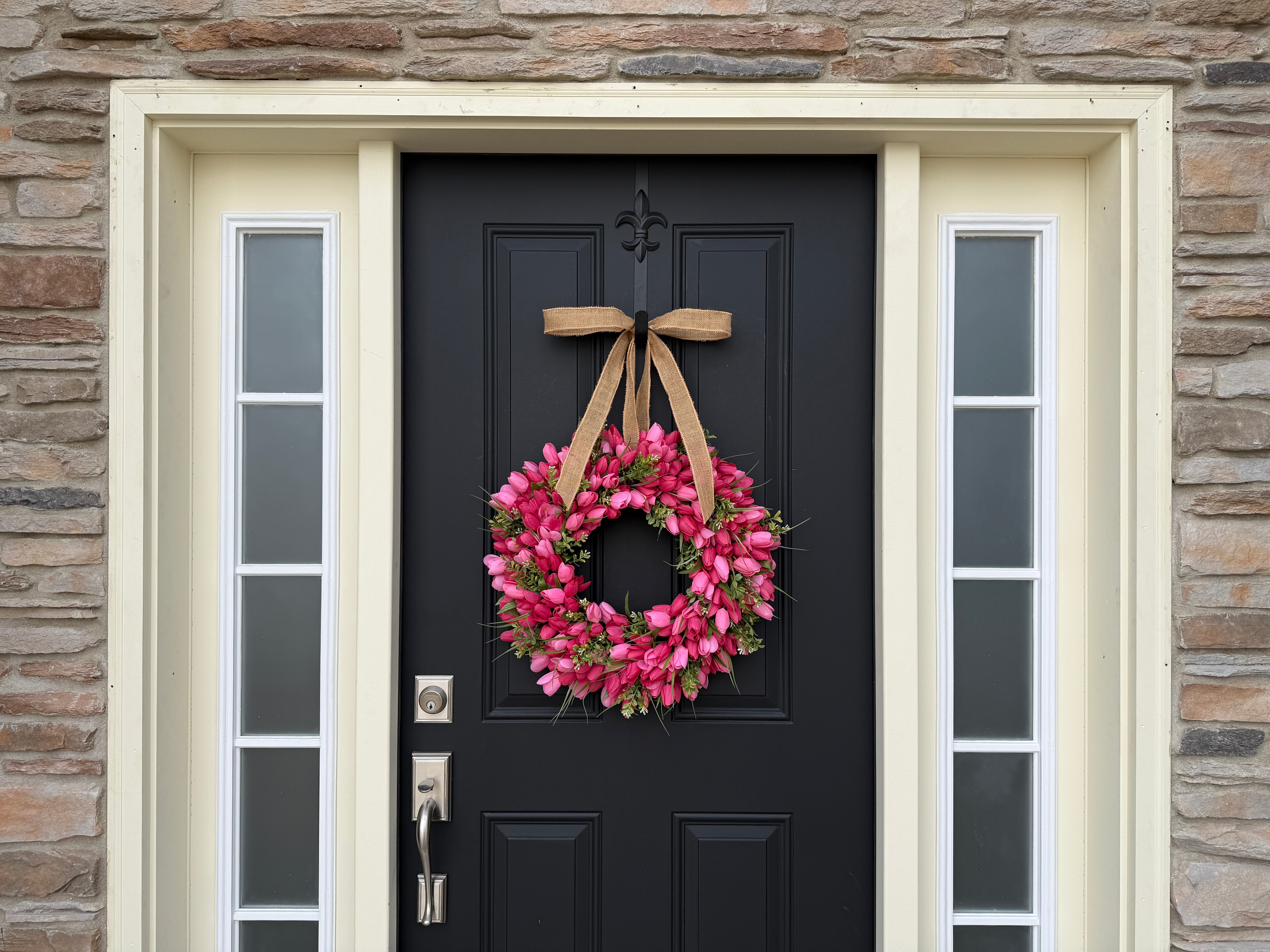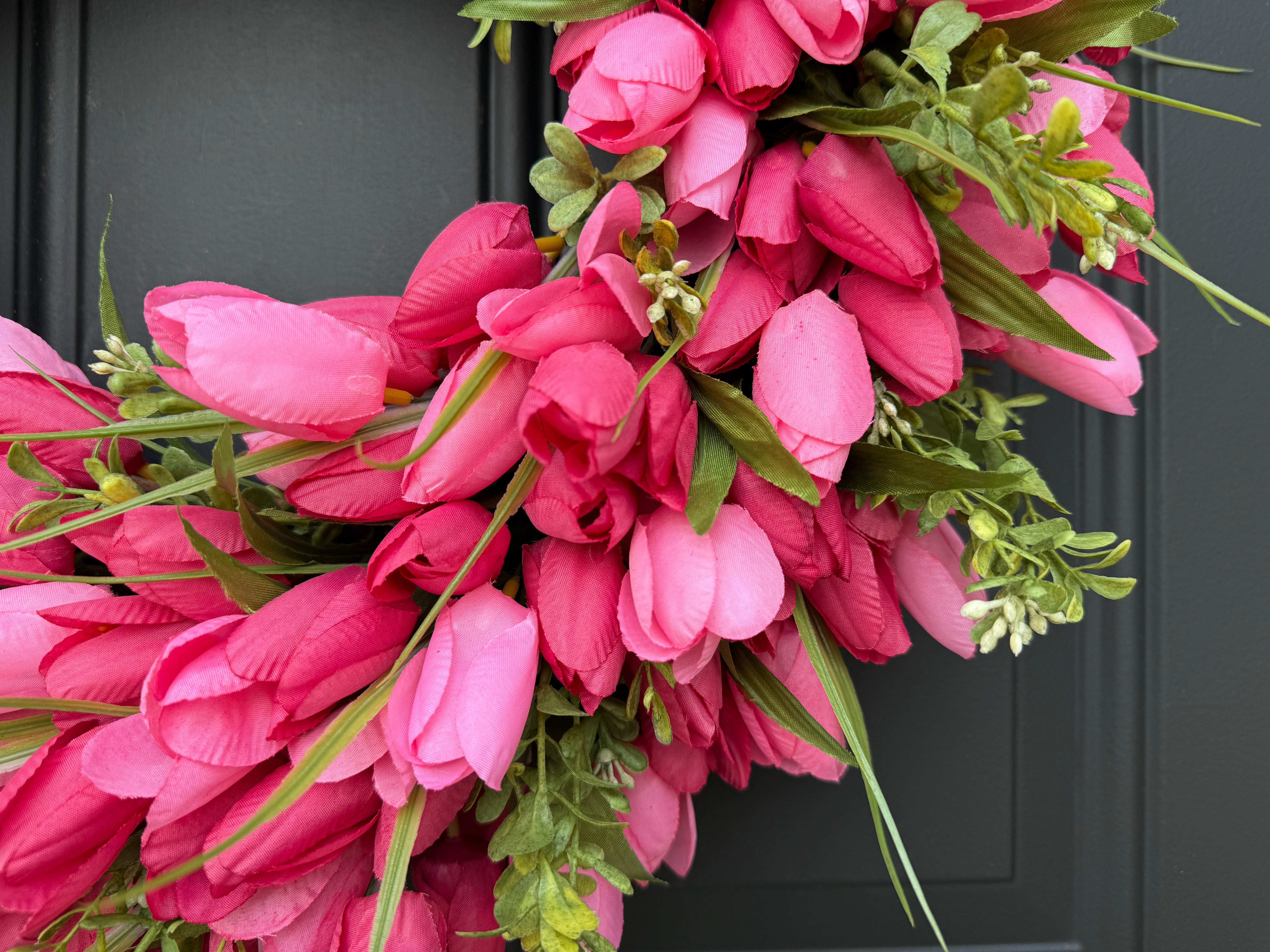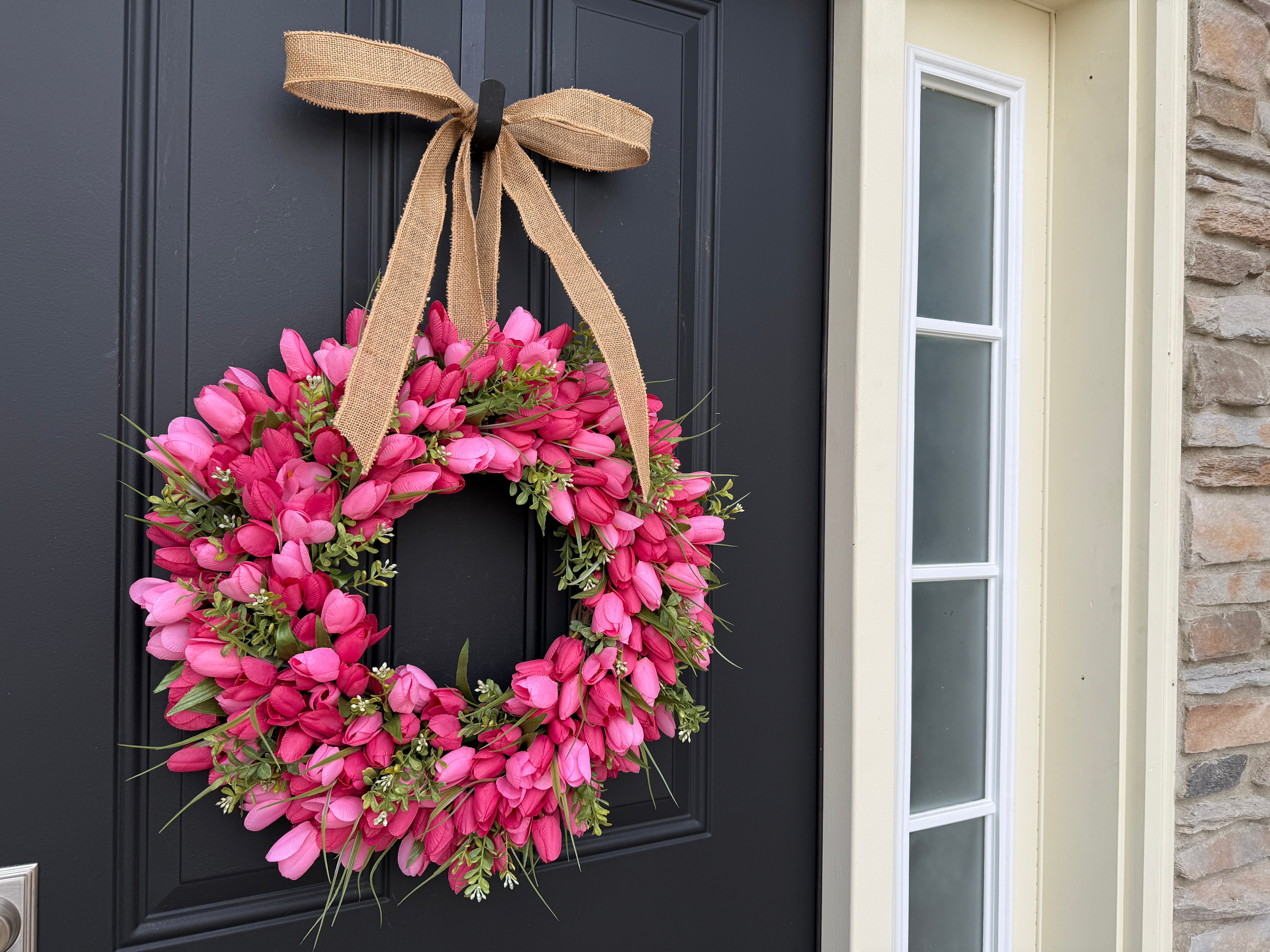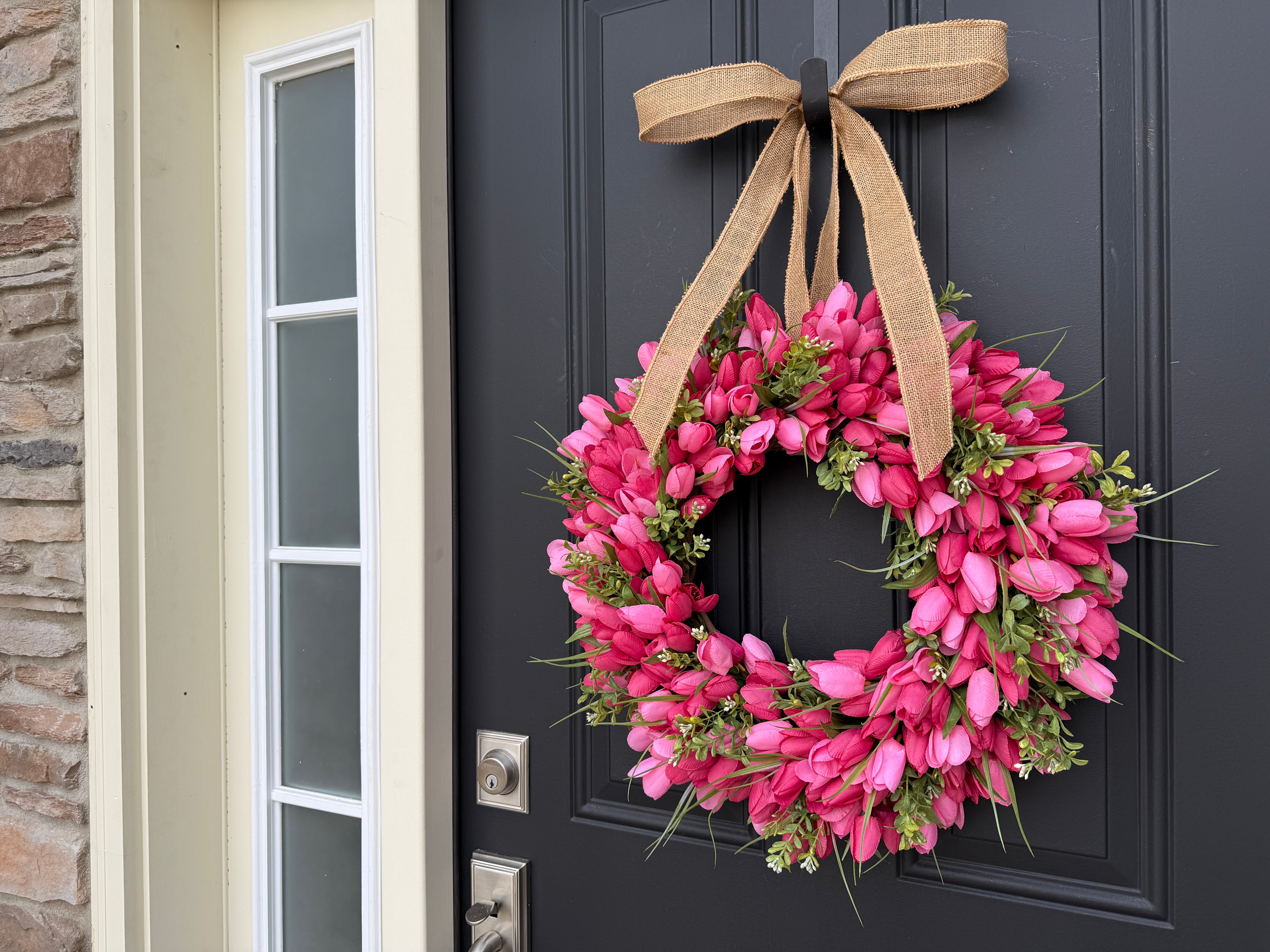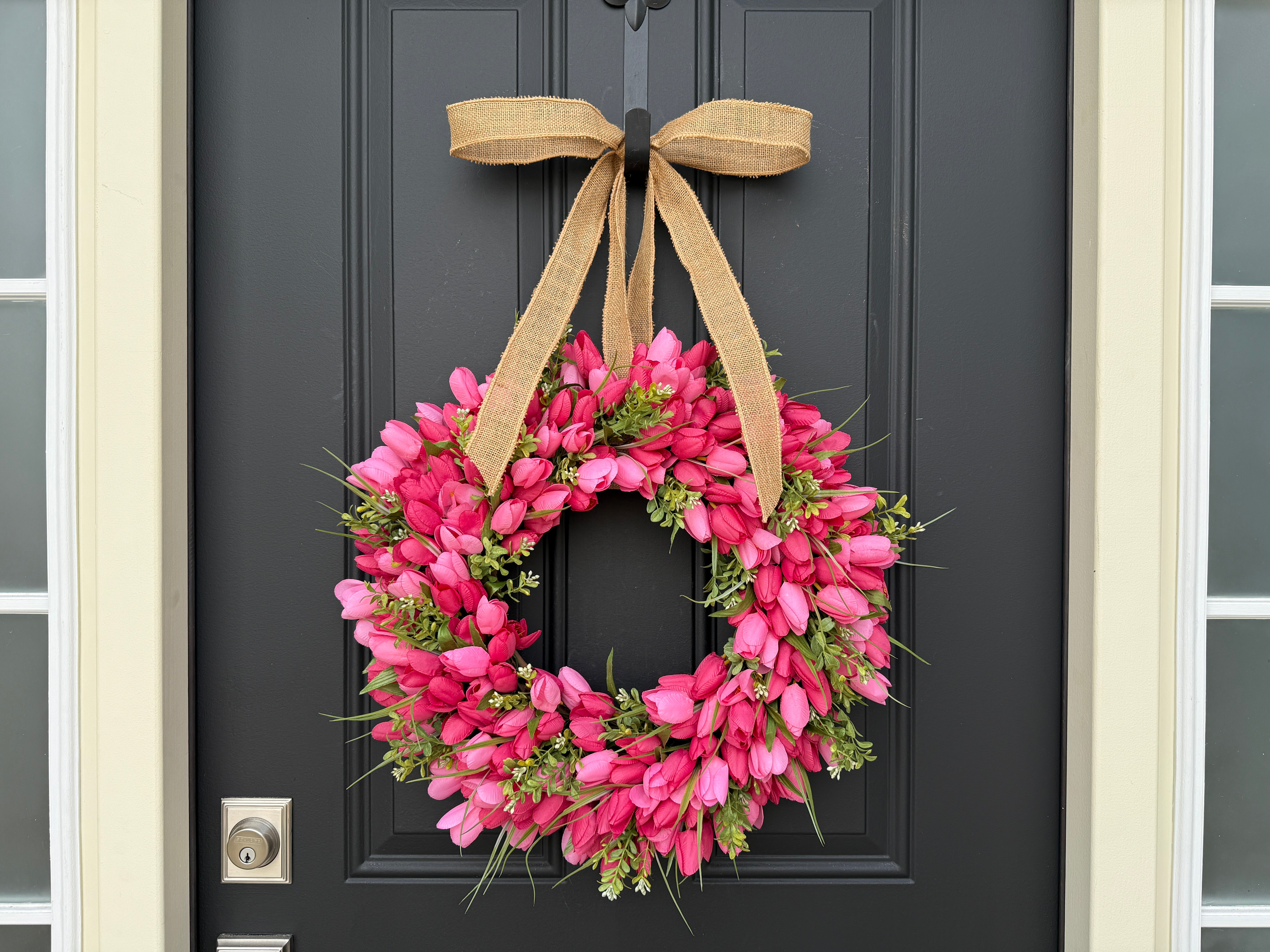 Whether you're refreshing your seasonal door décor or adding a touch of farmhouse-style springtime charm to your home, this pink tulip wreath with boxwood and burlap bow delivers handcrafted quality and natural beauty.