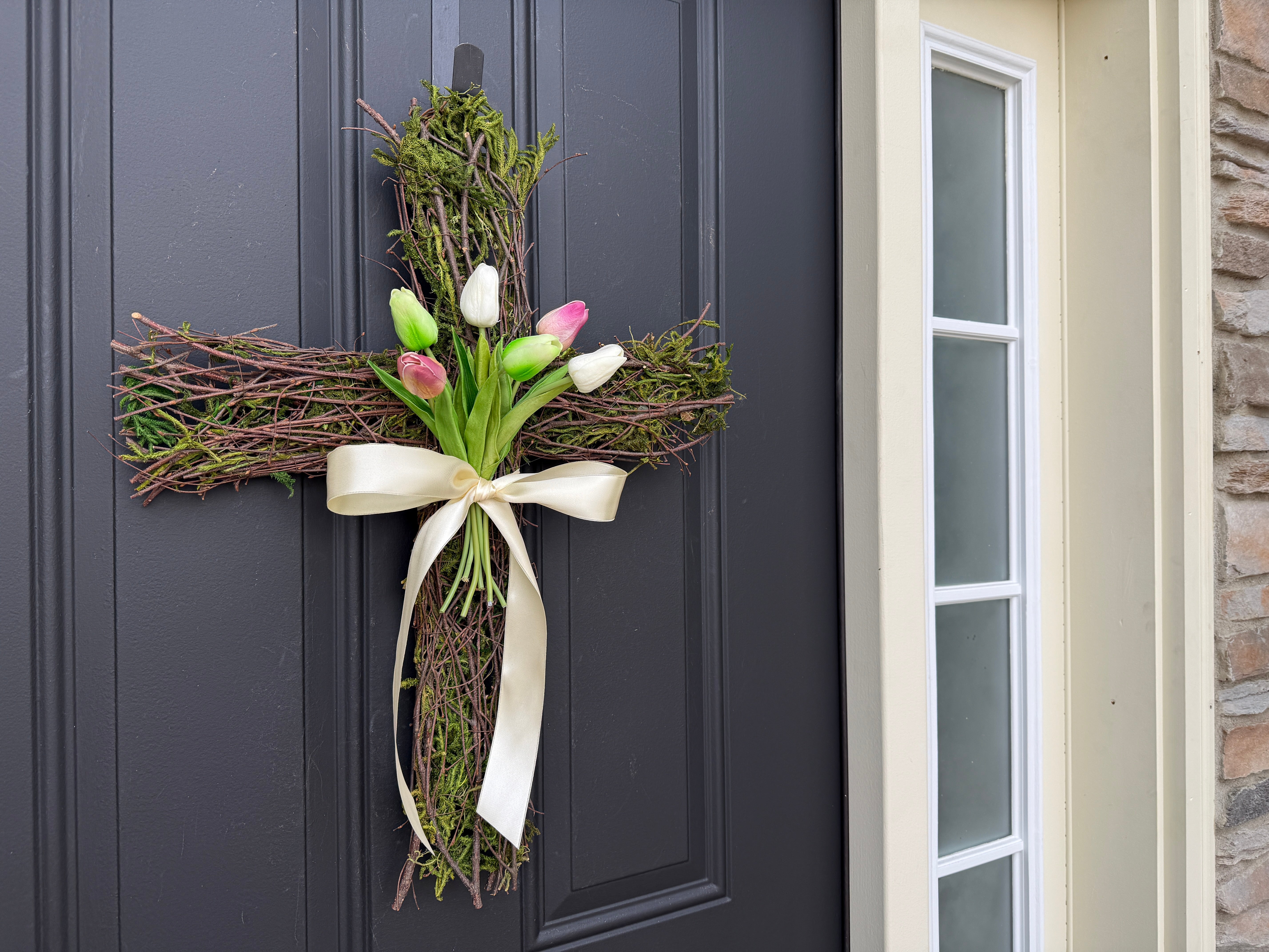 Purple & Cream Tulip Easter Cross – Natural Moss Cross Wreath