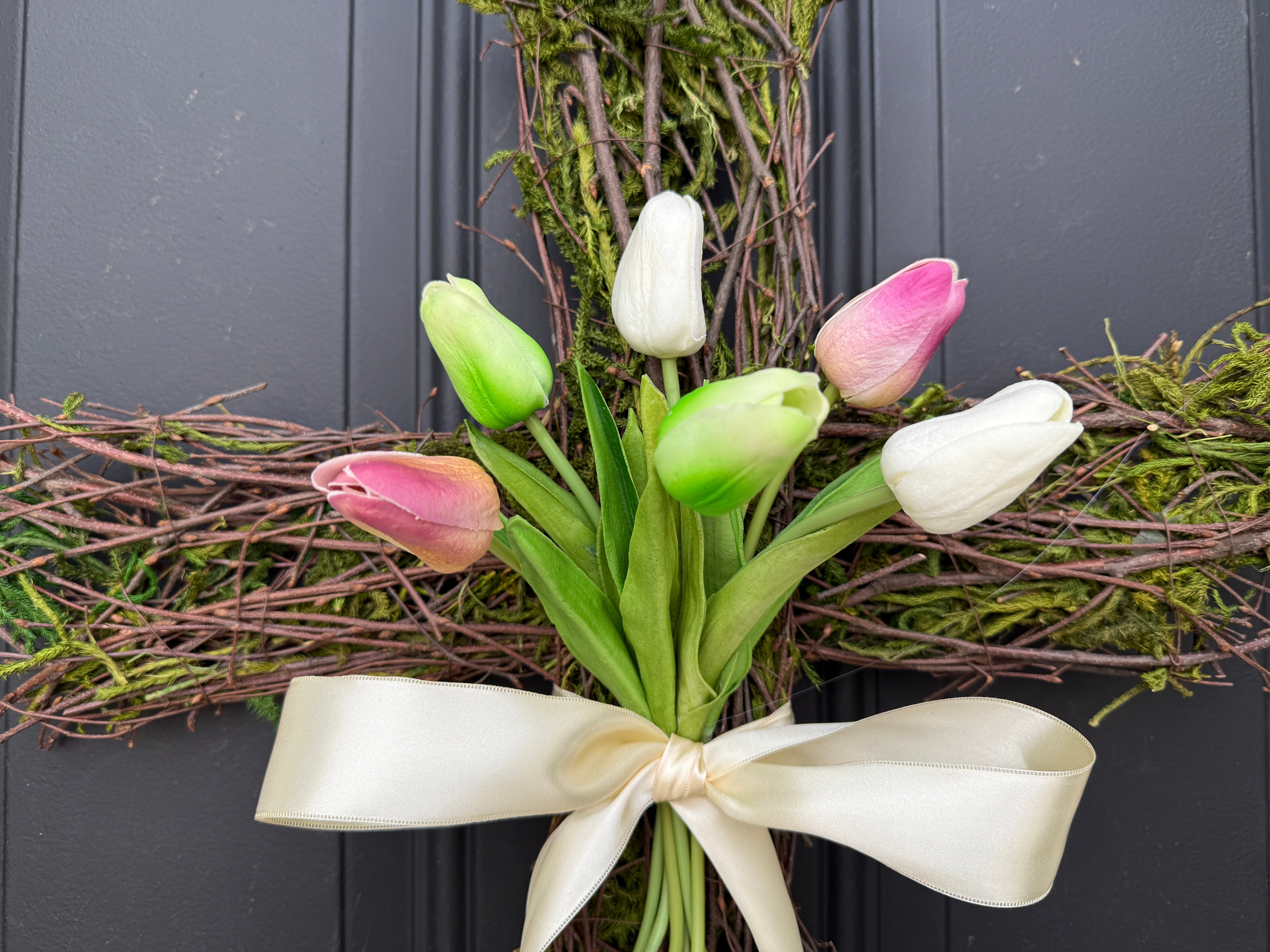 Celebrate the renewal of the season with this handcrafted Easter Natural Moss Cross. Featuring a natural twig cross wrapped in soft moss and adorned with six real-touch tulips in elegant purple, green, and cream tones, finished with a flowing silk ribbon, this elegant piece brings meaningful beauty to your Easter décor.