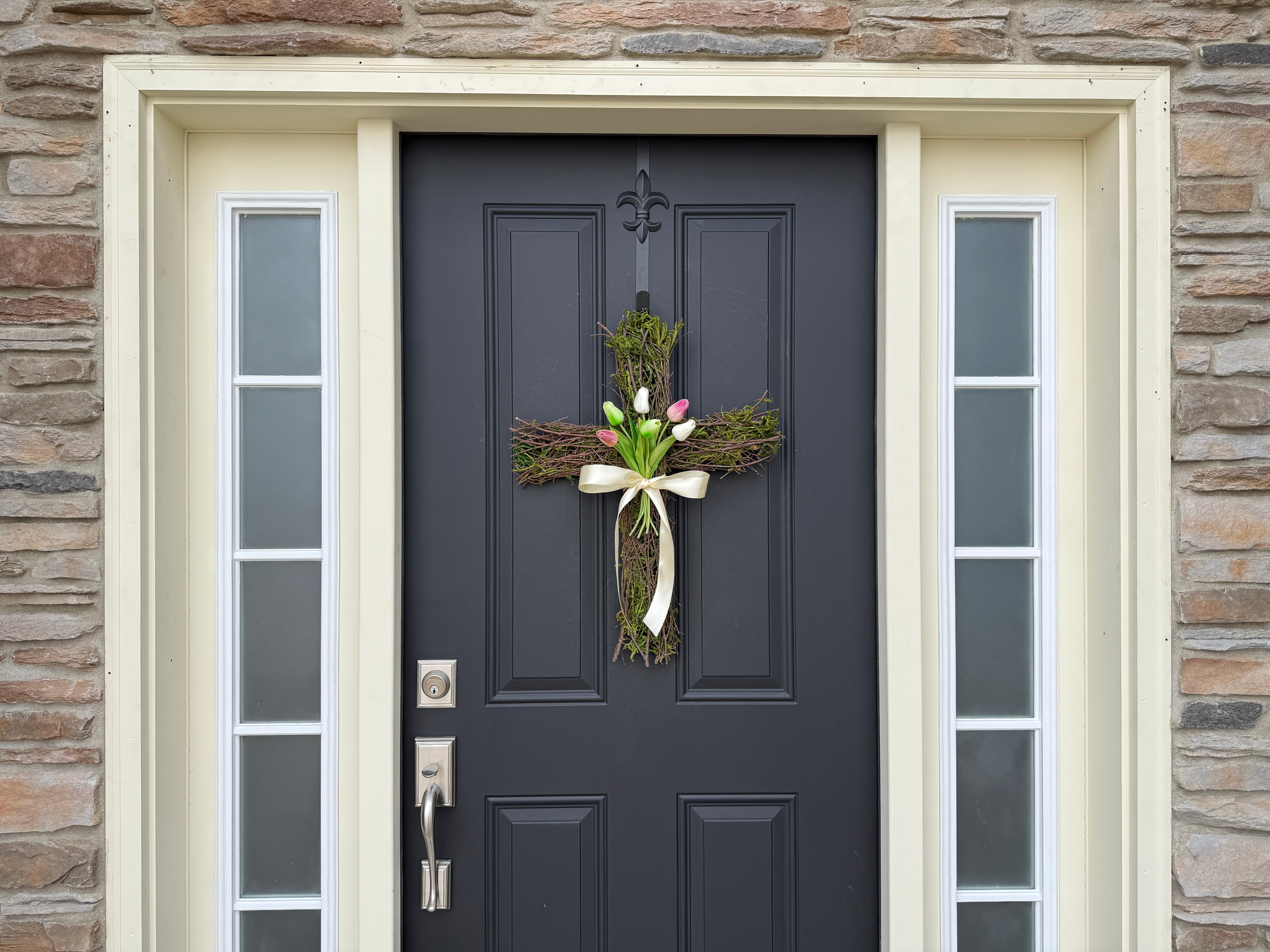 This handmade moss cross combines the timeless symbol of faith with the fresh beauty of spring tulips. The sophisticated purple, green, and cream blooms create a serene, elegant look that's perfect for honoring the Easter season or celebrating special occasions where you'd love to incorporate a touch of nature and the symbol of a cross.